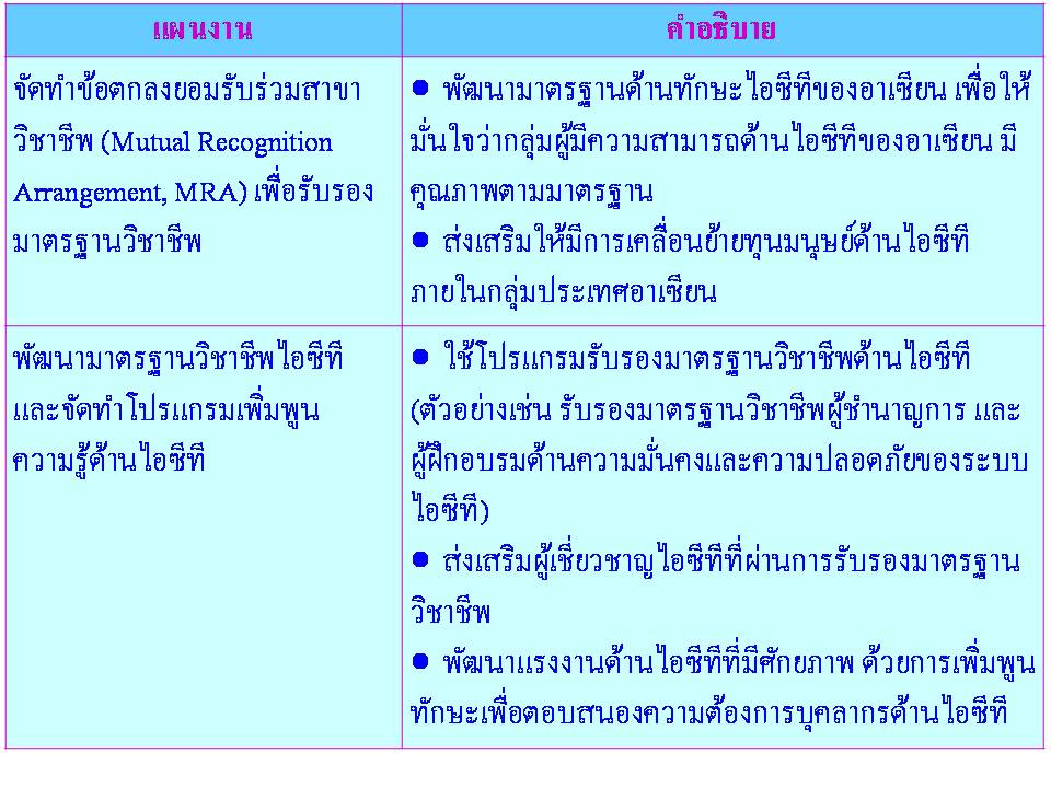 สำหรับมาตรการที่ช่วยในการพัฒนาทุนมนุษย์ตามแผนแม่บทไอซีทีอาเซียน 2015 แบ่งเป็น 2 มาตรการ คือ