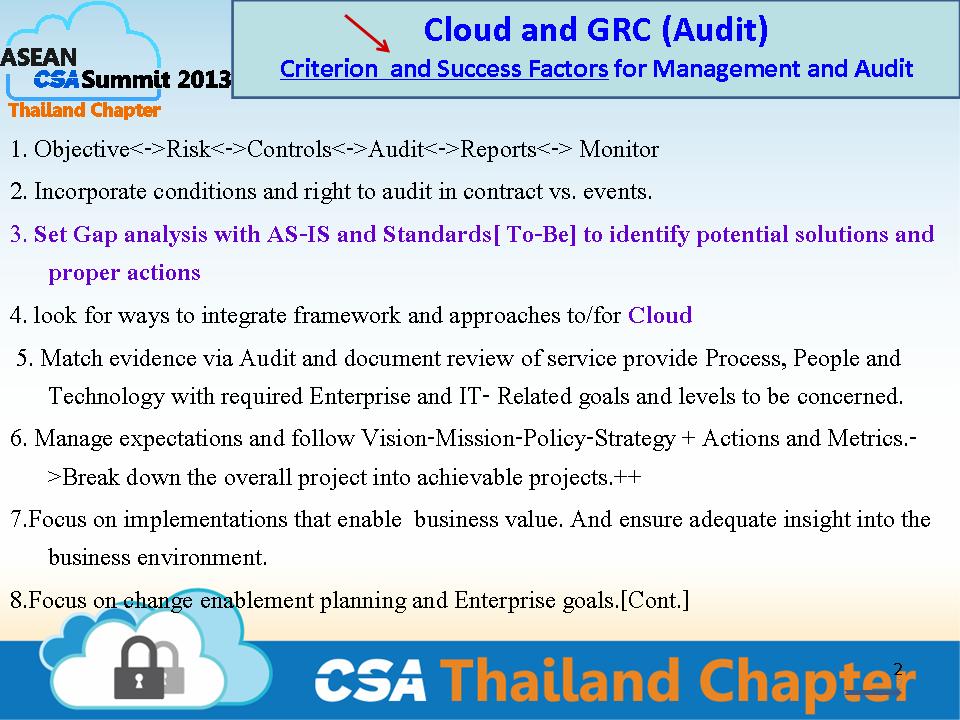 ความจริงข้อมูลข้างต้นผมได้ัจัดทำและนำเผยแพร่ตามที่ผมเข้าใจในกรอบของการจัดงาน ASEAN CSA Summit 2013 Bangkok Thailand ก่อนที่จะเข้ารับฟังและร่วมเป็น Panelists ในหัวข้อ Cloud Governance : Cloud and GRC (Audit) และหลังจากการมีส่วนร่วมในงานนี้แล้ว ผมก็ยังเข้าใจว่า ข้อมูลที่ได้เขียนไว้ก่อนหน้านี้ยังสามารถนำมาสื่อสารและสรุปตามที่กล่าวข้างต้นได้