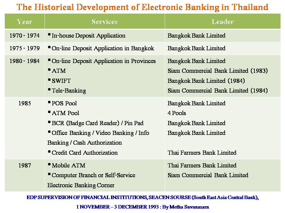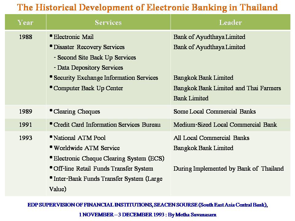 ตอนนี้มาถึงมาตรการของ ธปท. ในเบื้องต้นในช่วงที่ผมทำหน้าที่ดูแลด้านการกำกับและตรวจสอบทางด้าน IT ยุคนั้นเรียกว่า EDP – Electronic Data Processing เพื่อตามให้ทันกับความก้าวหน้าของการนำ EDP มาใช้ในยุคแรกของประเทศไทย