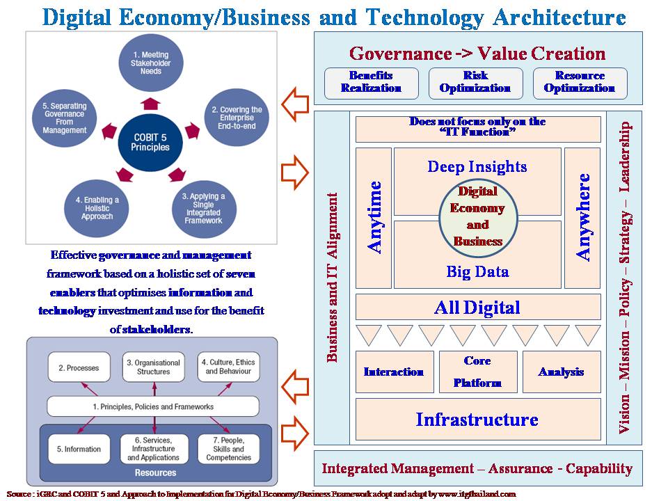 การเปลี่ยนแปลงเศรษฐกิจสู่ Digital Economy และแนวโน้มทางเทคโนโลยีที่พัฒนาก้าวหน้าอย่างรวดเร็วนั้น เป็นพลังอำนาจใหม่ของโลก ที่ประเทศไทยต้องก้าวตามไปให้ทัน และเมื่อถูกผลักดันจากนโยบายของรัฐ การพิจารณาความพร้อมของไทย เพื่อก้าวสู่การรองรับ Digital Economy เพื่อให้สัมพันธ์กับนโยบายเศรษฐกิจ Digital ของประเทศไทยและการขับเคลื่อนเศรษฐกิจภายใต้แนวโน้มใหม่ทางเทคโลโยยี่ ต้องอาศัยความเข้าใจในผลกระทบ ในมุมมองต่าง ๆ ของ Technology Trends และเป็นที่แน่นอนว่า ผู้ที่เกี่ยวข้องภาครัฐที่เป็นผู้ขับเคลื่อนและเป็นผู้กำหนดนโยบาย Digital Economy นั้น  ควรจะได้เข้าใจในภาคการกำกับดูแลกิจการที่ดีทางด้าน IT หรือ IT Governance ซึ่งในปัจจุบันได้พัฒนาก้าวไปสู่การหลอมรวมระหว่าง ITG – IT Governance กับ Corporate Governance เป็นหนึ่งเดียวที่เรียกกันว่า Governance of Enterprise IT ซึ่งเป็นกรอบการบริหารการจัดการที่ดียุคใหม่ที่นำเอาวิสัยทัศน์ พันธกิจ วัตถุประสงค์ นโยบาย กลยุทธ์ ทางด้านIT มาผสมผสานกับแนวทางการบริหารจัดการที่ดีทางธุรกิจทุกประเภท และทุกขนาด และเป็นส่วนหนึ่งในการขับเคลื่อน Digital Economy