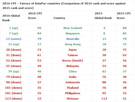 ดัชนีตัวชี้วัดใหม่ ตามที่กล่าวข้างต้นนั้น ได้ปรากฎใน Transparency International’s 2016 Corruption Perception Index ซึ่งเป็น CPI ของปี 2559 สำหรับประเทศในเอเซียแปซิฟิก ซึ่งผมได้ค้นคว้ามาจาก globalcompliancenews.com และนำมาเสนอเป็นแผนภาพดังนี้