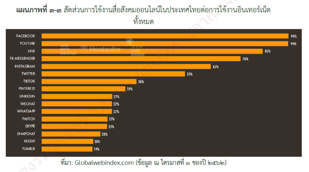 1.1 ประเทศไทยไม่มีการพัฒนาเทคโนโลยีและนวัตกรรมให้เป็นของตนเอง ต้องพึ่งพาแพลตฟอร์มจากต่างประเทศ ไม่มี Platform ที่ทำธุรกิจหารายได้เข้าประเทศ ลดการสูญเสียเงินตราให้กับ Platform ต่างประเทศ ทั้งนี้ จากการสำรวจสัดส่วนการใช้งานแพลตฟอร์มสื่อสังคมออนไลน์ในประเทศไทยต่อการใช้งานอินเทอร์เน็ตทั้งหมด ของ We Are Social และ Hootsuite เมื่อเดือนมกราคมปี 2563 พบว่า กว่าร้อยละ 94 ของผู้ใช้งานอินเทอร์เน็ตใช้งาน Facebook และ Youtube และแพลตฟอร์มใหม่ ๆ อย่าง Tiktok เริ่มมีสัดส่วนเพิ่มขึ้นอย่างรวดเร็ว แพลตฟอร์มทั้งหลายเหล่านี้ล้วนเป็นแพลตฟอร์มของต่างประเทศทั้งสิ้น (แผนภาพที่ 3-3)