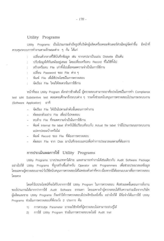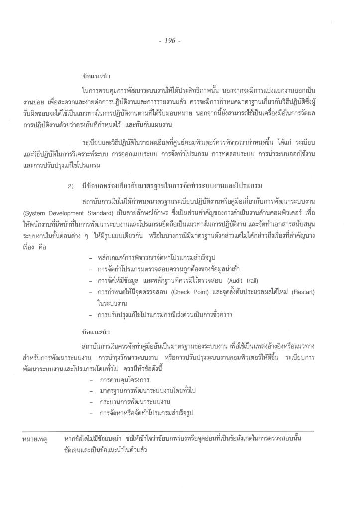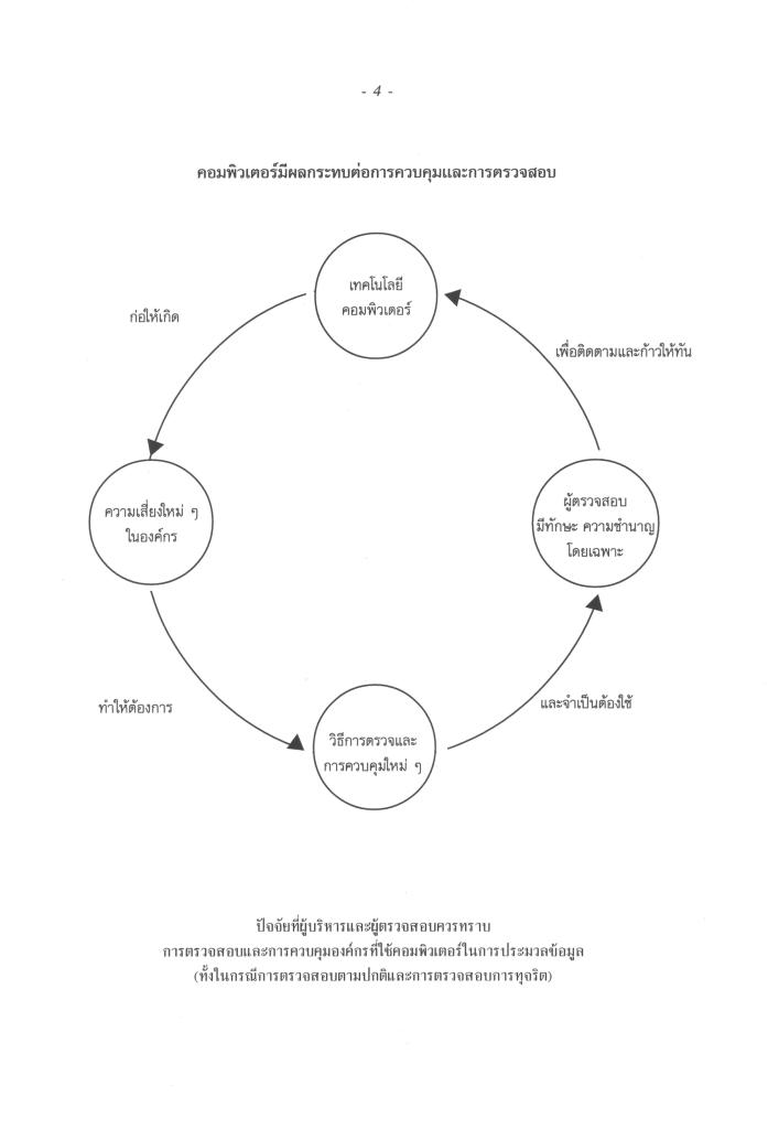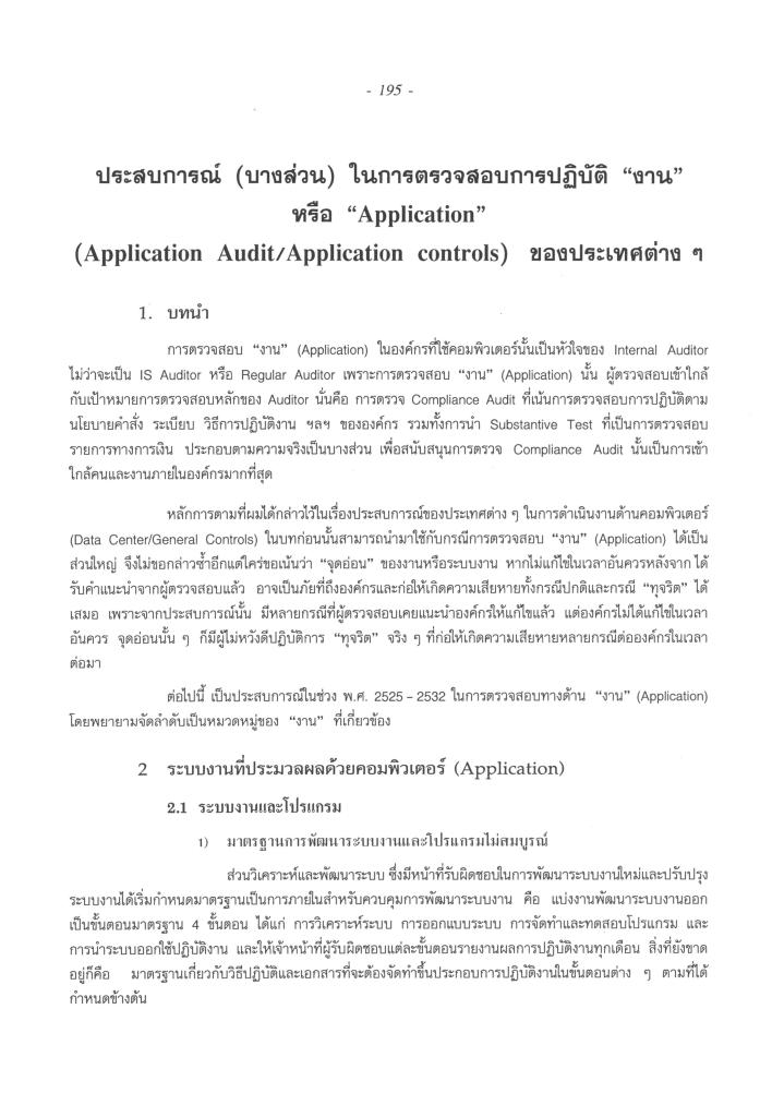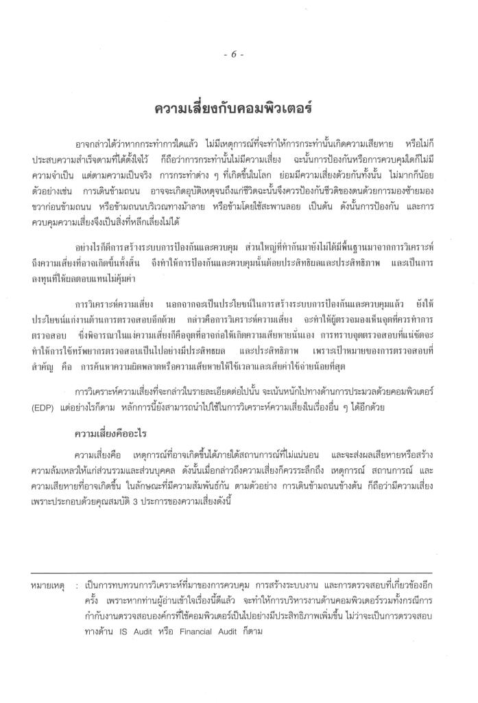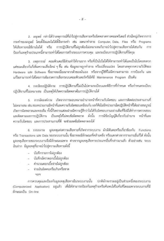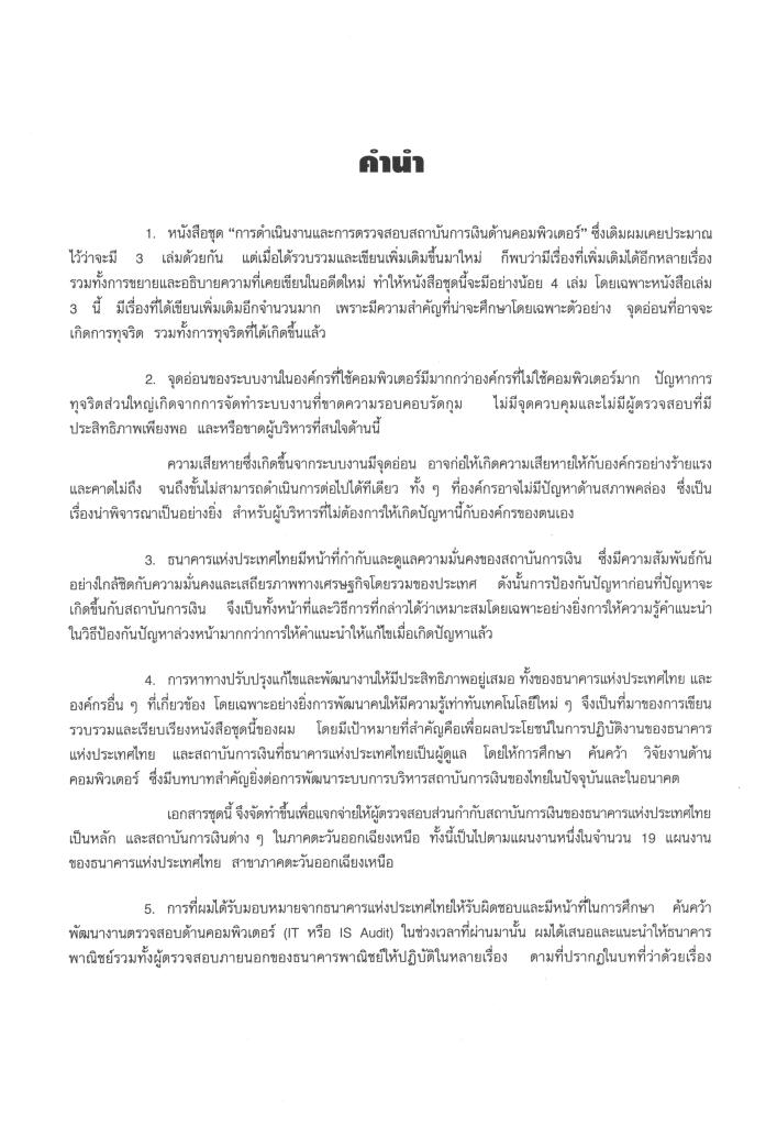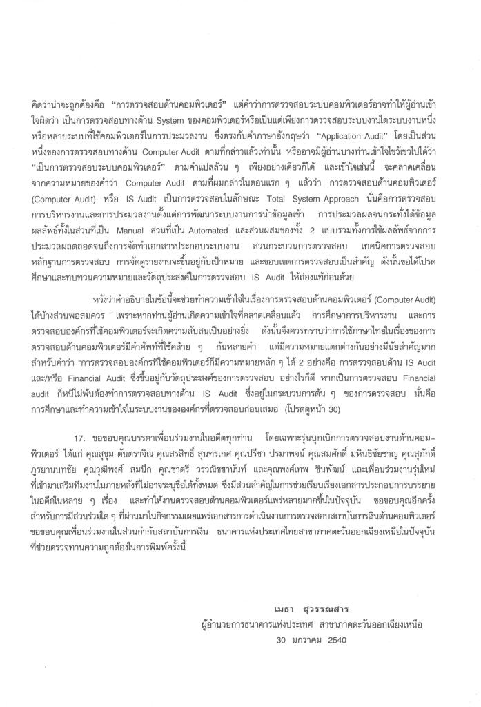 เอกสารชุดนี้ จึงจัดทําขึ้นเพื่อแจกจ่ายให้ผู้ตรวจสอบ ส่วนกํากับสถาบันการเงินของธนาคารแห่งประเทศไทยเป็นหลัก และสถาบันการเงินต่าง ๆ ในภาคตะวันออกเฉียงเหนือ ทั้งนี้เป็นไปตามแผนงานหนึ่งในจํานวน 19 แผนงาน ของธนาคารแห่งประเทศไทย สาขาภาคตะวันออกเฉียงเหนือ - การที่ผมได้รับมอบหมายจากธนาคารแห่งประเทศไทยให้รับผิดชอบและมีหน้าที่ในการศึกษา ค้นคว้า พัฒนางานตรวจสอบด้านคอมพิวเตอร์ (IT หรือ IS Audit) ในช่วงเวลาที่ผ่านมานั้น ผมได้เสนอและแนะนําให้ธนาคาร พาณิชย์ รวมทั้งผู้ตรวจสอบภายนอกของธนาคารพาณิชย์ให้ปฏิบัติในหลายเรื่อง ตามที่ปรากฏในบทที่ว่าด้วยเรื่อง “บทบาทของธนาคารแห่งประเทศไทยกับคอมพิวเตอร์” และ “Role of the bank of Thailand in Banking Computerization” นั้น ทําให้ผมต้องวางมือจากการเป็นผู้สอบบัญชีรับอนุญาตในทุกองค์กร ตั้งแต่ปี พ.ศ. 2524 จนกระทั่งปัจจุบัน (มกราคม 2540) และเข้าใจว่าจะวางมือจากการดําเนินการเป็นผู้สอบบัญชีรับอนุญาตจนกว่าจะออกจากธนาคารแห่งประเทศไทย ทั้งนี้เพราะการออกกฎเกณฑ์บางอย่างกระทบต่อบทบาท ความรู้ ความสามารถ และการเป็นผู้มีคุณสมบัติในการเป็นผู้สอบบัญชีของธนาคารและสถาบันการเงินนั่นเอง ดังนั้นเพื่อความโปร่งใส……ในเรื่องนี้ ผมจึงต้องทําตัวเป็นกลางดังกล่าว