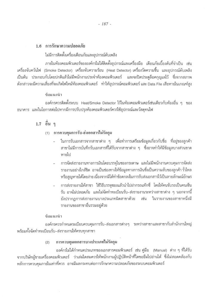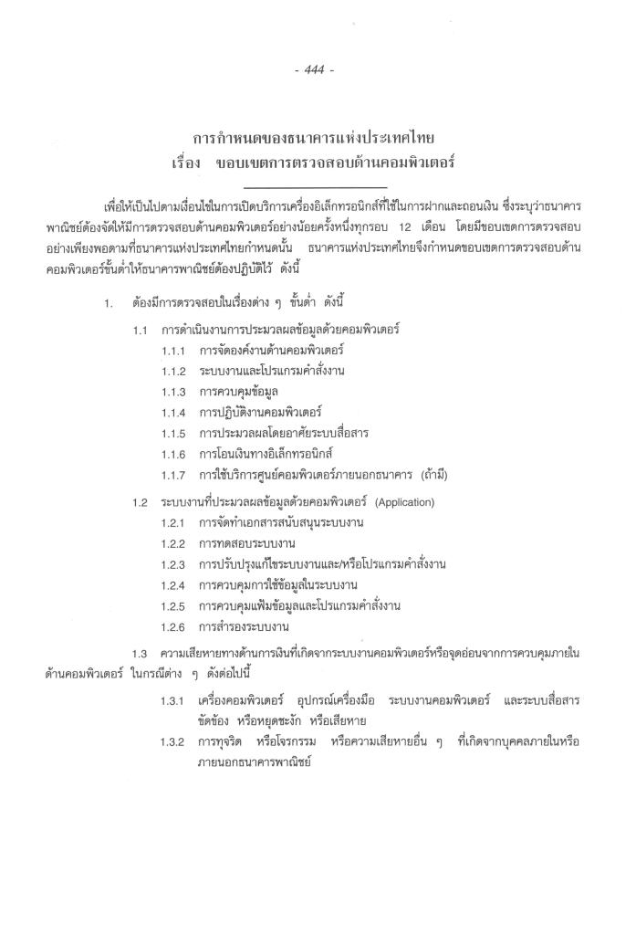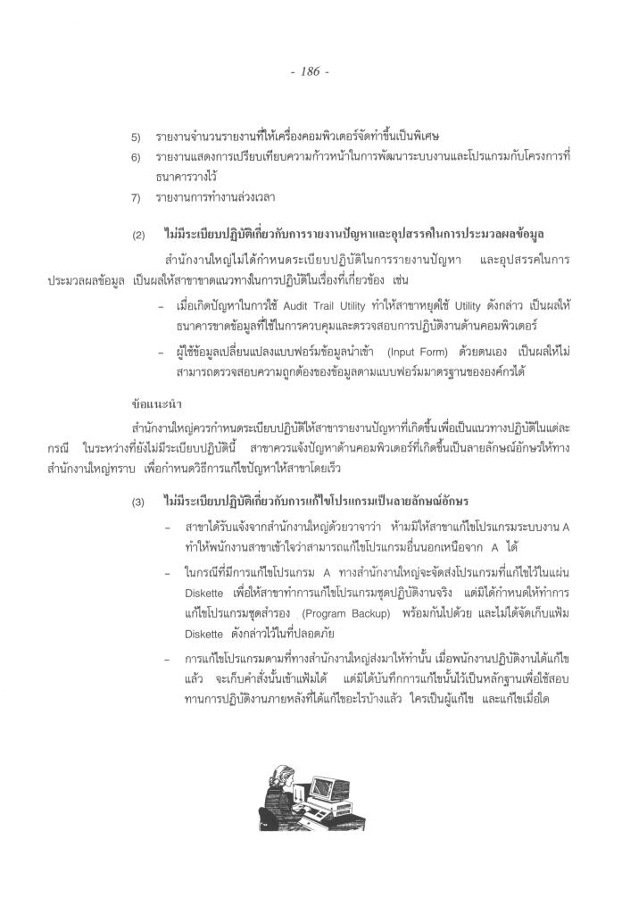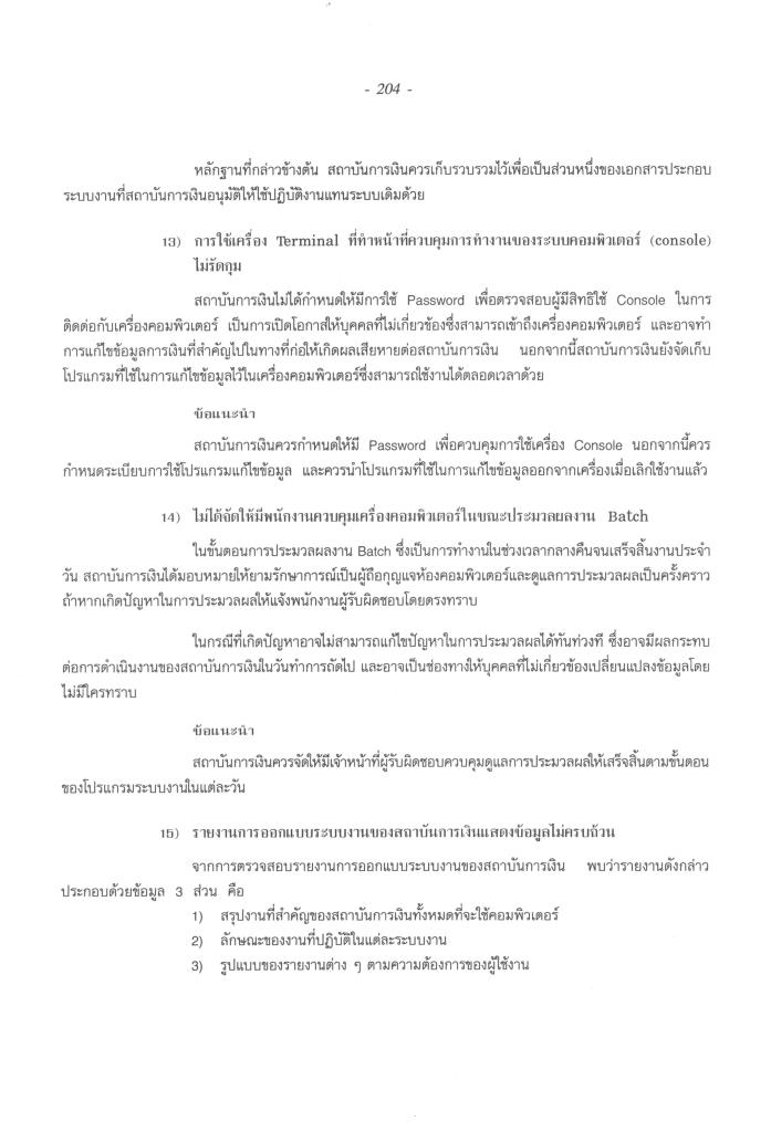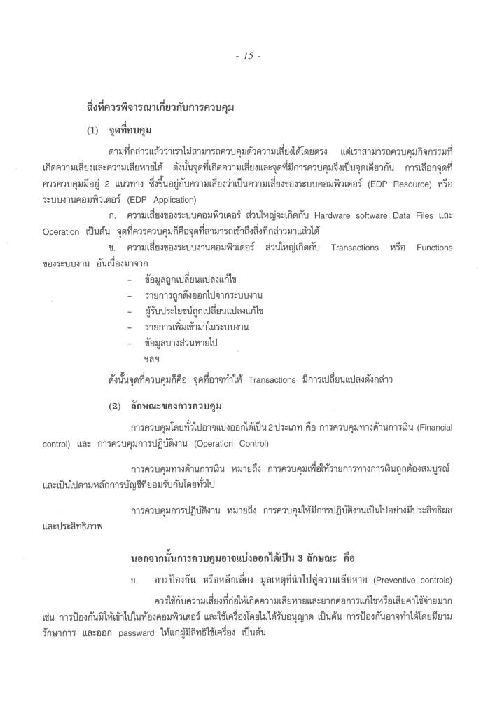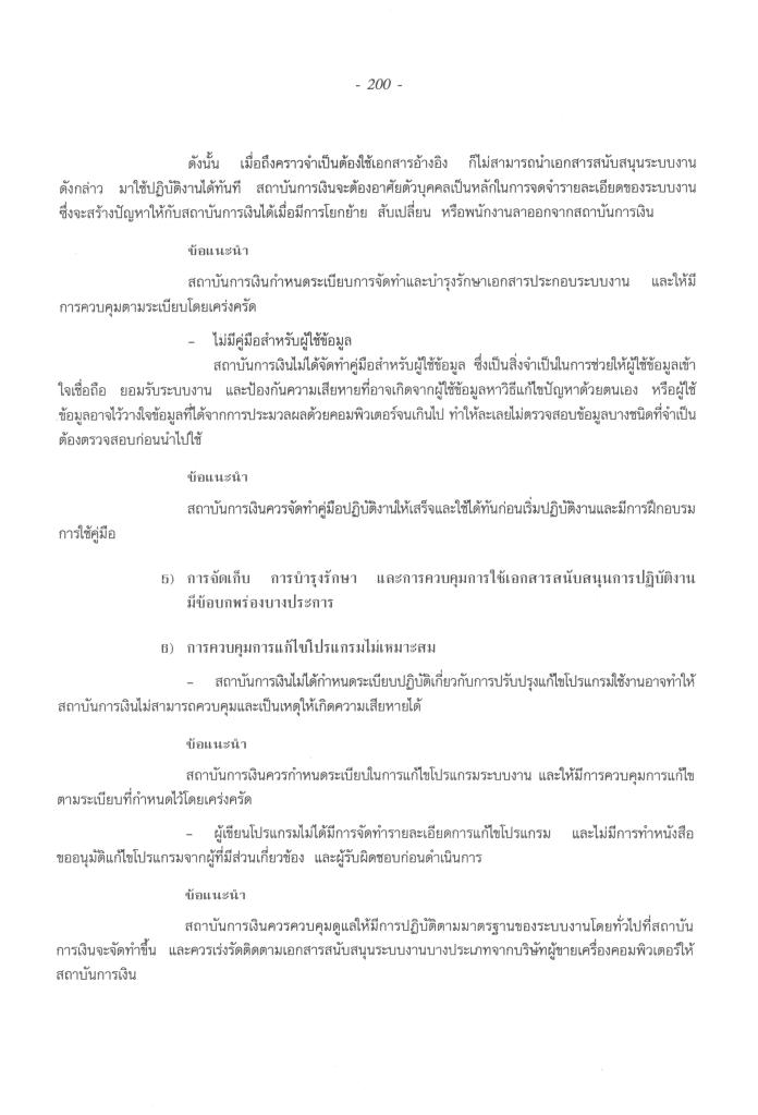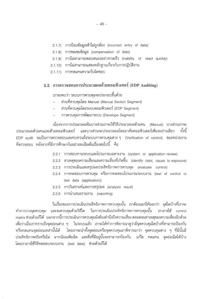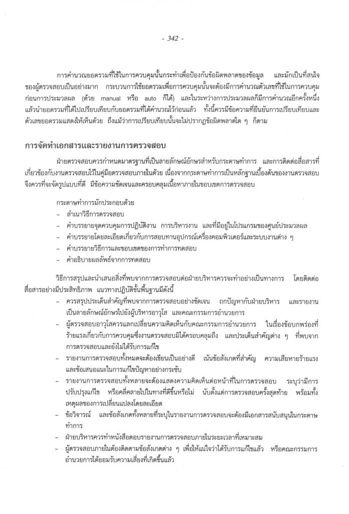 เอกสารชุดนี้ จึงจัดทําขึ้นเพื่อแจกจ่ายให้ผู้ตรวจสอบ ส่วนกํากับสถาบันการเงินของธนาคารแห่งประเทศไทยเป็นหลัก และสถาบันการเงินต่าง ๆ ในภาคตะวันออกเฉียงเหนือ ทั้งนี้เป็นไปตามแผนงานหนึ่งในจํานวน 19 แผนงาน ของธนาคารแห่งประเทศไทย สาขาภาคตะวันออกเฉียงเหนือ - การที่ผมได้รับมอบหมายจากธนาคารแห่งประเทศไทยให้รับผิดชอบและมีหน้าที่ในการศึกษา ค้นคว้า พัฒนางานตรวจสอบด้านคอมพิวเตอร์ (IT หรือ IS Audit) ในช่วงเวลาที่ผ่านมานั้น ผมได้เสนอและแนะนําให้ธนาคาร พาณิชย์ รวมทั้งผู้ตรวจสอบภายนอกของธนาคารพาณิชย์ให้ปฏิบัติในหลายเรื่อง ตามที่ปรากฏในบทที่ว่าด้วยเรื่อง “บทบาทของธนาคารแห่งประเทศไทยกับคอมพิวเตอร์” และ “Role of the bank of Thailand in Banking Computerization” นั้น ทําให้ผมต้องวางมือจากการเป็นผู้สอบบัญชีรับอนุญาตในทุกองค์กร ตั้งแต่ปี พ.ศ. 2524 จนกระทั่งปัจจุบัน (มกราคม 2540) และเข้าใจว่าจะวางมือจากการดําเนินการเป็นผู้สอบบัญชีรับอนุญาตจนกว่าจะออกจากธนาคารแห่งประเทศไทย ทั้งนี้เพราะการออกกฎเกณฑ์บางอย่างกระทบต่อบทบาท ความรู้ ความสามารถ และการเป็นผู้มีคุณสมบัติในการเป็นผู้สอบบัญชีของธนาคารและสถาบันการเงินนั่นเอง ดังนั้นเพื่อความโปร่งใส……ในเรื่องนี้ ผมจึงต้องทําตัวเป็นกลางดังกล่าว