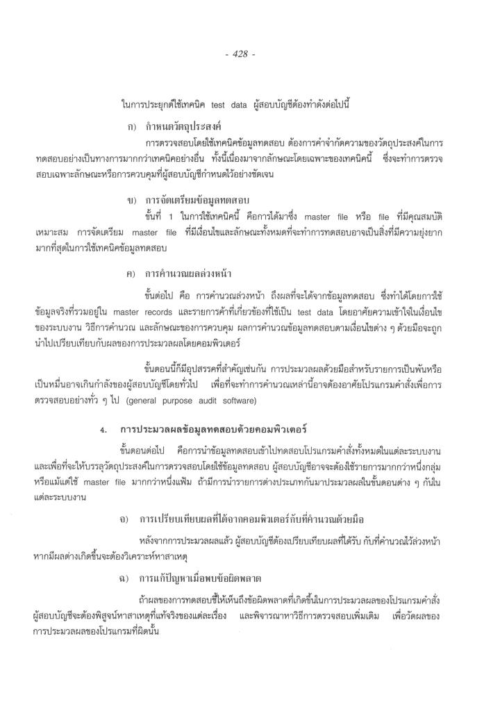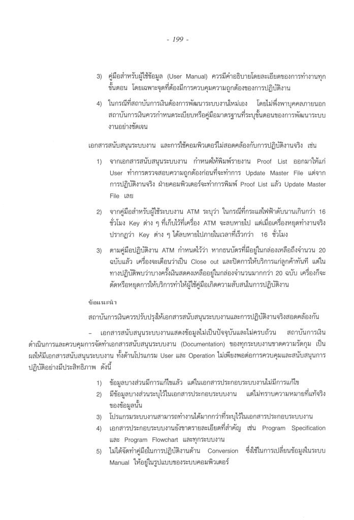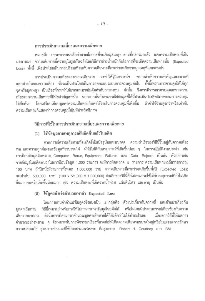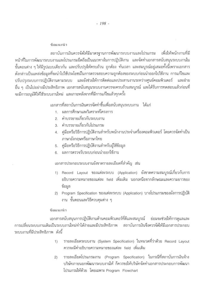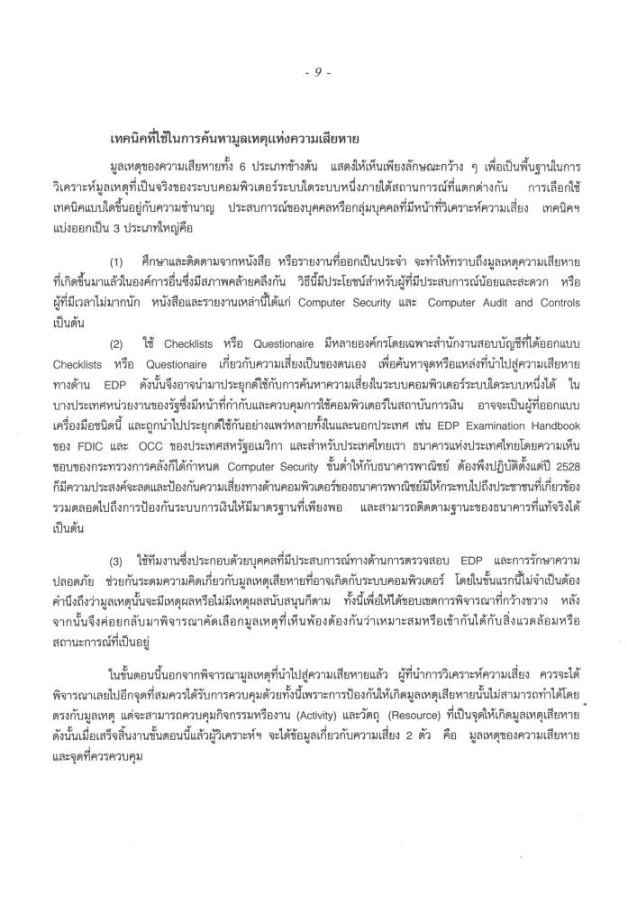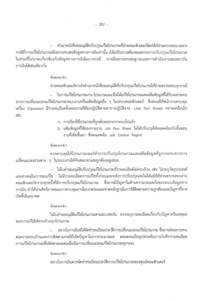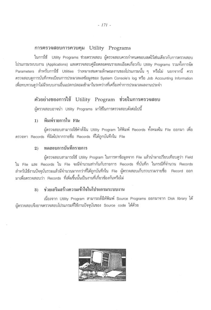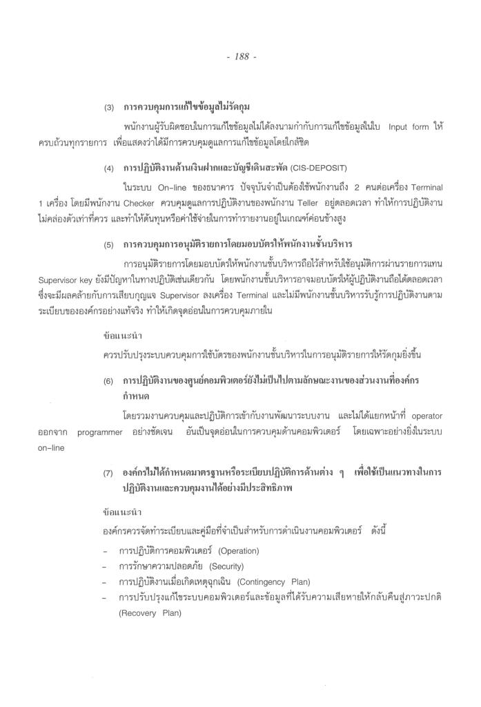 เอกสารชุดนี้ จึงจัดทําขึ้นเพื่อแจกจ่ายให้ผู้ตรวจสอบ ส่วนกํากับสถาบันการเงินของธนาคารแห่งประเทศไทยเป็นหลัก และสถาบันการเงินต่าง ๆ ในภาคตะวันออกเฉียงเหนือ ทั้งนี้เป็นไปตามแผนงานหนึ่งในจํานวน 19 แผนงาน ของธนาคารแห่งประเทศไทย สาขาภาคตะวันออกเฉียงเหนือ - การที่ผมได้รับมอบหมายจากธนาคารแห่งประเทศไทยให้รับผิดชอบและมีหน้าที่ในการศึกษา ค้นคว้า พัฒนางานตรวจสอบด้านคอมพิวเตอร์ (IT หรือ IS Audit) ในช่วงเวลาที่ผ่านมานั้น ผมได้เสนอและแนะนําให้ธนาคาร พาณิชย์ รวมทั้งผู้ตรวจสอบภายนอกของธนาคารพาณิชย์ให้ปฏิบัติในหลายเรื่อง ตามที่ปรากฏในบทที่ว่าด้วยเรื่อง “บทบาทของธนาคารแห่งประเทศไทยกับคอมพิวเตอร์” และ “Role of the bank of Thailand in Banking Computerization” นั้น ทําให้ผมต้องวางมือจากการเป็นผู้สอบบัญชีรับอนุญาตในทุกองค์กร ตั้งแต่ปี พ.ศ. 2524 จนกระทั่งปัจจุบัน (มกราคม 2540) และเข้าใจว่าจะวางมือจากการดําเนินการเป็นผู้สอบบัญชีรับอนุญาตจนกว่าจะออกจากธนาคารแห่งประเทศไทย ทั้งนี้เพราะการออกกฎเกณฑ์บางอย่างกระทบต่อบทบาท ความรู้ ความสามารถ และการเป็นผู้มีคุณสมบัติในการเป็นผู้สอบบัญชีของธนาคารและสถาบันการเงินนั่นเอง ดังนั้นเพื่อความโปร่งใส……ในเรื่องนี้ ผมจึงต้องทําตัวเป็นกลางดังกล่าว