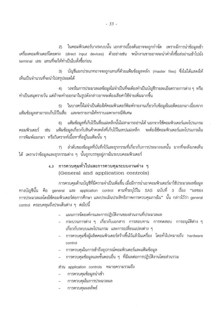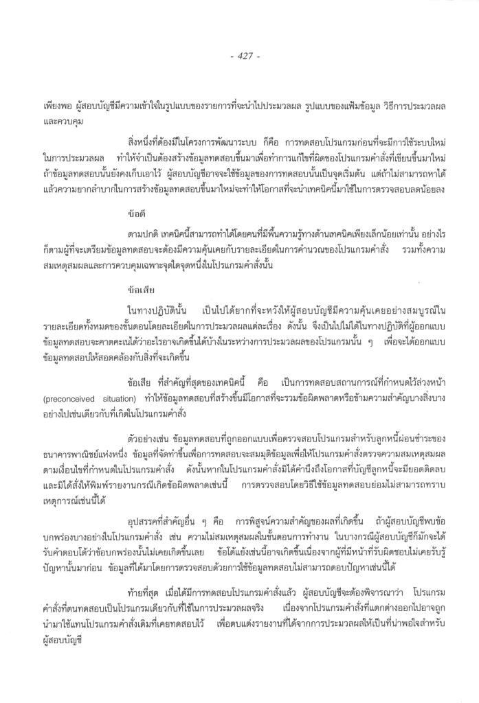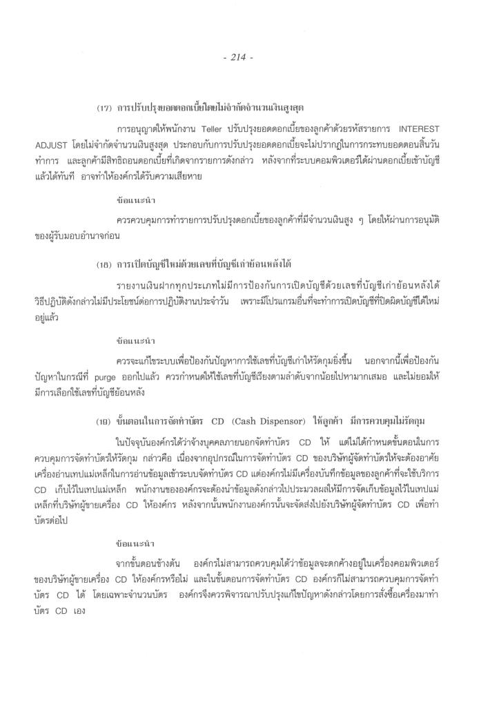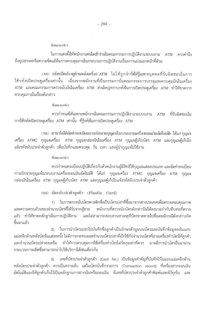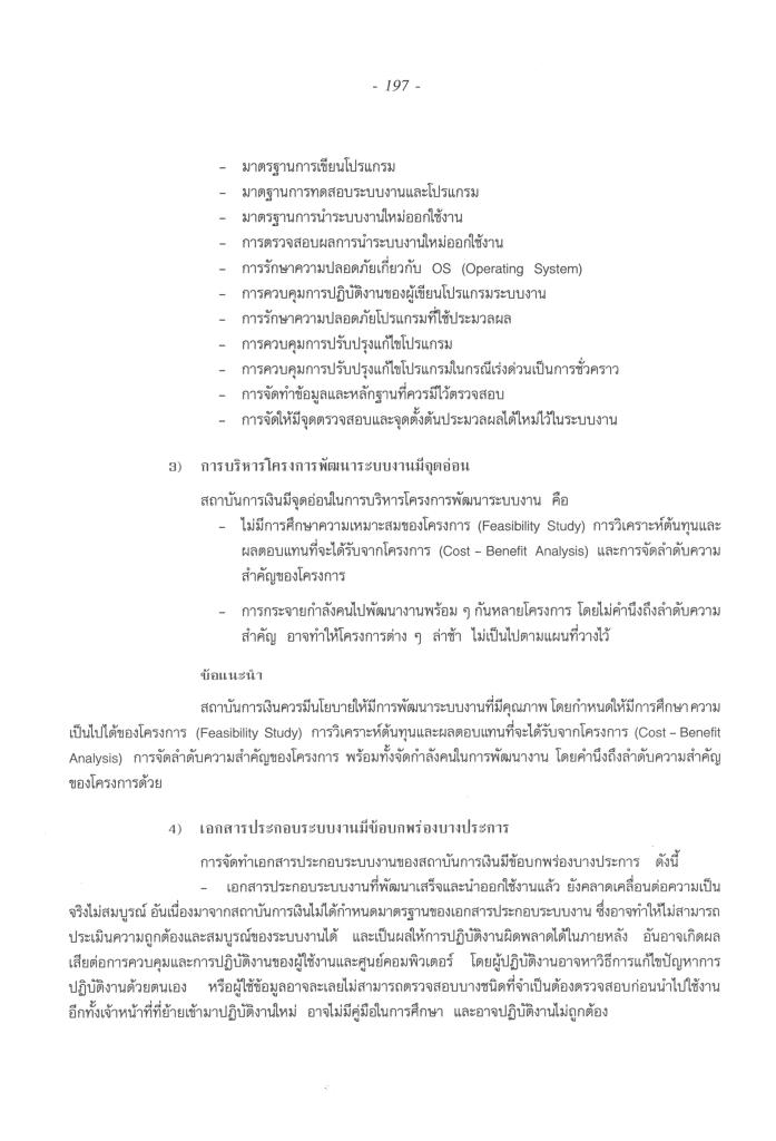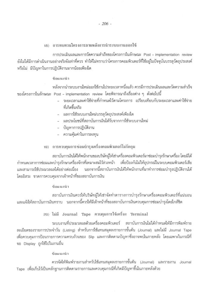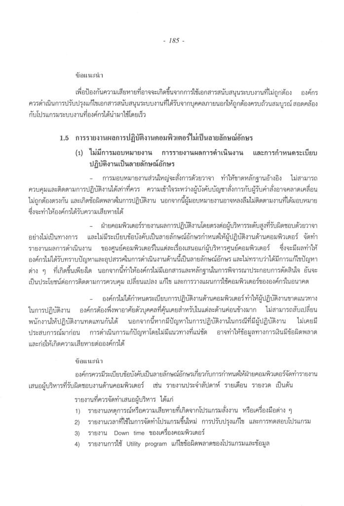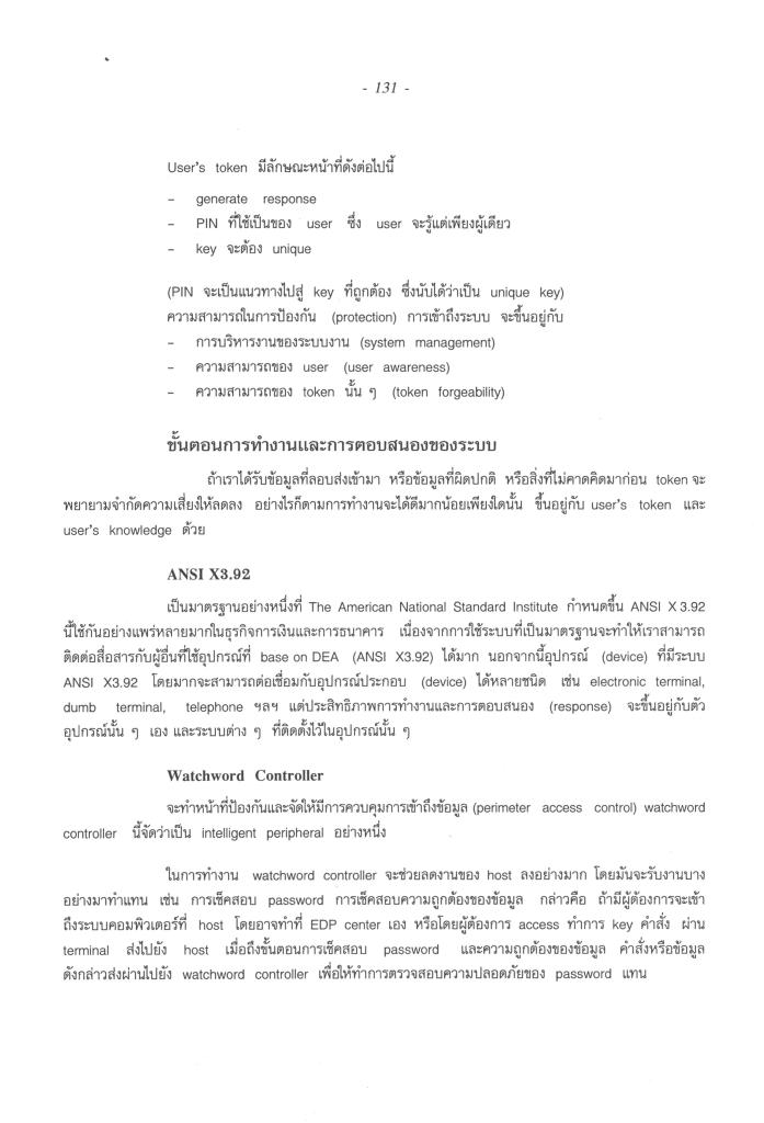เอกสารชุดนี้ จึงจัดทําขึ้นเพื่อแจกจ่ายให้ผู้ตรวจสอบ ส่วนกํากับสถาบันการเงินของธนาคารแห่งประเทศไทยเป็นหลัก และสถาบันการเงินต่าง ๆ ในภาคตะวันออกเฉียงเหนือ ทั้งนี้เป็นไปตามแผนงานหนึ่งในจํานวน 19 แผนงาน ของธนาคารแห่งประเทศไทย สาขาภาคตะวันออกเฉียงเหนือ - การที่ผมได้รับมอบหมายจากธนาคารแห่งประเทศไทยให้รับผิดชอบและมีหน้าที่ในการศึกษา ค้นคว้า พัฒนางานตรวจสอบด้านคอมพิวเตอร์ (IT หรือ IS Audit) ในช่วงเวลาที่ผ่านมานั้น ผมได้เสนอและแนะนําให้ธนาคาร พาณิชย์ รวมทั้งผู้ตรวจสอบภายนอกของธนาคารพาณิชย์ให้ปฏิบัติในหลายเรื่อง ตามที่ปรากฏในบทที่ว่าด้วยเรื่อง “บทบาทของธนาคารแห่งประเทศไทยกับคอมพิวเตอร์” และ “Role of the bank of Thailand in Banking Computerization” นั้น ทําให้ผมต้องวางมือจากการเป็นผู้สอบบัญชีรับอนุญาตในทุกองค์กร ตั้งแต่ปี พ.ศ. 2524 จนกระทั่งปัจจุบัน (มกราคม 2540) และเข้าใจว่าจะวางมือจากการดําเนินการเป็นผู้สอบบัญชีรับอนุญาตจนกว่าจะออกจากธนาคารแห่งประเทศไทย ทั้งนี้เพราะการออกกฎเกณฑ์บางอย่างกระทบต่อบทบาท ความรู้ ความสามารถ และการเป็นผู้มีคุณสมบัติในการเป็นผู้สอบบัญชีของธนาคารและสถาบันการเงินนั่นเอง ดังนั้นเพื่อความโปร่งใส……ในเรื่องนี้ ผมจึงต้องทําตัวเป็นกลางดังกล่าว