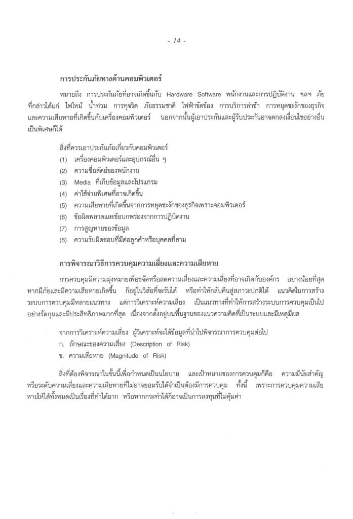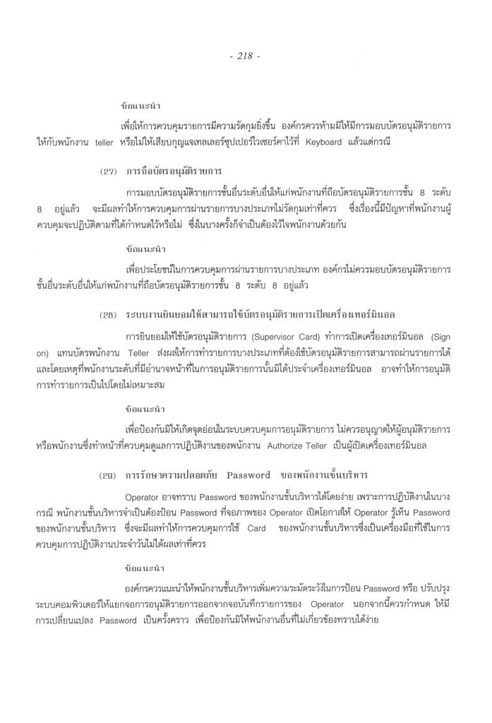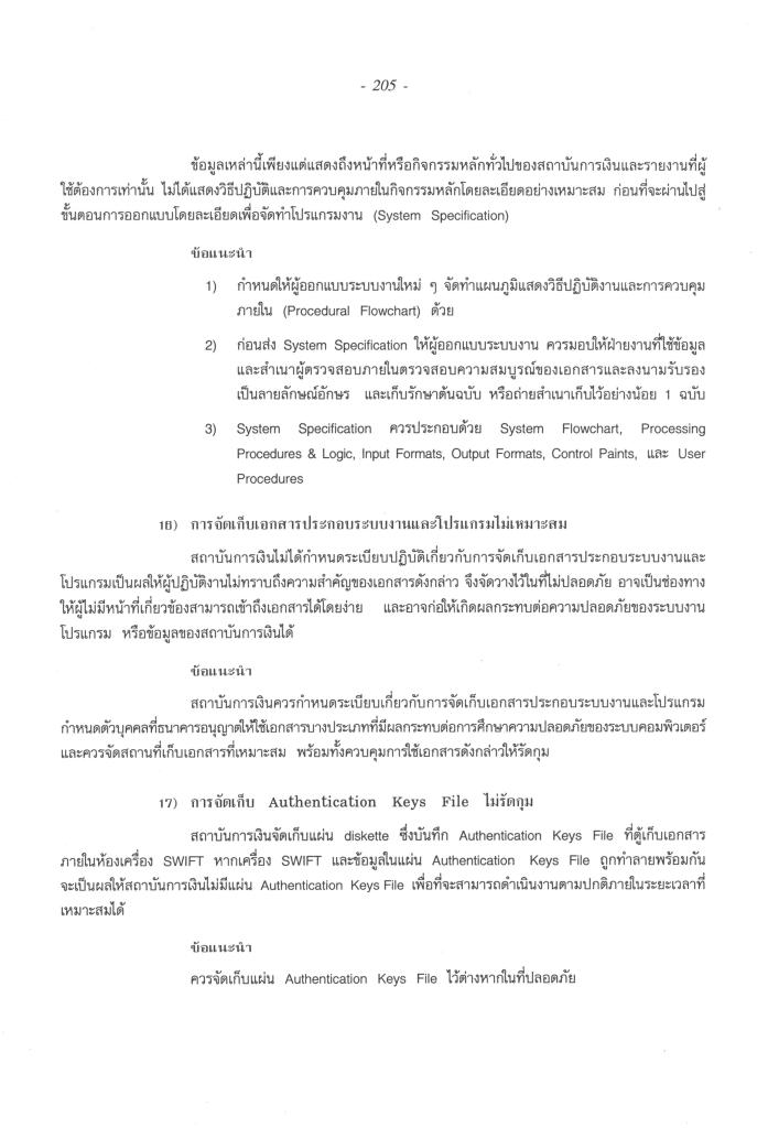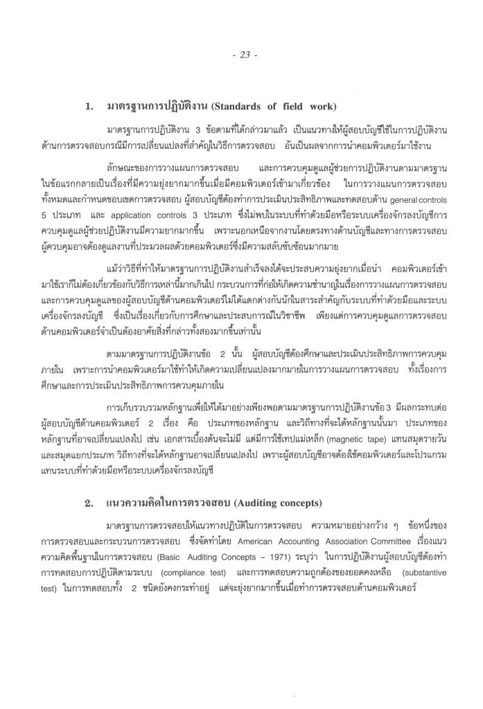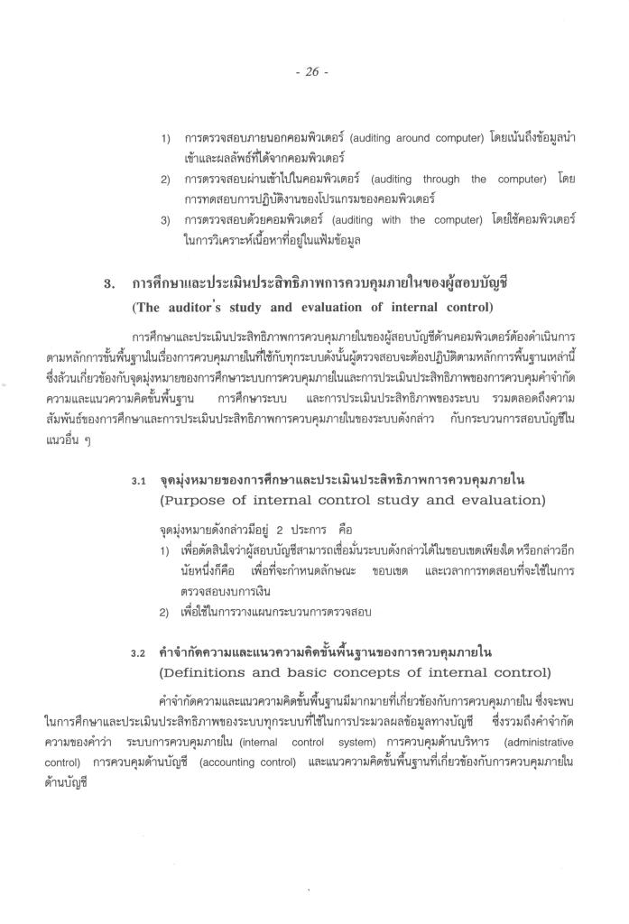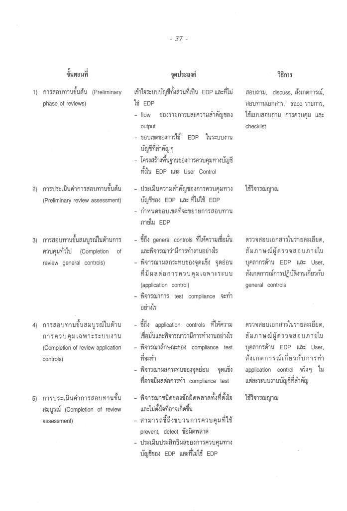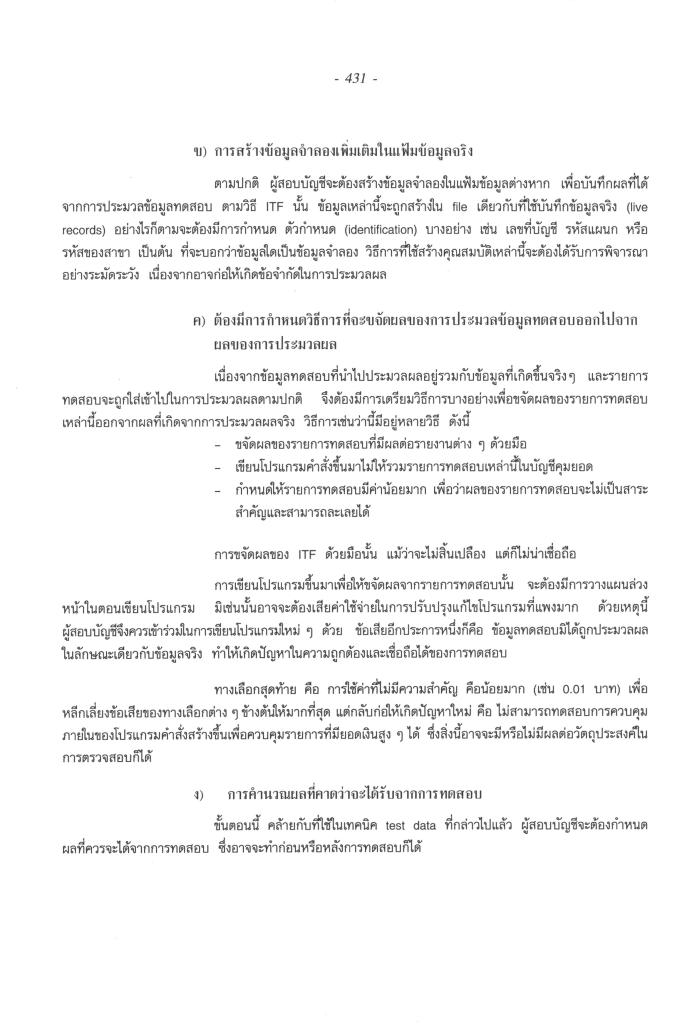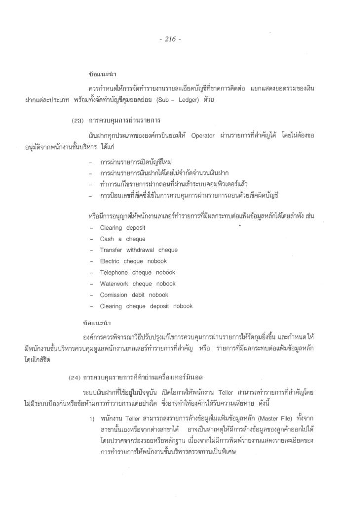 เอกสารชุดนี้ จึงจัดทําขึ้นเพื่อแจกจ่ายให้ผู้ตรวจสอบ ส่วนกํากับสถาบันการเงินของธนาคารแห่งประเทศไทยเป็นหลัก และสถาบันการเงินต่าง ๆ ในภาคตะวันออกเฉียงเหนือ ทั้งนี้เป็นไปตามแผนงานหนึ่งในจํานวน 19 แผนงาน ของธนาคารแห่งประเทศไทย สาขาภาคตะวันออกเฉียงเหนือ - การที่ผมได้รับมอบหมายจากธนาคารแห่งประเทศไทยให้รับผิดชอบและมีหน้าที่ในการศึกษา ค้นคว้า พัฒนางานตรวจสอบด้านคอมพิวเตอร์ (IT หรือ IS Audit) ในช่วงเวลาที่ผ่านมานั้น ผมได้เสนอและแนะนําให้ธนาคาร พาณิชย์ รวมทั้งผู้ตรวจสอบภายนอกของธนาคารพาณิชย์ให้ปฏิบัติในหลายเรื่อง ตามที่ปรากฏในบทที่ว่าด้วยเรื่อง “บทบาทของธนาคารแห่งประเทศไทยกับคอมพิวเตอร์” และ “Role of the bank of Thailand in Banking Computerization” นั้น ทําให้ผมต้องวางมือจากการเป็นผู้สอบบัญชีรับอนุญาตในทุกองค์กร ตั้งแต่ปี พ.ศ. 2524 จนกระทั่งปัจจุบัน (มกราคม 2540) และเข้าใจว่าจะวางมือจากการดําเนินการเป็นผู้สอบบัญชีรับอนุญาตจนกว่าจะออกจากธนาคารแห่งประเทศไทย ทั้งนี้เพราะการออกกฎเกณฑ์บางอย่างกระทบต่อบทบาท ความรู้ ความสามารถ และการเป็นผู้มีคุณสมบัติในการเป็นผู้สอบบัญชีของธนาคารและสถาบันการเงินนั่นเอง ดังนั้นเพื่อความโปร่งใส……ในเรื่องนี้ ผมจึงต้องทําตัวเป็นกลางดังกล่าว