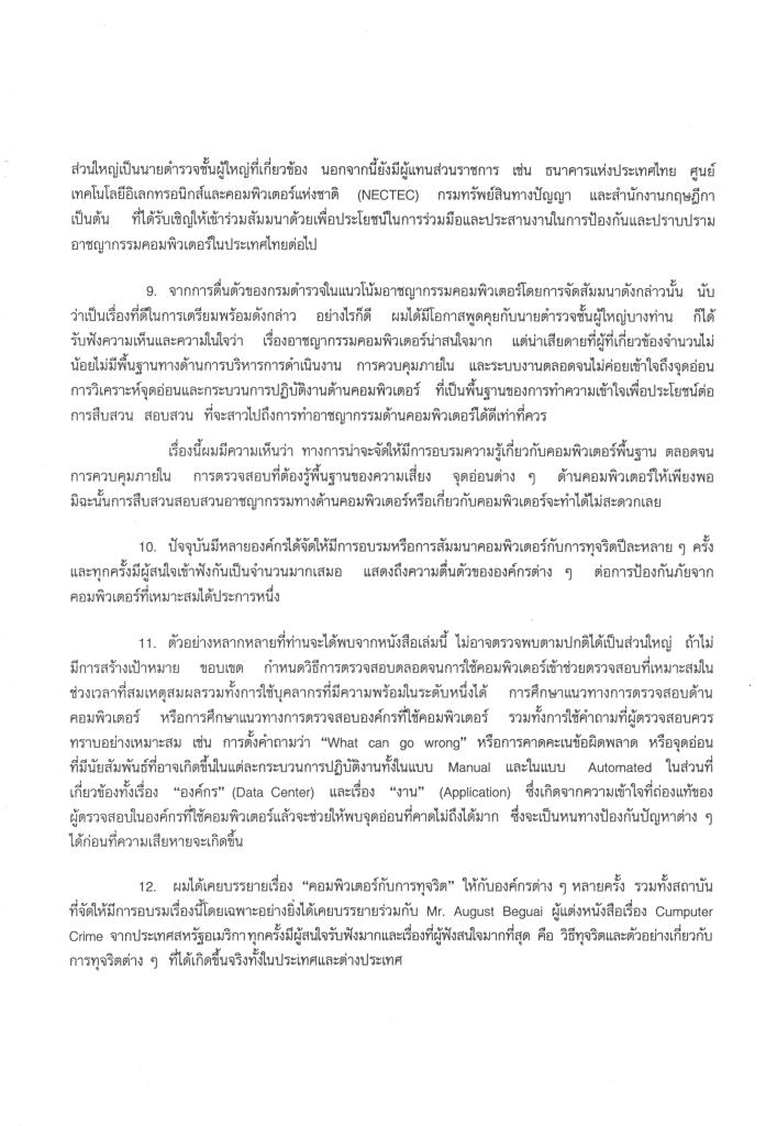 เรื่องนี้ผมมีความเห็นว่า ทางการน่าจะจัดให้มีการอบรมความรู้เกี่ยวกับคอมพิวเตอร์พื้นฐาน ตลอดจนการควบคุมภายใน การตรวจสอบที่ต้องรู้พื้นฐานของความเสี่ยง จุดอ่อนต่าง ๆ ด้านคอมพิวเตอร์ให้เพียงพอ มิฉะนั้นการสืบสวนสอบสวนอาชญากรรมทางด้านคอมพิวเตอร์ หรือเกี่ยวกับคอมพิวเตอร์จะทําได้ไม่สะดวกเลย - ปัจจุบันมีหลายองค์กรได้จัดให้มีการอบรม หรือการสัมมนาคอมพิวเตอร์กับการทุจริตปีละหลาย ๆ ครั้ง และทุกครั้งมีผู้สนใจเข้าฟังกันเป็นจํานวนมากเสมอ แสดงถึงความตื่นตัวขององค์กรต่าง ๆ ต่อการป้องกันภัยจากคอมพิวเตอร์ที่เหมาะสมได้ประการหนึ่ง