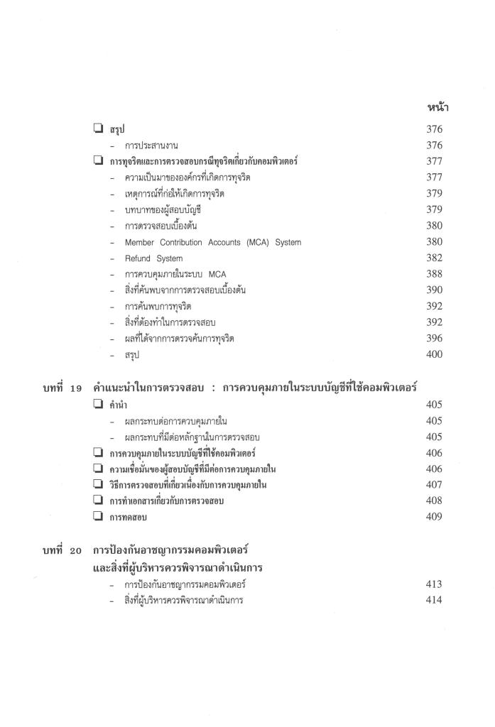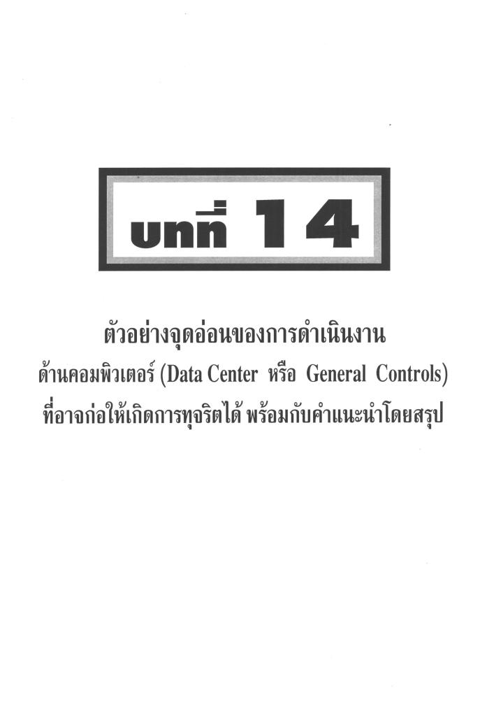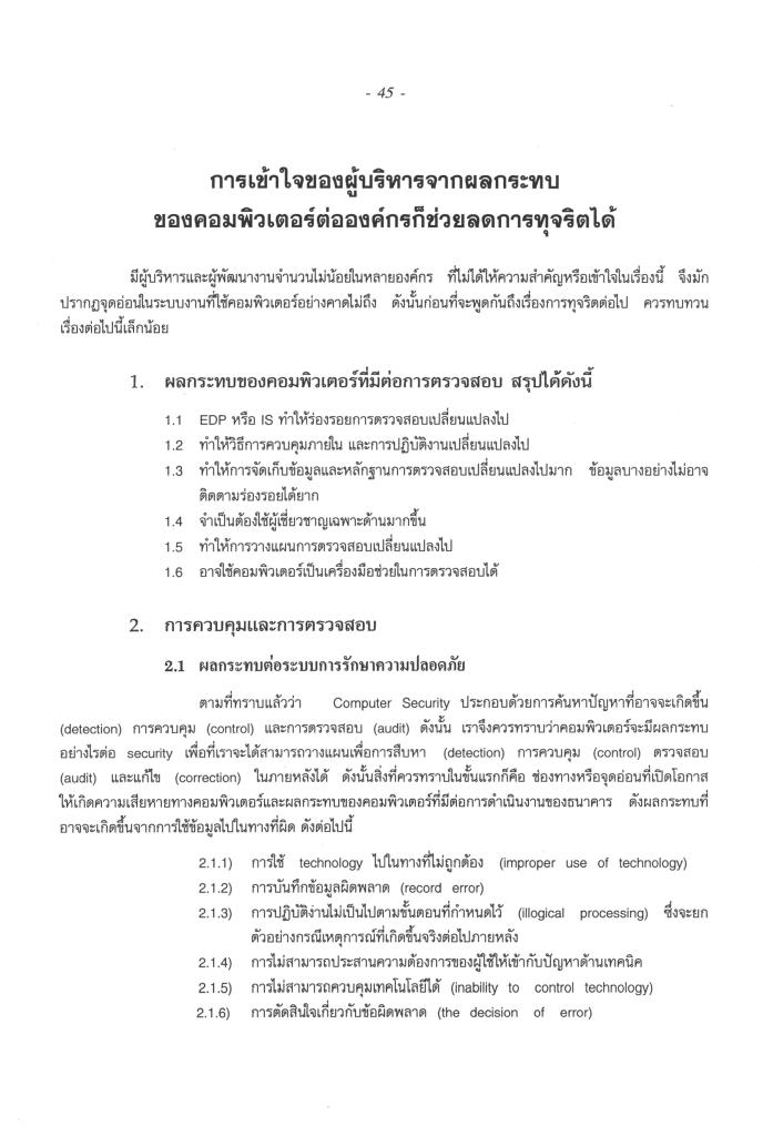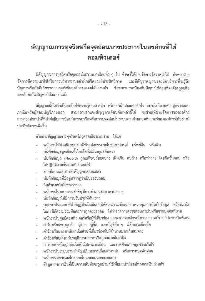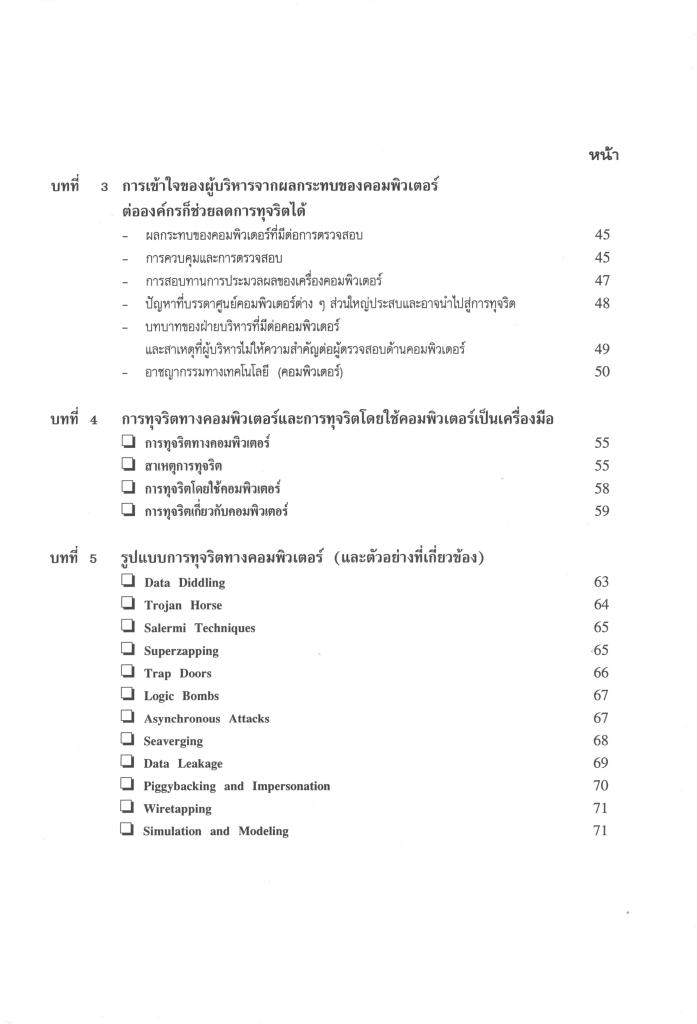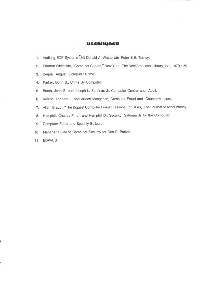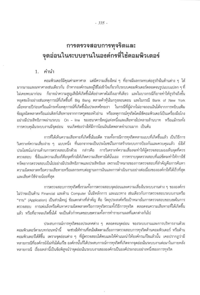 ความคิดและการกระทําดังกล่าวได้ - หากท่านผู้อ่านใคร่จะทบทวนแนวคิด ตลอดจนวิธีการตรวจสอบองค์กรที่ใช้คอมพิวเตอร์ ซึ่งในความหมายนี้คลุมไปหมดทั้งเรื่อง Financial Audit และ Computer Audit หรือ IS Audit ซึ่งการตรวจสอบทั้ง 2 เรื่อง มีความสัมพันธ์กันอย่างใกล้ชิด เพราะการตรวจสอบ Financial Audit ก็คงต้องพิจารณา Computer Audit ด้วยในฐานะที่องค์กรยุคใหม่ได้นําคอมพิวเตอร์มาใช้ในการปฏิบัติงาน และการควบคุมภายในแล้วทั้งสิ้น ท่านอาจดูข้อสรุปในเล่มนี้ในบทที่เกี่ยวข้องกับการตรวจสอบการทุจริตได้
