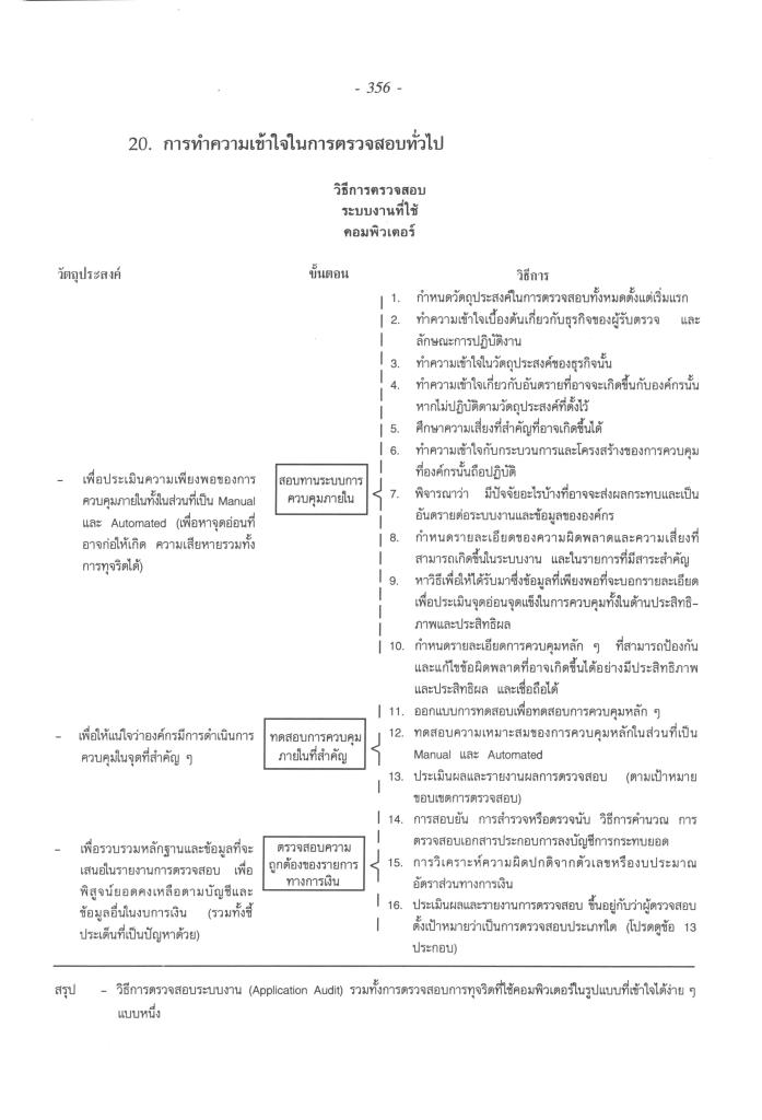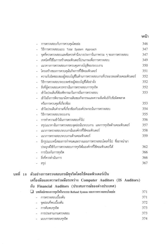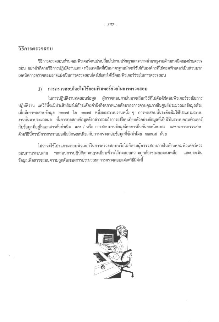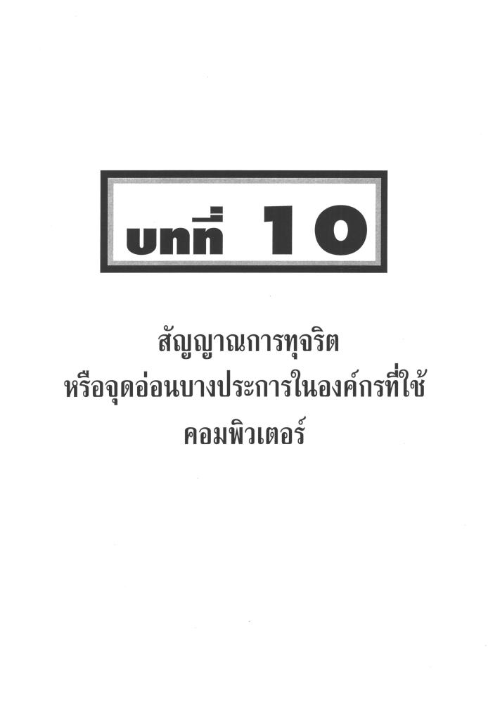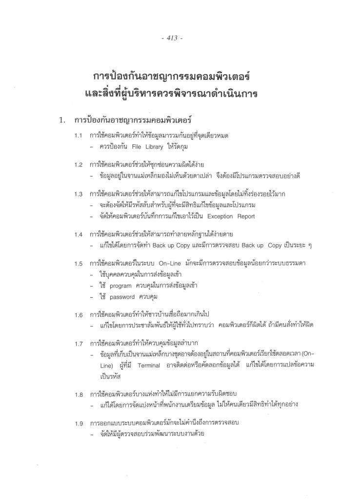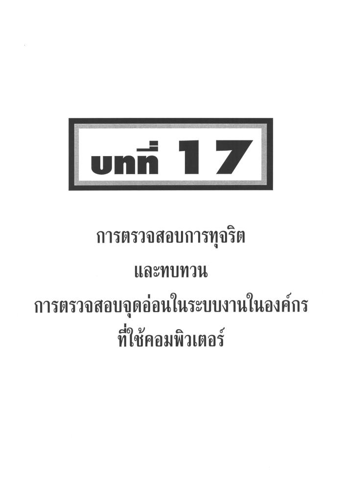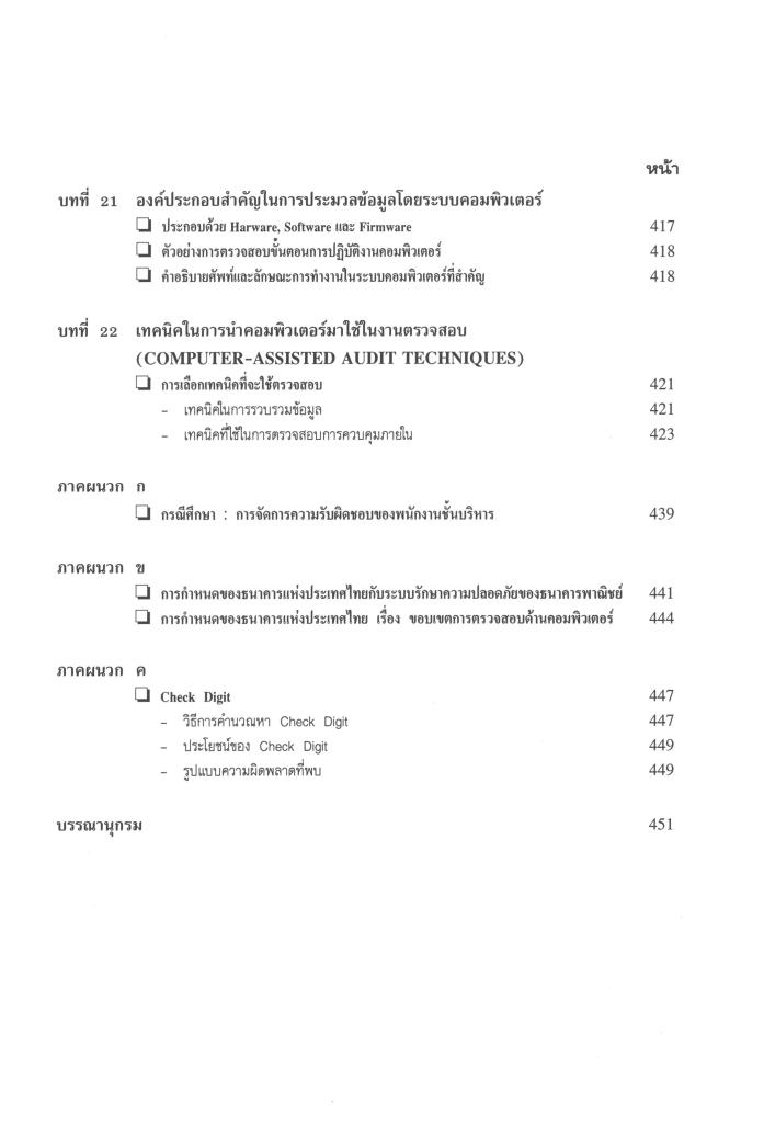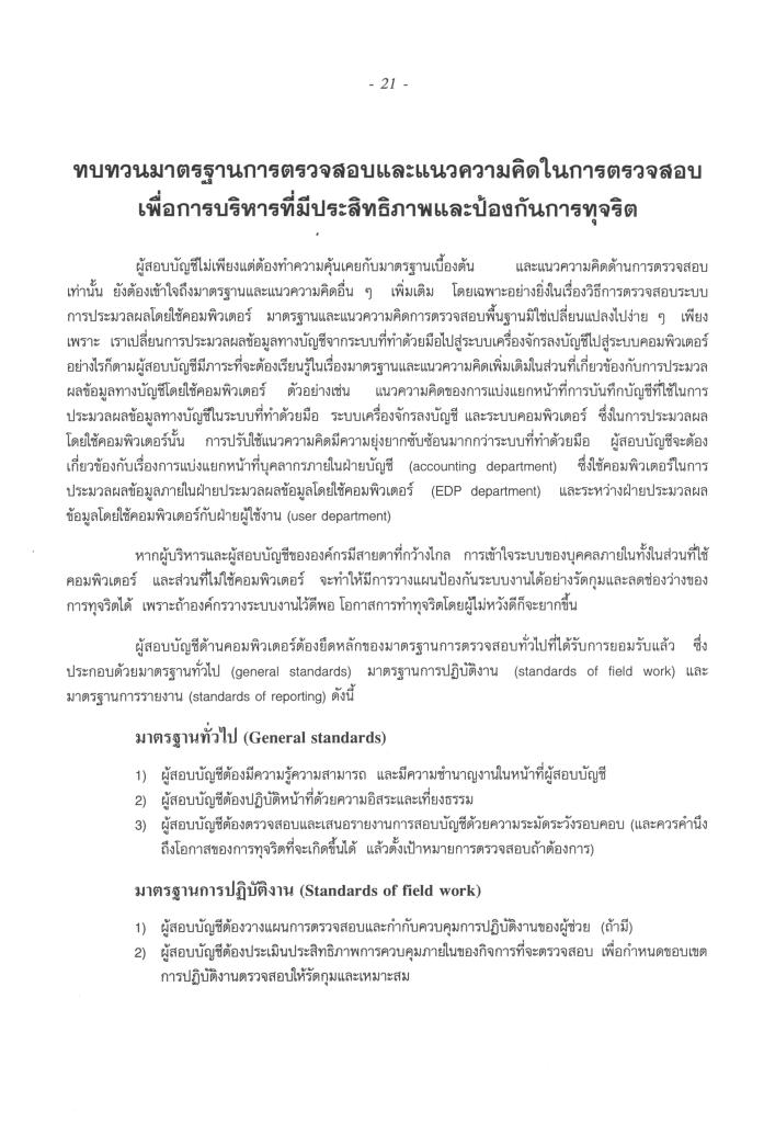 ความคิดและการกระทําดังกล่าวได้ - หากท่านผู้อ่านใคร่จะทบทวนแนวคิด ตลอดจนวิธีการตรวจสอบองค์กรที่ใช้คอมพิวเตอร์ ซึ่งในความหมายนี้คลุมไปหมดทั้งเรื่อง Financial Audit และ Computer Audit หรือ IS Audit ซึ่งการตรวจสอบทั้ง 2 เรื่อง มีความสัมพันธ์กันอย่างใกล้ชิด เพราะการตรวจสอบ Financial Audit ก็คงต้องพิจารณา Computer Audit ด้วยในฐานะที่องค์กรยุคใหม่ได้นําคอมพิวเตอร์มาใช้ในการปฏิบัติงาน และการควบคุมภายในแล้วทั้งสิ้น ท่านอาจดูข้อสรุปในเล่มนี้ในบทที่เกี่ยวข้องกับการตรวจสอบการทุจริตได้