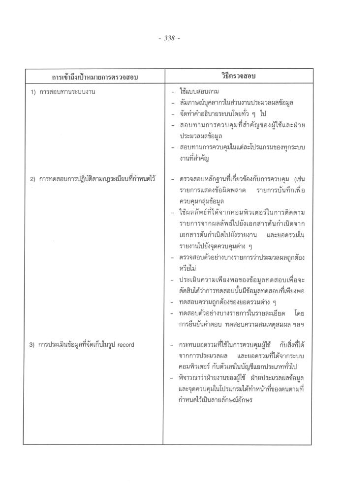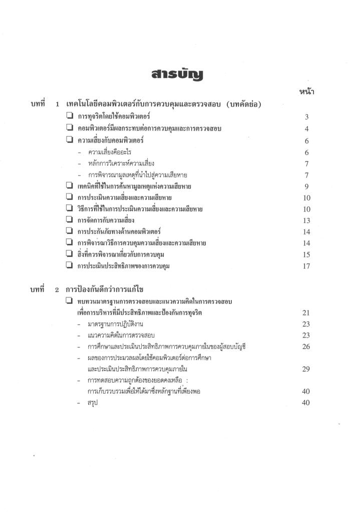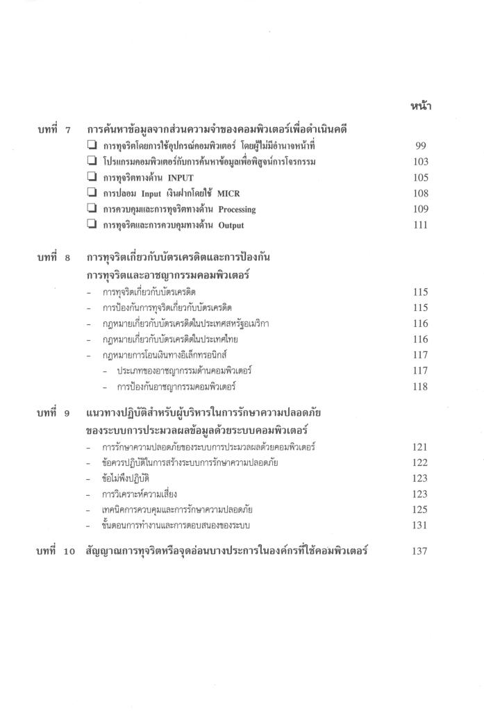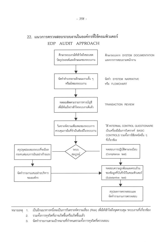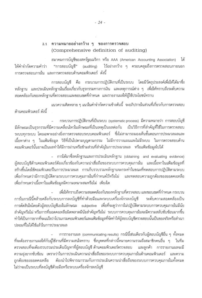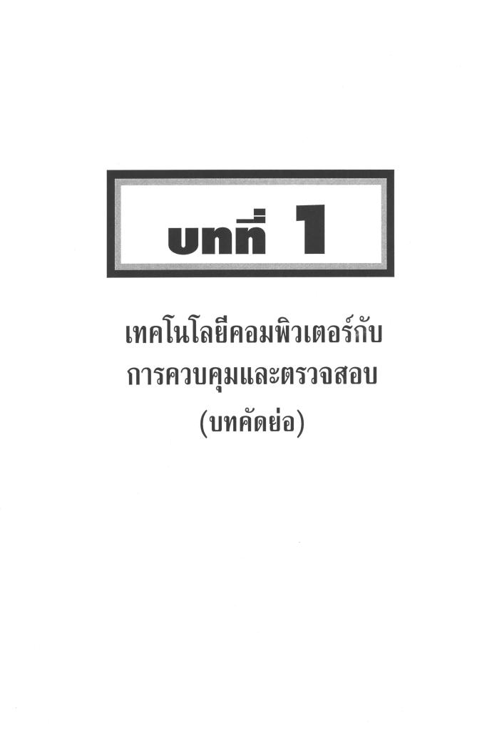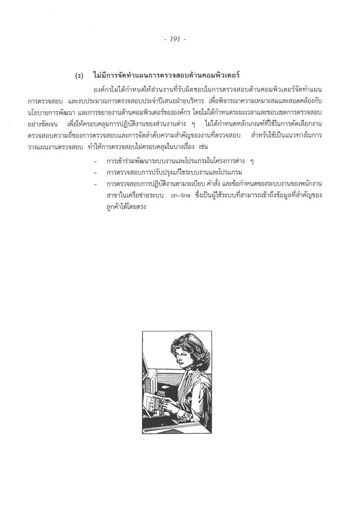 ความคิดและการกระทําดังกล่าวได้ - หากท่านผู้อ่านใคร่จะทบทวนแนวคิด ตลอดจนวิธีการตรวจสอบองค์กรที่ใช้คอมพิวเตอร์ ซึ่งในความหมายนี้คลุมไปหมดทั้งเรื่อง Financial Audit และ Computer Audit หรือ IS Audit ซึ่งการตรวจสอบทั้ง 2 เรื่อง มีความสัมพันธ์กันอย่างใกล้ชิด เพราะการตรวจสอบ Financial Audit ก็คงต้องพิจารณา Computer Audit ด้วยในฐานะที่องค์กรยุคใหม่ได้นําคอมพิวเตอร์มาใช้ในการปฏิบัติงาน และการควบคุมภายในแล้วทั้งสิ้น ท่านอาจดูข้อสรุปในเล่มนี้ในบทที่เกี่ยวข้องกับการตรวจสอบการทุจริตได้