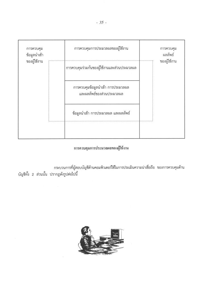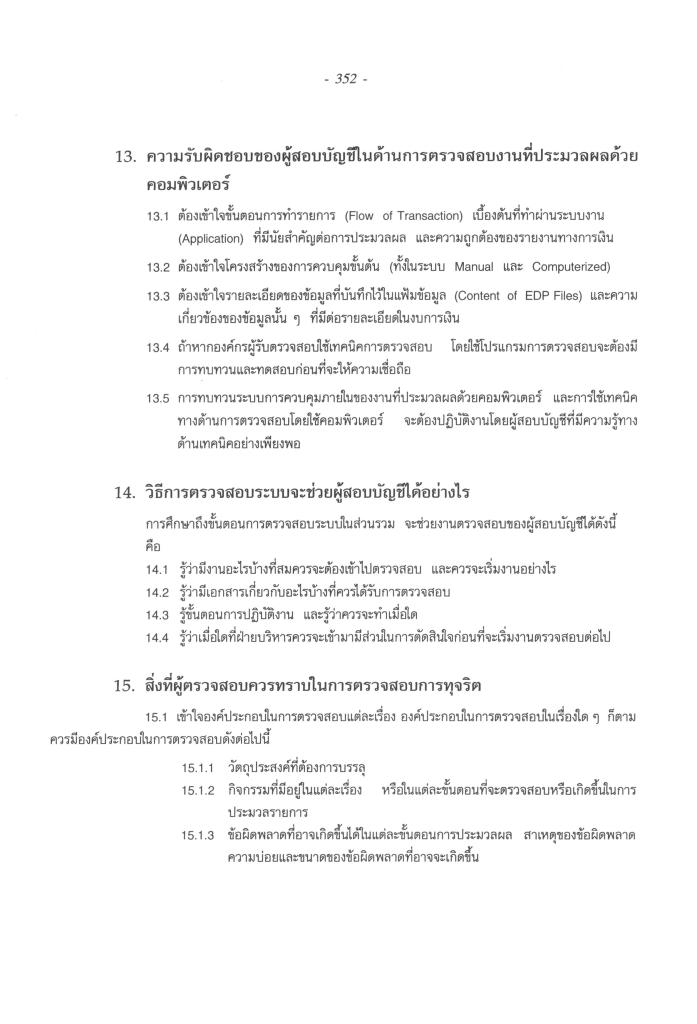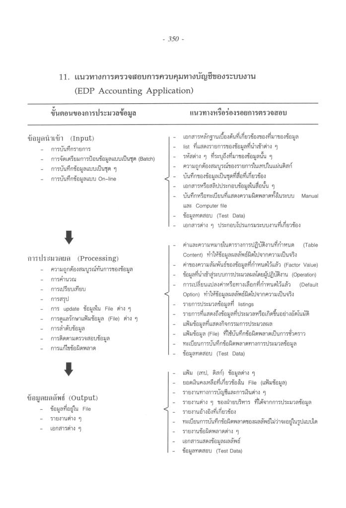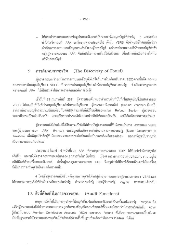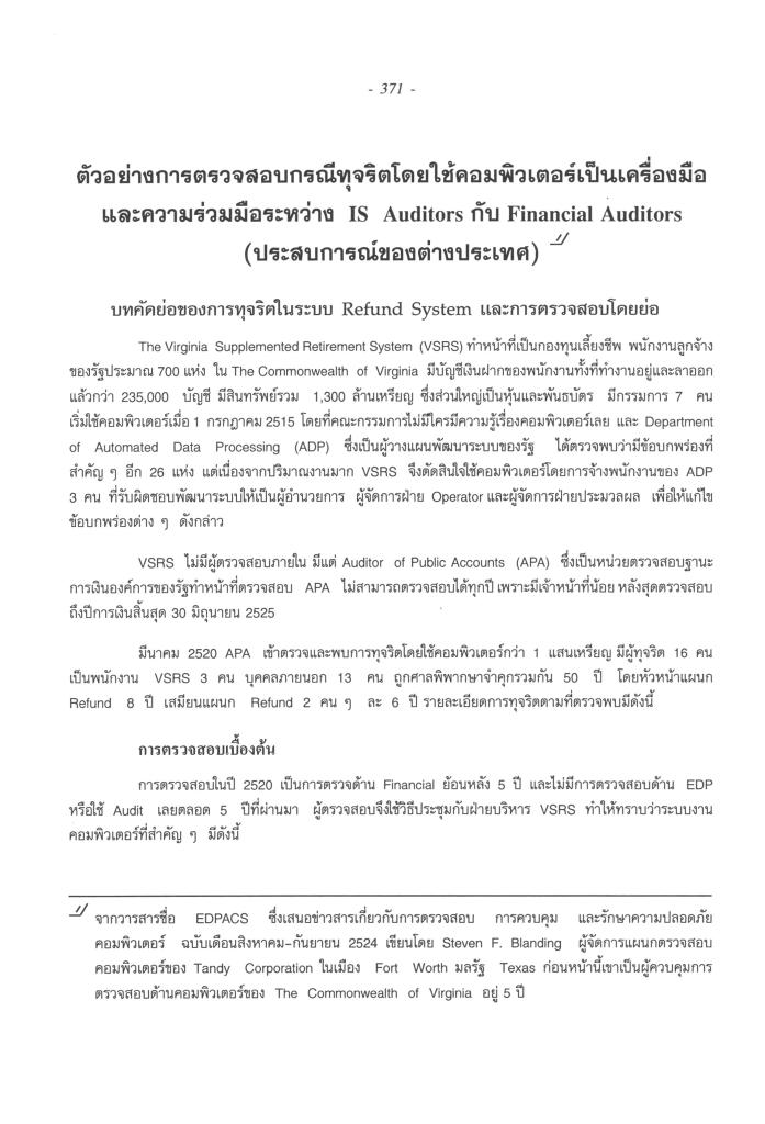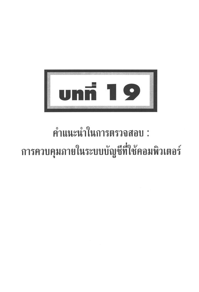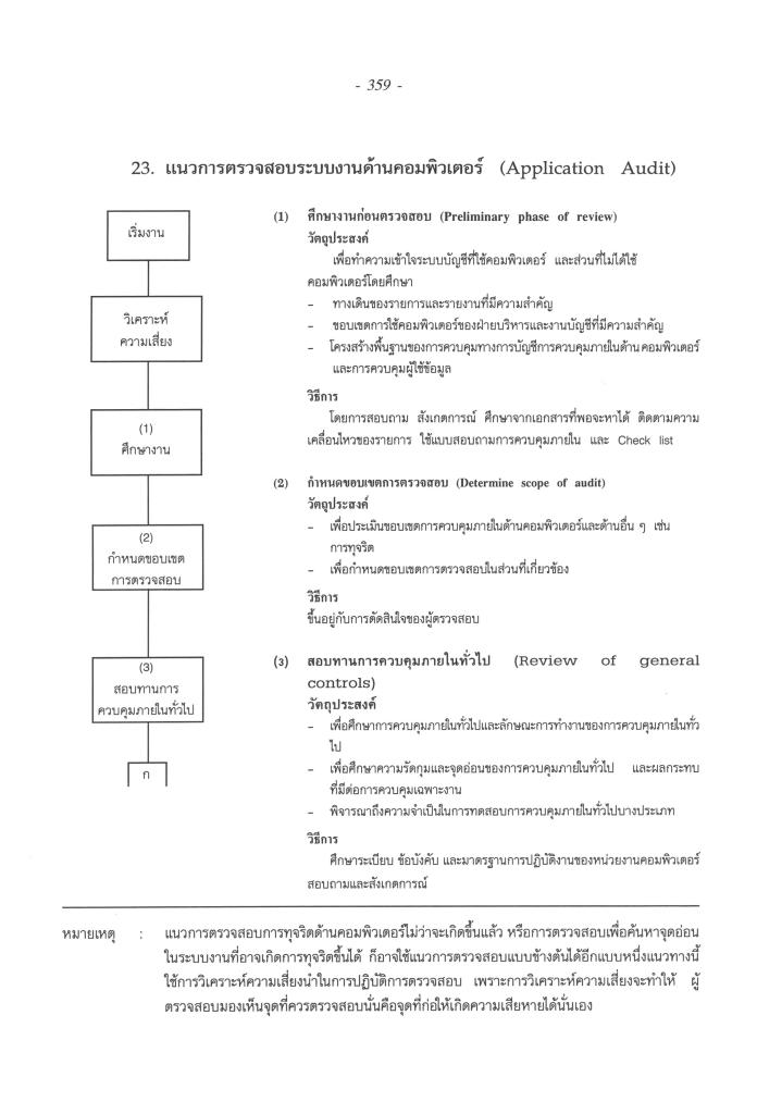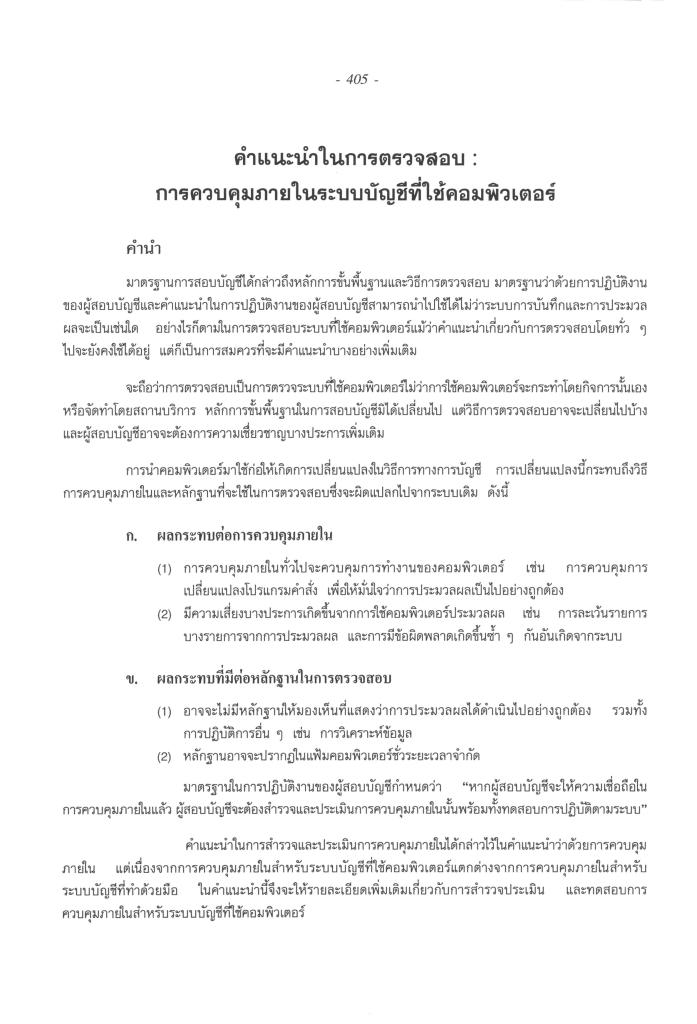 ความคิดและการกระทําดังกล่าวได้ - หากท่านผู้อ่านใคร่จะทบทวนแนวคิด ตลอดจนวิธีการตรวจสอบองค์กรที่ใช้คอมพิวเตอร์ ซึ่งในความหมายนี้คลุมไปหมดทั้งเรื่อง Financial Audit และ Computer Audit หรือ IS Audit ซึ่งการตรวจสอบทั้ง 2 เรื่อง มีความสัมพันธ์กันอย่างใกล้ชิด เพราะการตรวจสอบ Financial Audit ก็คงต้องพิจารณา Computer Audit ด้วยในฐานะที่องค์กรยุคใหม่ได้นําคอมพิวเตอร์มาใช้ในการปฏิบัติงาน และการควบคุมภายในแล้วทั้งสิ้น ท่านอาจดูข้อสรุปในเล่มนี้ในบทที่เกี่ยวข้องกับการตรวจสอบการทุจริตได้