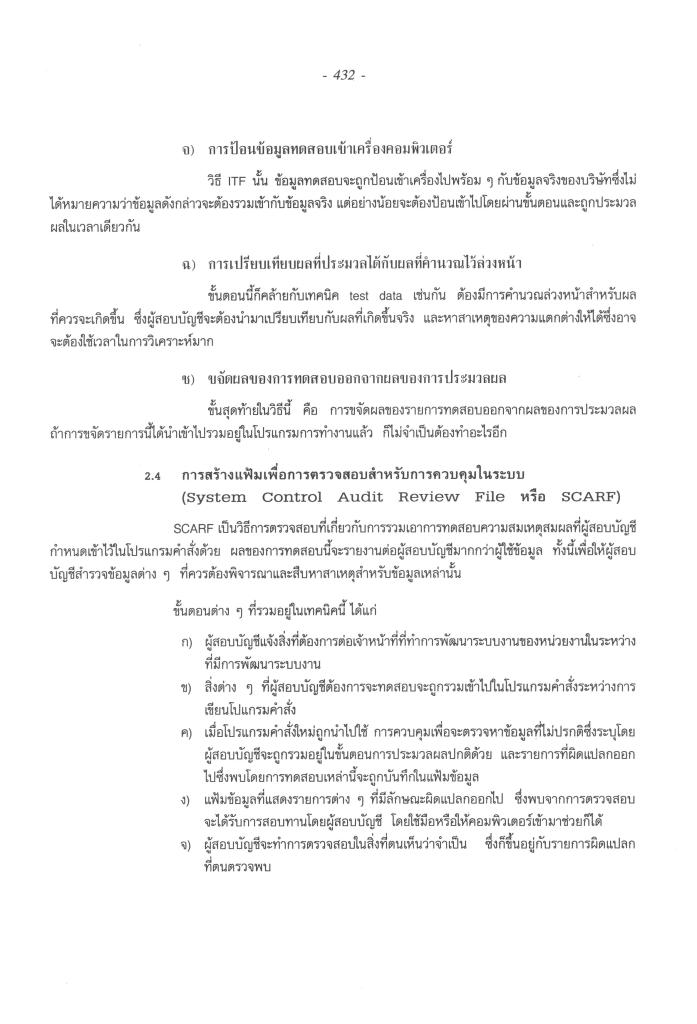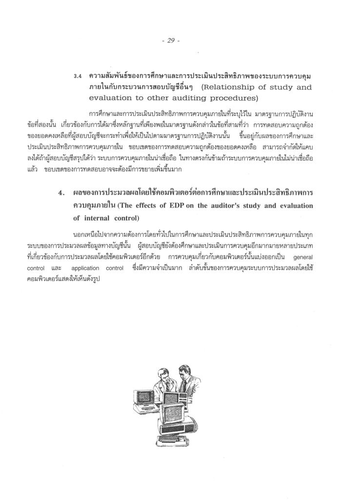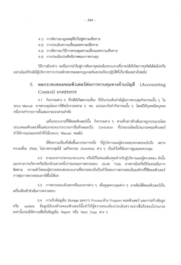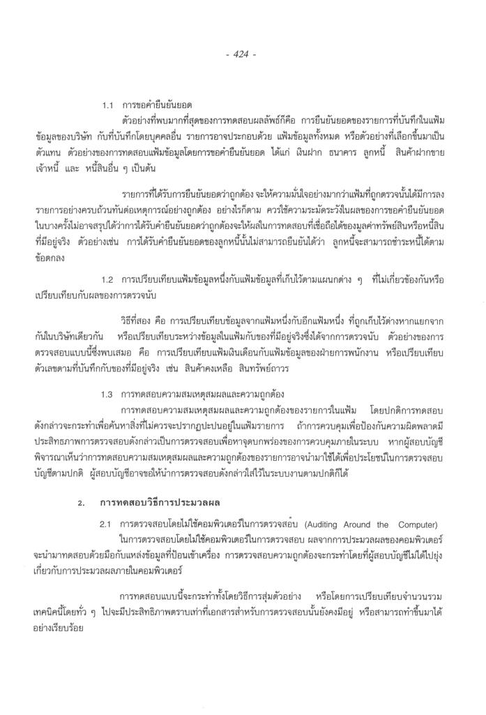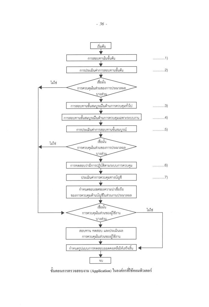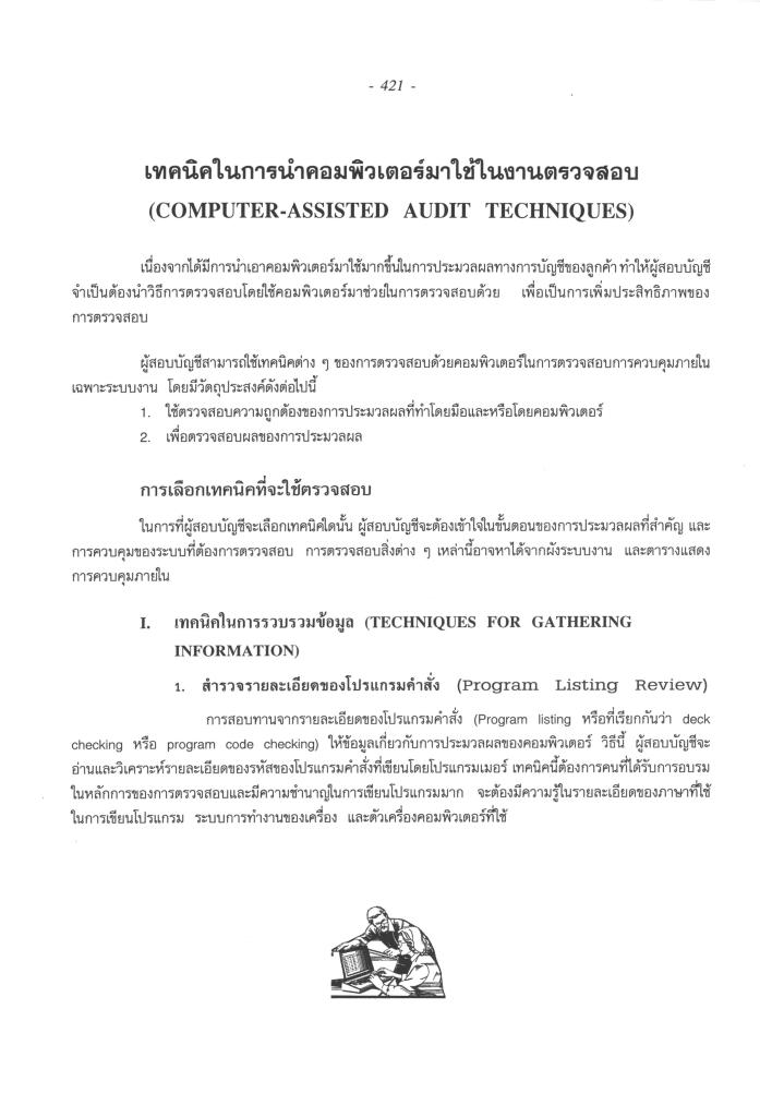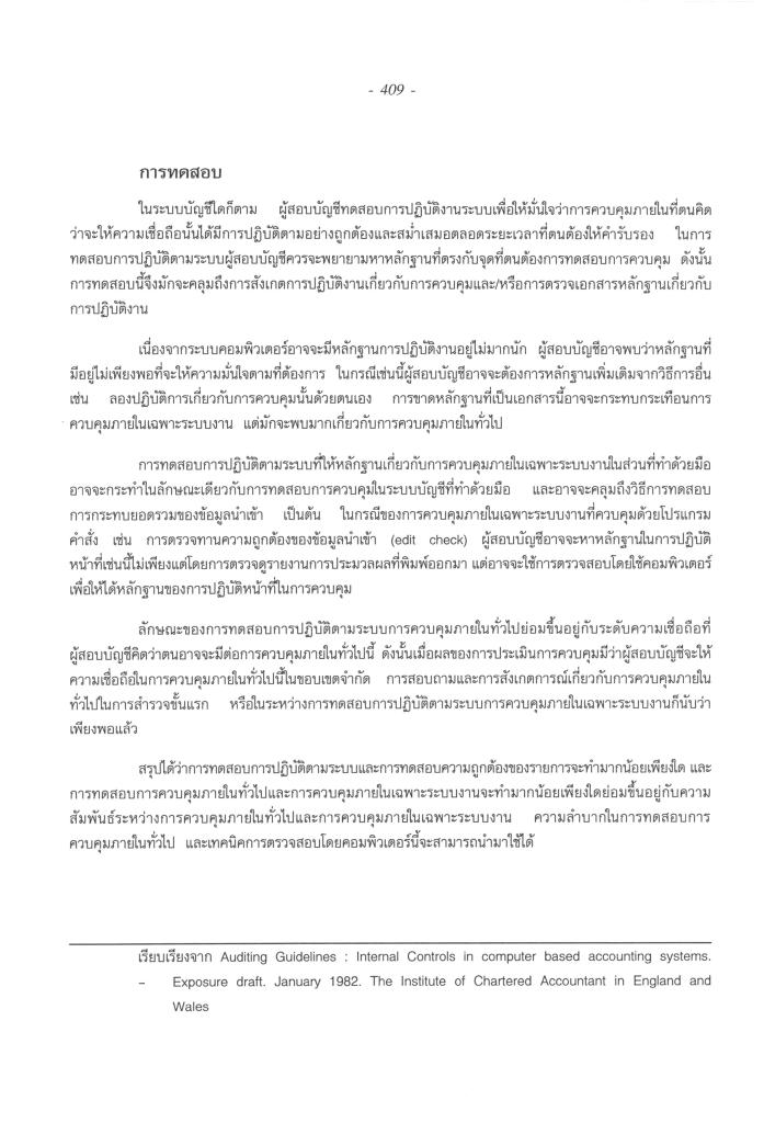 ความคิดและการกระทําดังกล่าวได้ - หากท่านผู้อ่านใคร่จะทบทวนแนวคิด ตลอดจนวิธีการตรวจสอบองค์กรที่ใช้คอมพิวเตอร์ ซึ่งในความหมายนี้คลุมไปหมดทั้งเรื่อง Financial Audit และ Computer Audit หรือ IS Audit ซึ่งการตรวจสอบทั้ง 2 เรื่อง มีความสัมพันธ์กันอย่างใกล้ชิด เพราะการตรวจสอบ Financial Audit ก็คงต้องพิจารณา Computer Audit ด้วยในฐานะที่องค์กรยุคใหม่ได้นําคอมพิวเตอร์มาใช้ในการปฏิบัติงาน และการควบคุมภายในแล้วทั้งสิ้น ท่านอาจดูข้อสรุปในเล่มนี้ในบทที่เกี่ยวข้องกับการตรวจสอบการทุจริตได้