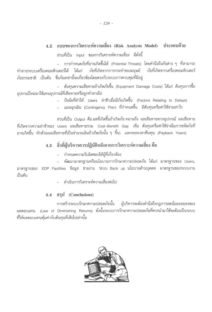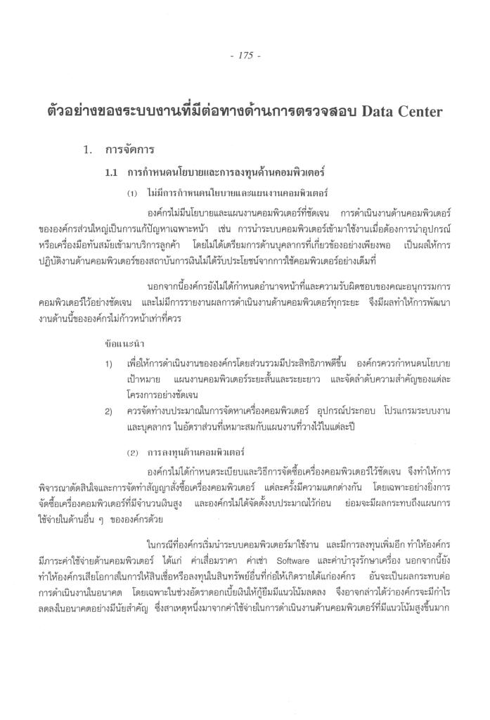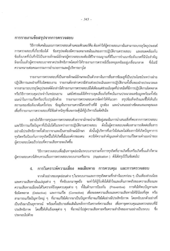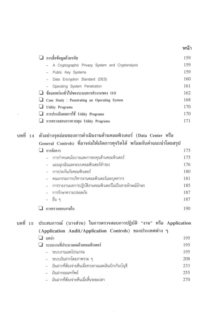 นอกจากนี้ในเล่มที่ 4 ของหนังสือชุดนี้ ผมได้จัดทําบทกรณีศึกษาการตรวจสอบทั้งทางด้าน Data Center และ Application ที่น่าสนใจ โดยส่วนใหญ่ได้แนวความคิดและประสบการณ์จากการตรวจสอบด้านภาคปฏิบัติจริง ๆ กรณีศึกษาจะมีบทแนวคําตอบให้ผู้ตรวจสอบได้ติดตามศึกษาด้วย ทั้งนี้เป็นการทบทวนความเข้าใจของผู้ตรวจสอบได้ระดับหนึ่ง อย่างไรก็ดีกรณีศึกษาดังกล่าวจะมีประโยชน์มากยิ่งขึ้น ถ้าหากผู้ตรวจสอบจะพิจารณาหาแนวคําตอบก่อนที่จะได้ดูบทเฉลยที่เป็นแนวคําตอบจริง ๆ ต่อไป - หนังสือชุดนี้ทั้ง 4 เล่ม มีเลขที่ของ ISBN อยู่ด้วย ทั้ง ๆ ที่มีการพิมพ์จํานวนน้อยมาก ทั้งนี้ก็เพื่อใช้ในการศึกษาตามที่เคยกล่าวแล้ว แต่การมีเลขที่ ISBN ด้วยก็เพื่อให้ใช้เป็นที่อ้างอิงสําหรับผู้อ่าน เมื่อหนังสือนี้ อยู่ในห้องสมุดของธนาคารแห่งประเทศไทย ที่มีระบบการอ้างอิงเอกสารที่ทันสมัยแล้วเท่านั้น