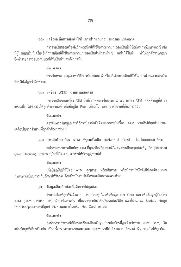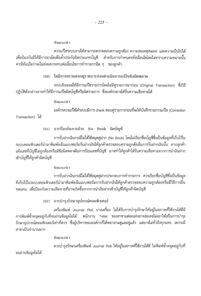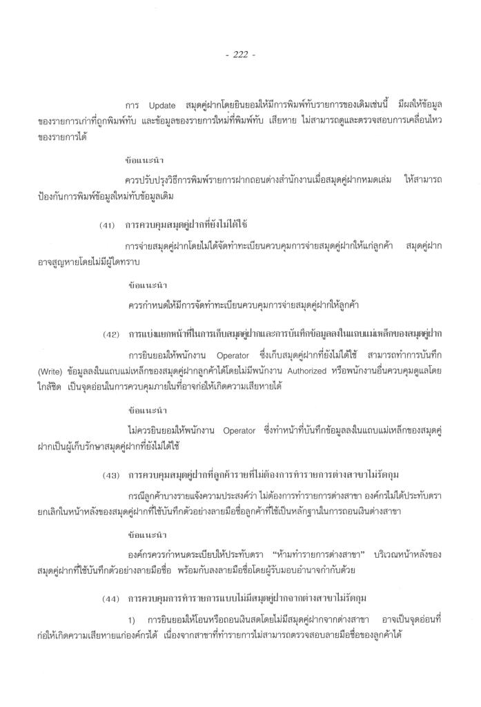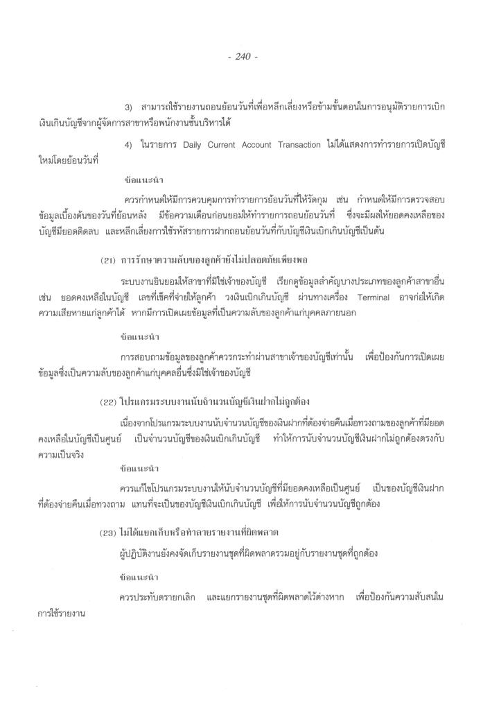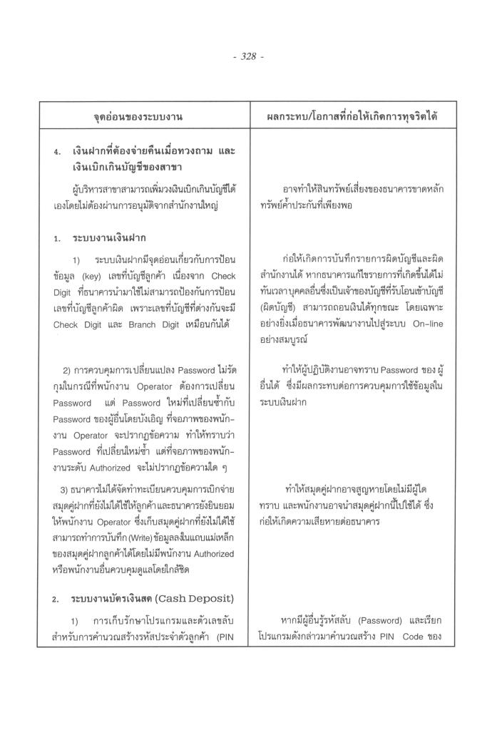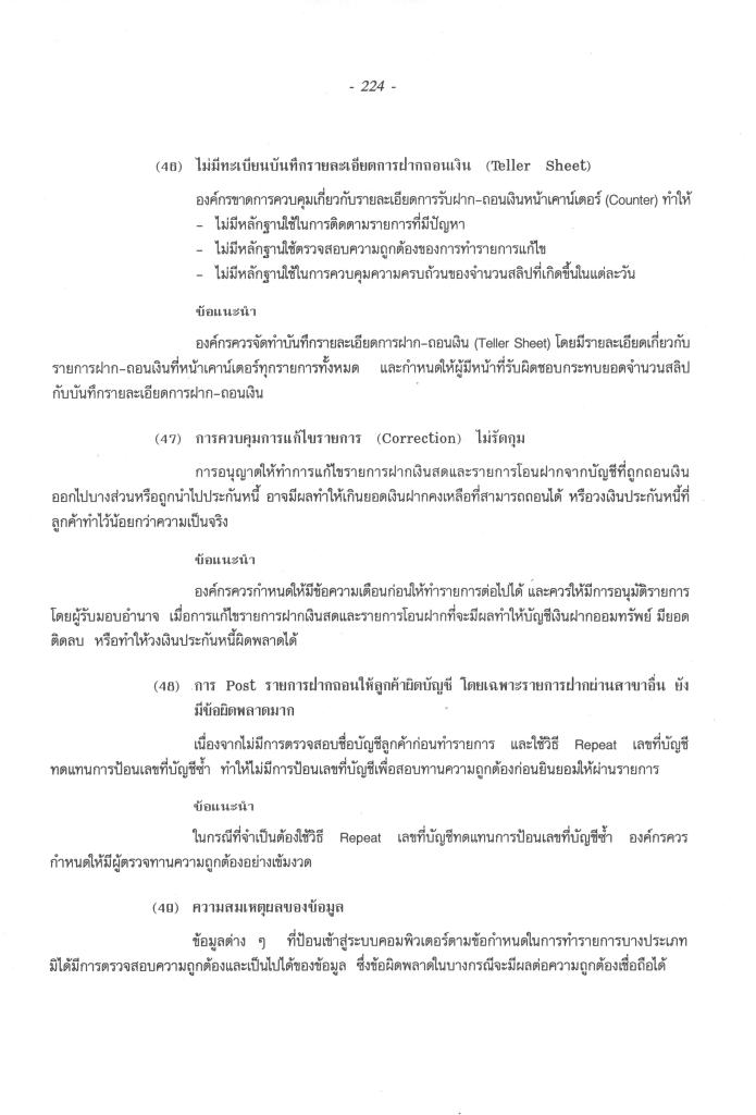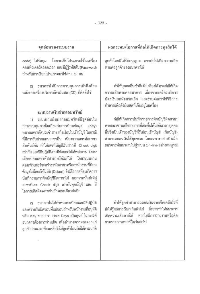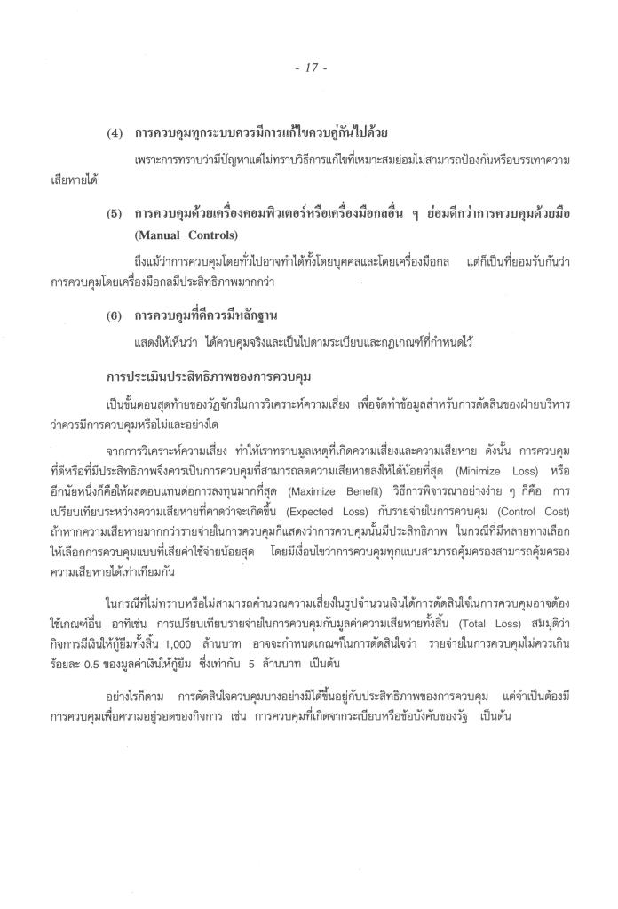 ความเสียหายซึ่งเกิดขึ้นจากระบบงานมีจุดอ่อน อาจก่อให้เกิดความเสียหายให้กับองค์กรอย่างร้ายแรง และคาดไม่ถึง จนถึงขั้นไม่สามารถดําเนินการต่อไปได้ทีเดียว ทั้ง ๆ ที่องค์กรอาจไม่มีปัญหาด้านสภาพคล่อง ซึ่งเป็นเรื่องน่าพิจารณาเป็นอย่างยิ่ง สําหรับผู้บริหารที่ไม่ต้องการให้เกิดปัญหานี้กับองค์กรของตนเอง - ธนาคารแห่งประเทศไทยมีหน้าที่กํากับและดูแลความมั่นคงของสถาบันการเงิน ซึ่งมีความสัมพันธ์กันอย่างใกล้ชิดกับความมั่นคงและเสถียรภาพทางเศรษฐกิจโดยรวมของประเทศ ดังนั้นการป้องกันปัญหาก่อนที่ปัญหาจะเกิดขึ้นกับสถาบันการเงิน จึงเป็นทั้งหน้าที่และวิธีการที่กล่าวได้ว่าเหมาะสม โดยเฉพาะอย่างยิ่งการให้ความรู้คําแนะนํา