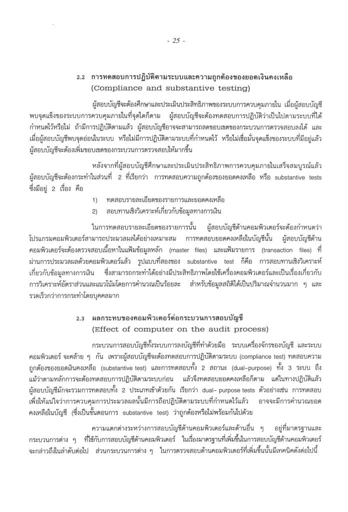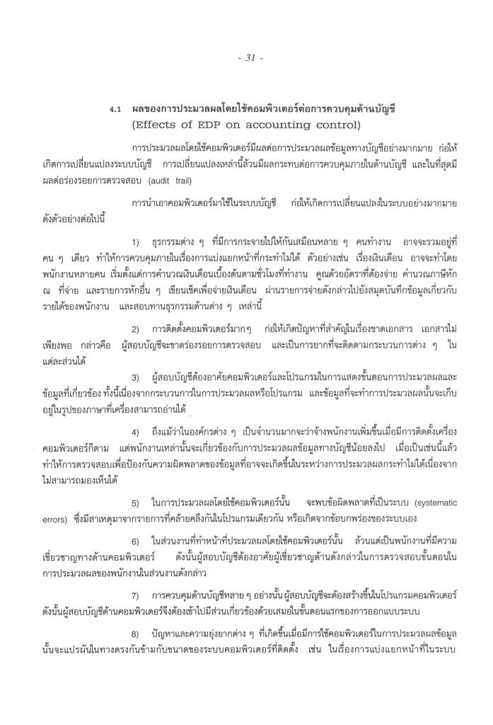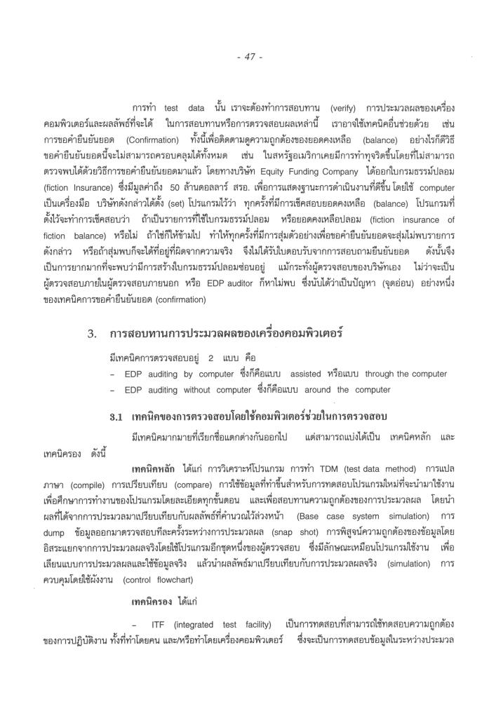ดังนั้นการแปลคําว่า Computer Audit ตามพจนานุกรมศัพท์คอมพิวเตอร์บางเล่มว่าเป็นการตรวจสอบบัญชีด้วยคอมพิวเตอร์ น่าจะมีความหมายเพียงการใช้คอมพิวเตอร์เข้าช่วยในการตรวจสอบ หรือเป็น Computer Assisted Audit Technique อย่างหนึ่ง มากกว่าเป็นการตรวจสอบด้านคอมพิวเตอร์ (Computer Audit) จริง ๆ แล้ว ในขณะนี้บางเล่มแปลว่าการตรวจสอบระบบคอมพิวเตอร์ ซึ่งการแปลเช่นนี้มีความหมายที่ใกล้เคียงกับความหมายที่ผมคิดว่าน่าจะถูกต้องคือ “การตรวจสอบด้านคอมพิวเตอร์” แต่คําว่าการตรวจสอบระบบคอมพิวเตอร์ อาจทําให้ผู้อ่านเข้าใจผิดว่า เป็นการตรวจสอบทางด้าน System ของคอมพิวเตอร์ หรือเป็นแต่เพียงการตรวจสอบระบบงานใดระบบงานหนึ่ง หรือหลายระบบที่ใช้คอมพิวเตอร์ในการประมวลงาน ซึ่งตรงกับคําภาษาอังกฤษว่า “Application Audit” โดยเป็นส่วนหนึ่งของการตรวจสอบทางด้าน Computer Audit ตามที่กล่าวแล้วเท่านั้น หรืออาจมีผู้อ่านบางท่านเข้าใจไขว้เขวไปได้ว่า “เป็นการตรวจสอบระบบคอมพิวเตอร์” ตามคําแปลล้วน ๆ เพียงอย่างเดียวก็ได้ และเข้าใจเช่นนี้ จะคลาดเคลื่อนจากความหมายของคําว่า Computer Audit ตามที่ผมกล่าวในตอนแรก ๆ แล้วว่า การตรวจสอบด้านคอมพิวเตอร์ (Computer Audit) หรือ IS Audit เป็นการตรวจสอบในลักษณะ Total System Approach นั่นคือการตรวจสอบ การบริหารงานและการประมวลงาน ตั้งแต่การพัฒนาระบบงานการนําข้อมูลเข้า การประมวลผล จนกระทั่งได้ข้อมูลผลลัพธ์ ทั้งในส่วนที่เป็น Manual ส่วนที่เป็น Automated และส่วนผสมของทั้ง 2 แบบ รวมทั้งการใช้ผลลัพธ์จากการประมวลผล ตลอดจนถึงการจัดทําเอกสารประกอบระบบงาน ส่วนกระบวนการตรวจสอบ เทคนิคการตรวจสอบ หลักฐานการตรวจสอบ การจัดดูรายงานจะขึ้นอยู่กับเป้าหมายและขอบเขตการตรวจสอบเป็นสําคัญ ดังนั้นขอได้โปรดศึกษาและทบทวนความหมายและวัตถุประสงค์ในการตรวจสอบ IS Audit ให้ถ่องแท้ก่อนด้วย หวังว่าคําอธิบายในข้อนี้จะช่วยทําความเข้าใจในเรื่องการตรวจสอบด้านคอมพิวเตอร์ (Computer Audit) ได้บ้างส่วนพอสมควร เพราะหากท่านผู้อ่านเกิดความเข้าใจที่คลาดเคลื่อนแล้ว การศึกษาการบริหารงาน และการตรวจสอบองค์กรที่ใช้คอมพิวเตอร์จะเกิดความสับสนเป็นอย่างยิ่ง ดังนั้น จึงควรทราบว่า การใช้ภาษาไทยในเรื่องของการตรวจสอบด้านคอมพิวเตอร์ มีคําศัพท์ที่ใช้คล้าย ๆ กันหลายคํา แต่มีความหมายแตกต่างกันอย่างมีนัยสําคัญมาก สําหรับคําว่า “การตรวจสอบองค์กรที่ใช้คอมพิวเตอร์ก็มีความหมายหลัก ๆ ได้ 2 อย่างคือ การตรวจสอบด้าน IS Audit และ/หรือ Financial Audit ซึ่งขึ้นอยู่กับวัตถุประสงค์ของการตรวจสอบ อย่างไรก็ดี หากเป็นการตรวจสอบ Financial audit ก็หนีไม่พ้นต้องทําการตรวจสอบทางด้าน IS Audit ซึ่งอยู