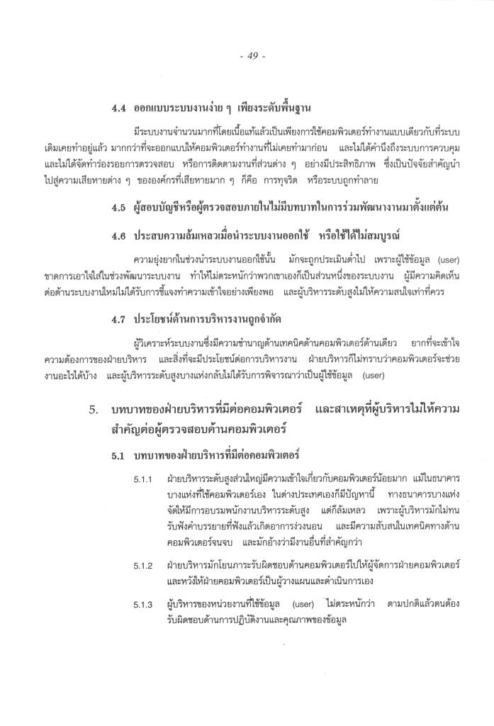 มีการสร้างเป้าหมาย ขอบเขต กําหนดวิธีการตรวจสอบ ตลอดจนการใช้คอมพิวเตอร์เข้าช่วยตรวจสอบที่เหมาะสมในช่วงเวลาที่สมเหตุสมผล รวมทั้งการใช้บุคลากรที่มีความพร้อมในระดับหนึ่งได้ การศึกษาแนวทางการตรวจสอบด้านคอมพิวเตอร์ หรือการศึกษาแนวทางการตรวจสอบองค์กรที่ใช้คอมพิวเตอร์ รวมทั้งการใช้คําถามที่ผู้ตรวจสอบควรทราบอย่างเหมาะสม เช่น การตั้งคําถามว่า “What can go wrong” หรือการคาดคะเนข้อผิดพลาด หรือจุดอ่อน ที่มีนัยสัมพันธ์ที่อาจเกิดขึ้นในแต่ละกระบวนการปฏิบัติงาน ทั้งในแบบ Manual และในแบบ Automated ในส่วนที่เกี่ยวข้องทั้งเรื่อง “องค์กร” (Data Center) และเรื่อง “งาน” (Application) ซึ่งเกิดจากความเข้าใจที่ถ่องแท้ของผู้ตรวจสอบในองค์กรที่ใช้คอมพิวเตอร์แล้ว จะช่วยให้พบจุดอ่อนที่คาดไม่ถึงได้มาก ซึ่งจะเป็นหนทางป้องกันปัญหาต่าง ๆ ได้ก่อนที่ความเสียหายจะเกิดขึ้น - ผมได้เคยบรรยายเรื่อง “คอมพิวเตอร์กับการทุจริต” ให้กับองค์กรต่าง ๆ หลายครั้ง รวมทั้งสถาบันที่จัดให้มีการอบรมเรื่องนี้ โดยเฉพาะอย่างยิ่งได้เคยบรรยายร่วมกับ Mr. August Beguai ผู้แต่งหนังสือเรื่อง Cumputer Crime จากประเทศสหรัฐอเมริกา ทุกครั้งมีผู้สนใจรับฟังมากและเรื่องที่ผู้ฟังสนใจมากที่สุด คือ วิธีทุจริตและตัวอย่างเกี่ยวกับการทุจริตต่าง ๆ ที่ได้เกิดขึ้นจริงทั้งในประเทศและต่างประเทศ ธนาคารแห่งประเทศไทย สาขาภาคตะวันออกเฉียงเหนือที่ผมดูแลสถาบันการเงินต่าง ๆ ทั้ง 19 จังหวัด ก็มีหลายจังหวัดที่ประสบปัญหาการทุจริตด้านคอมพิวเตอร์ แต่ส่วนใหญ่เป็นการทุจริตในลักษณะการใช้ “Off-line” โดยเปลี่ยนข้อมูลใน Report ต่าง ๆ เมื่อผู้บริหารนําไปใช้ตัดสินใจจึงเกิดความเสียหายขึ้น ซึ่งต่างกับการทุจริตที่กรุงเทพฯ ที่มักทุจริตโดยใช้วิธีการแบบ “On-line” โดยผู้ทุจริตอาศัยความเข้าใจในระบบงานและรู้จุดอ่อนเป็นสําคัญ