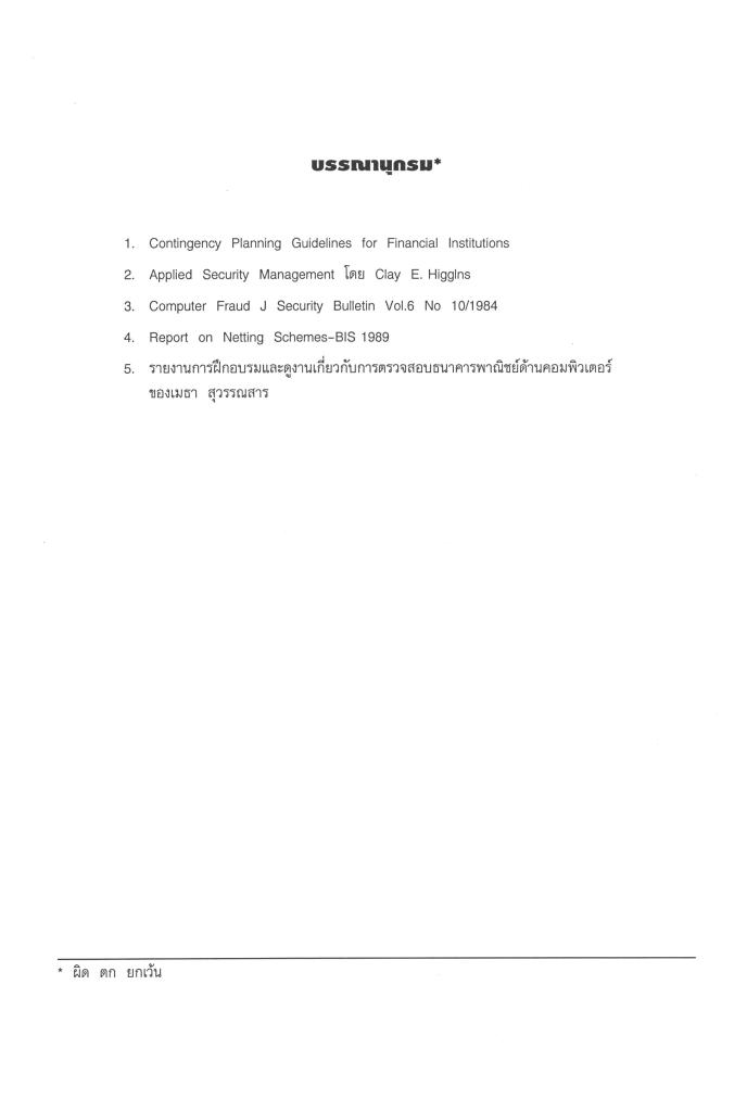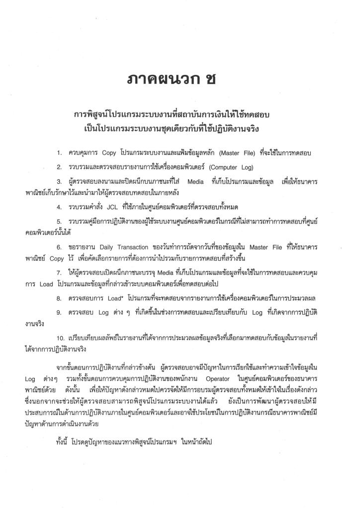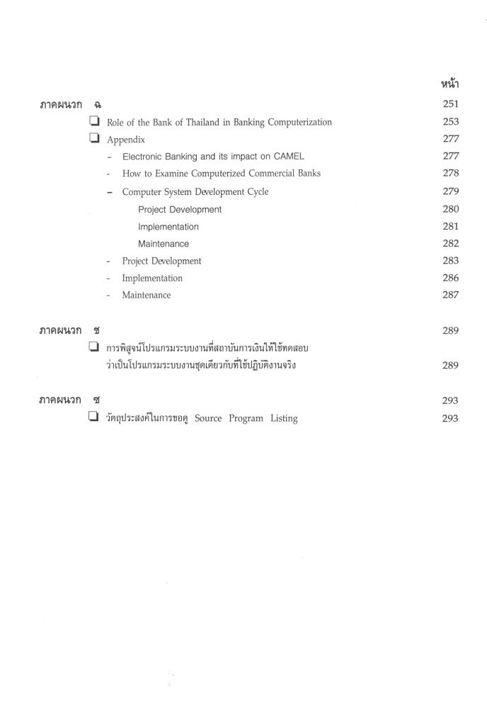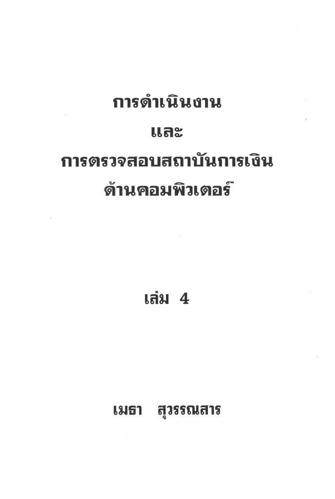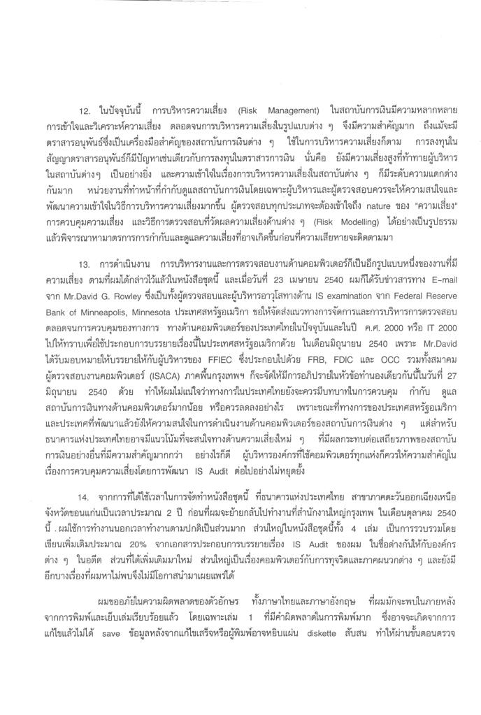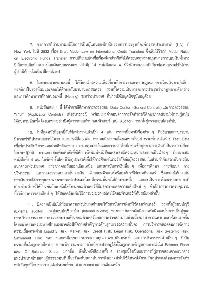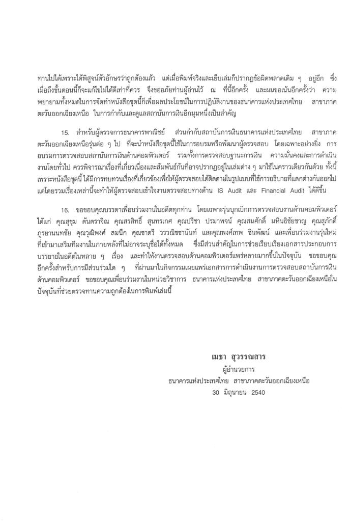 ผมขออภัยในความผิดพลาดของตัวอักษร ทั้งภาษาไทยและภาษาอังกฤษ ที่ผมมักจะพบในภายหลัง จากการพิมพ์และเย็บเล่มเรียบร้อยแล้ว โดยเฉพาะเล่ม 1 ที่มีคําผิดพลาดในการพิมพ์มาก ซึ่งอาจจะเกิดจากการแก้ไขแล้วไม่ได้ save ข้อมูลหลังจากแก้ไขเสร็จ หรือผู้พิมพ์อาจหยิบแผ่น diskette สับสน ทําให้ผ่านขั้นตอนตรวจทานไปได้ เพราะได้พิสูจน์ตัวอักษรว่าถูกต้องแล้ว แต่เมื่อพิมพ์จริงและเย็บเล่มก็ปรากฏข้อผิดพลาดเดิม ๆ อยู่อีก ซึ่งเมื่อถึงขั้นตอนนี้ก็จะแก้ไขไม่ได้ดีเท่าที่ควร จึงขออภัยท่านผู้อ่านไว้ ณ ที่นี้อีกครั้ง และผมขอเน้นอีกครั้งว่า ความ พยายามทั้งหมดในการจัดทําหนังสือชุดนี้ก็เพื่อผลประโยชน์ในการปฏิบัติงานของธนาคารแห่งประเทศไทย สาขาภาคตะวันออกเฉียงเหนือ ในการกํากับและดูแลสถาบันการเงินอีกมุมหนึ่งเป็นสําคัญ - สําหรับผู้ตรวจการธนาคารพาณิชย์ ส่วนกํากับสถาบันการเงินธนาคารแห่งประเทศไทย สาขาภาคตะวันออกเฉียงเหนือรุ่นต่อ ๆ ไป ที่จะนําหนังสือชุดนี้ใช้ในการอบรมหรือพัฒนาผู้ตรวจสอบ โดยเฉพาะอย่างยิ่ง การอบรมการตรวจสอบสถาบันการเงินด้านคอมพิวเตอร์ รวมทั้งการตรวจสอบฐานะการเงิน ความมั่นคงและการดําเนินงานโดยทั่วไป ควรพิจารณาเรื่องที่เกี่ยวเนื่องและสัมพันธ์กันที่อาจปรากฏอยู่ในเล่มต่าง ๆ มาใช้ในคราวเดียวกันด้วย ทั้งนี้ เพราะหนังสือชุดนี้ ได้มีการทบทวนเรื่องที่เกี่ยวข้อง เพื่อให้ผู้ตรวจสอบได้ติดตามในรูปแบบที่ใช้การอธิบายที่แตกต่างกันออกไป แต่โดยรวมเรื่องเหล่านี้จะทําให้ผู้ตรวจสอบเข้าใจงานตรวจสอบทางด้าน IS Audit และ Financial Audit ได้ดีขึ้น