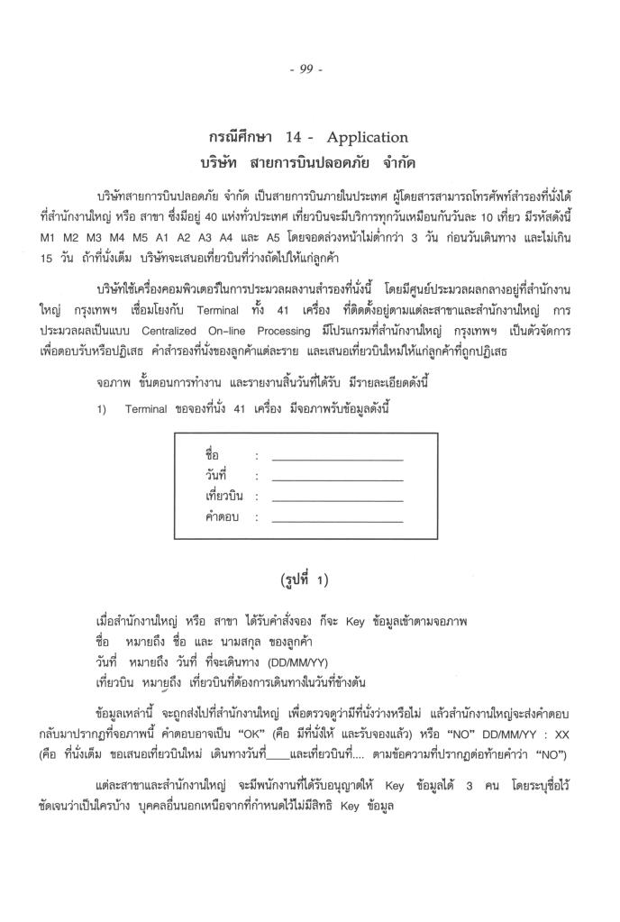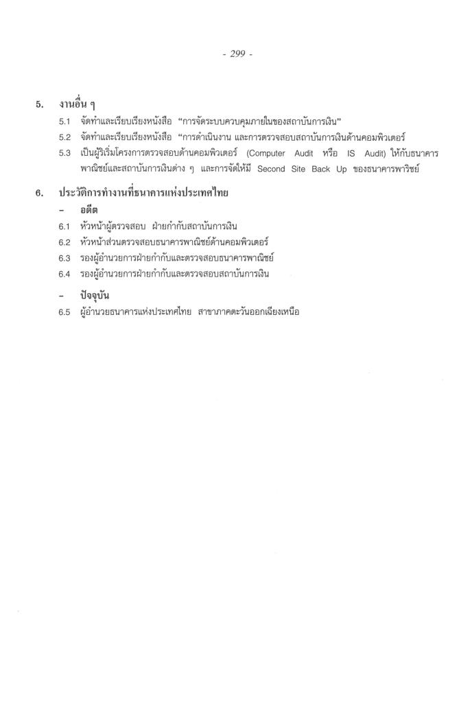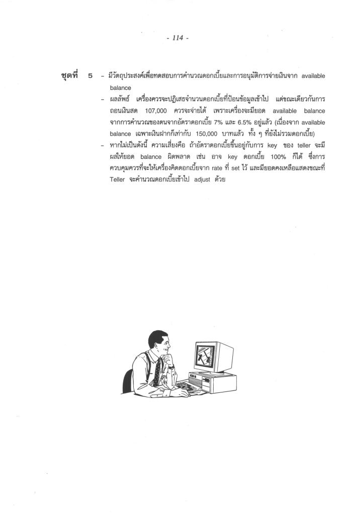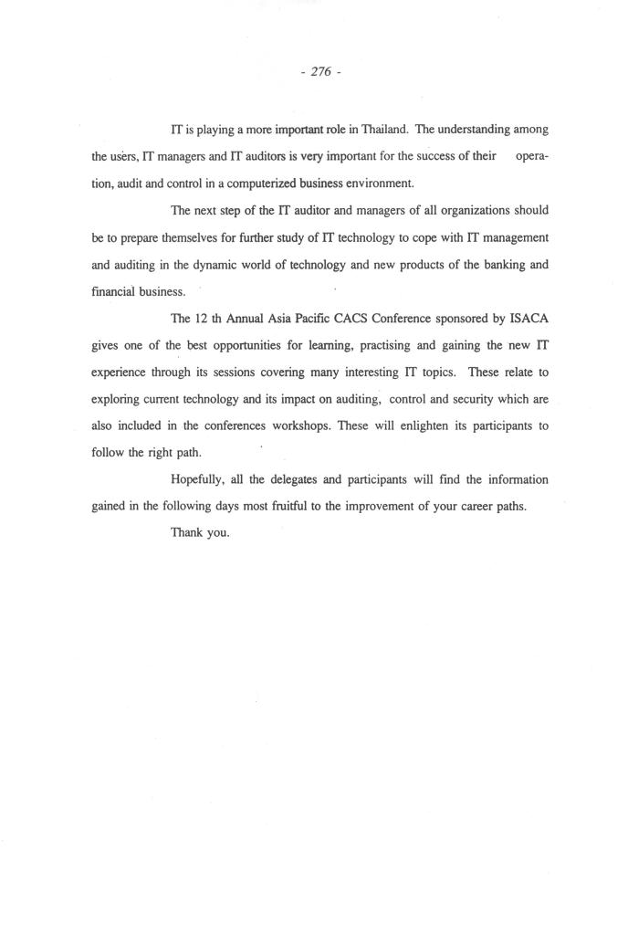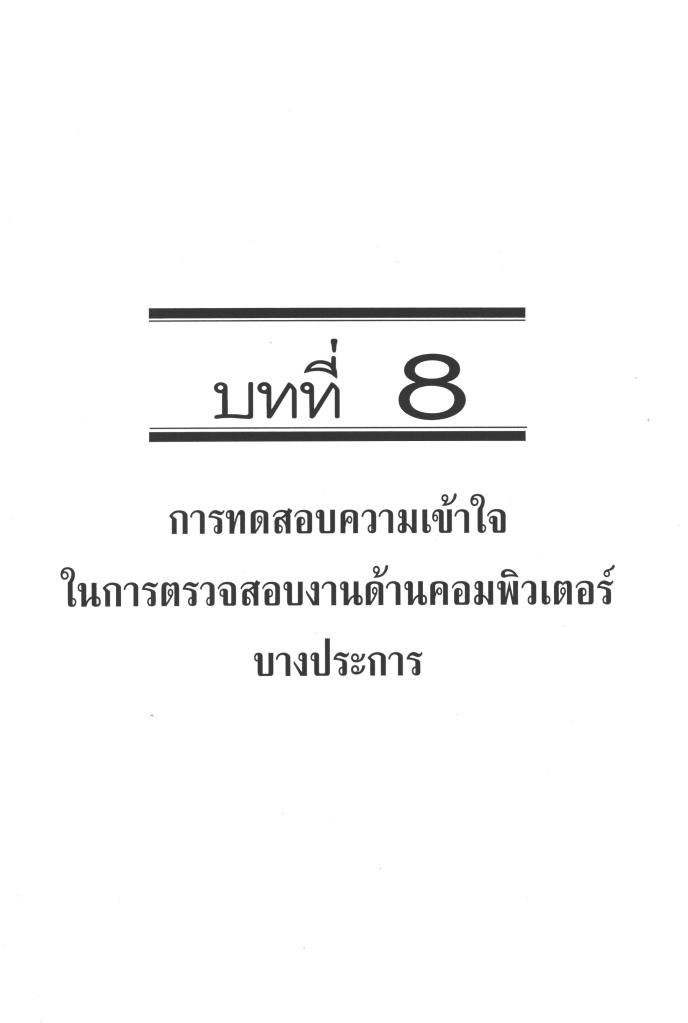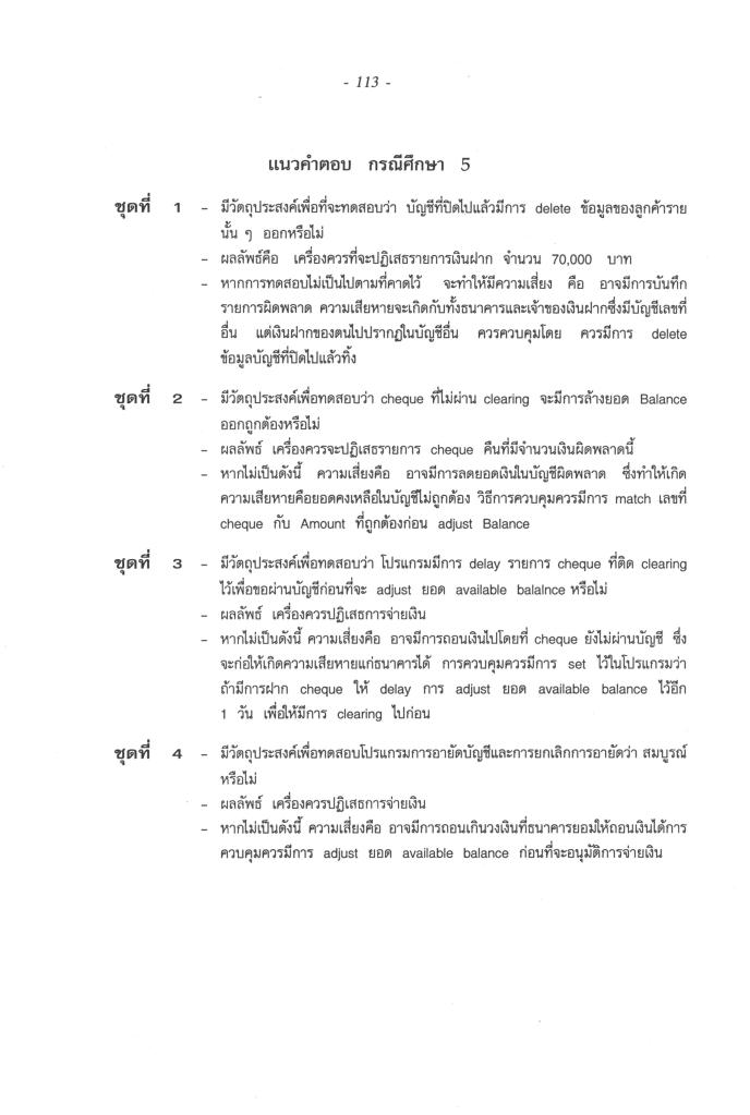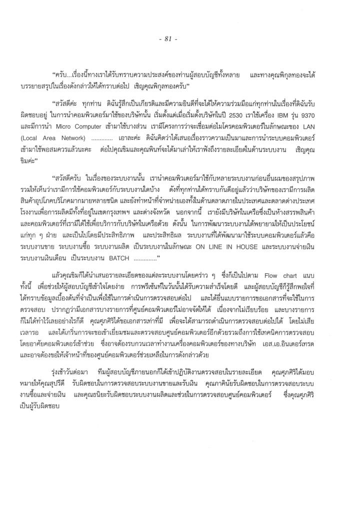 ผมขออภัยในความผิดพลาดของตัวอักษร ทั้งภาษาไทยและภาษาอังกฤษ ที่ผมมักจะพบในภายหลัง จากการพิมพ์และเย็บเล่มเรียบร้อยแล้ว โดยเฉพาะเล่ม 1 ที่มีคําผิดพลาดในการพิมพ์มาก ซึ่งอาจจะเกิดจากการแก้ไขแล้วไม่ได้ save ข้อมูลหลังจากแก้ไขเสร็จ หรือผู้พิมพ์อาจหยิบแผ่น diskette สับสน ทําให้ผ่านขั้นตอนตรวจทานไปได้ เพราะได้พิสูจน์ตัวอักษรว่าถูกต้องแล้ว แต่เมื่อพิมพ์จริงและเย็บเล่มก็ปรากฏข้อผิดพลาดเดิม ๆ อยู่อีก ซึ่งเมื่อถึงขั้นตอนนี้ก็จะแก้ไขไม่ได้ดีเท่าที่ควร จึงขออภัยท่านผู้อ่านไว้ ณ ที่นี้อีกครั้ง และผมขอเน้นอีกครั้งว่า ความ พยายามทั้งหมดในการจัดทําหนังสือชุดนี้ก็เพื่อผลประโยชน์ในการปฏิบัติงานของธนาคารแห่งประเทศไทย สาขาภาคตะวันออกเฉียงเหนือ ในการกํากับและดูแลสถาบันการเงินอีกมุมหนึ่งเป็นสําคัญ - สําหรับผู้ตรวจการธนาคารพาณิชย์ ส่วนกํากับสถาบันการเงินธนาคารแห่งประเทศไทย สาขาภาคตะวันออกเฉียงเหนือรุ่นต่อ ๆ ไป ที่จะนําหนังสือชุดนี้ใช้ในการอบรมหรือพัฒนาผู้ตรวจสอบ โดยเฉพาะอย่างยิ่ง การอบรมการตรวจสอบสถาบันการเงินด้านคอมพิวเตอร์ รวมทั้งการตรวจสอบฐานะการเงิน ความมั่นคงและการดําเนินงานโดยทั่วไป ควรพิจารณาเรื่องที่เกี่ยวเนื่องและสัมพันธ์กันที่อาจปรากฏอยู่ในเล่มต่าง ๆ มาใช้ในคราวเดียวกันด้วย ทั้งนี้ เพราะหนังสือชุดนี้ ได้มีการทบทวนเรื่องที่เกี่ยวข้อง เพื่อให้ผู้ตรวจสอบได้ติดตามในรูปแบบที่ใช้การอธิบายที่แตกต่างกันออกไป แต่โดยรวมเรื่องเหล่านี้จะทําให้ผู้ตรวจสอบเข้าใจงานตรวจสอบทางด้าน IS Audit และ Financial Audit ได้ดีขึ้น