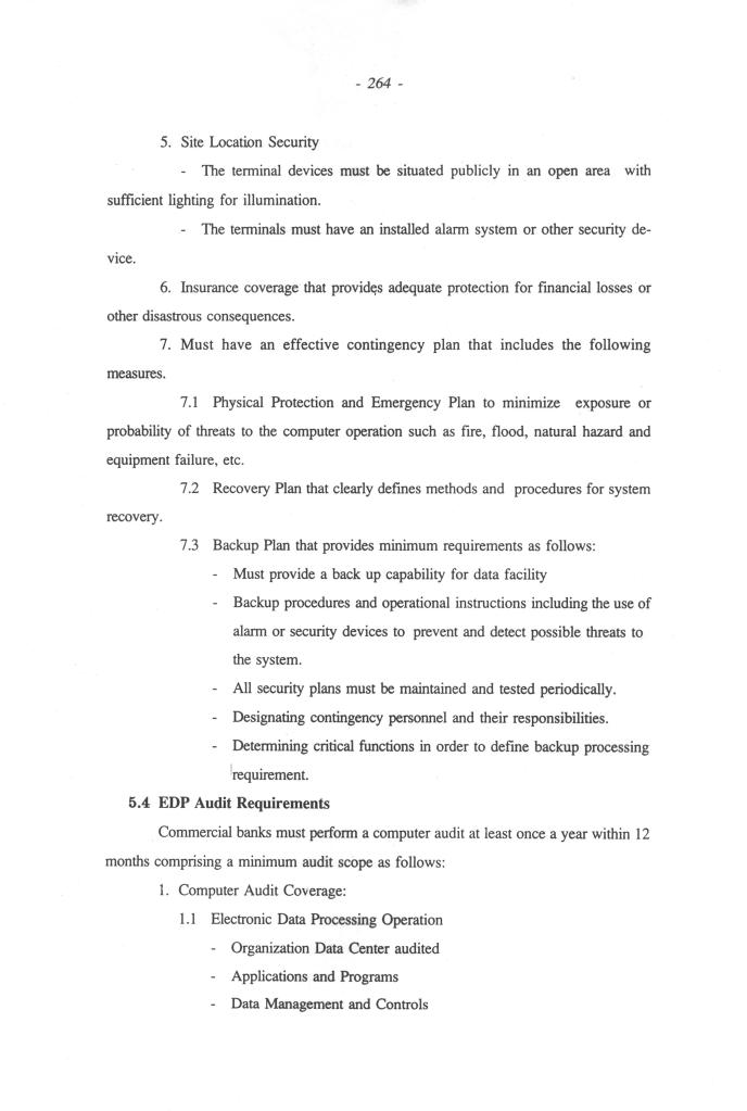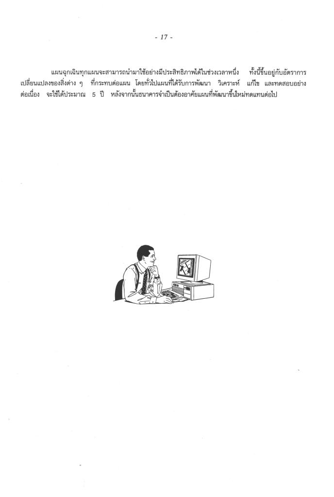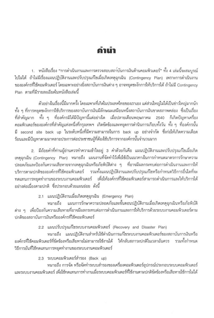 - หนังสือเรื่อง “การดําเนินงานและการตรวจสอบสถาบันการเงินด้านคอมพิวเตอร์” ทั้ง 4 เล่มนี้จะสมบูรณ์ ไปไม่ได้ ถ้าไม่มีเรื่องแผนปฏิบัติงาน และปรับปรุงแก้ไขเมื่อเกิดเหตุฉุกเฉิน (Contingency Plan) เพราะการดําเนินงาน ขององค์กรที่ใช้คอมพิวเตอร์ โดยเฉพาะอย่างยิ่งสถาบันการเงินต่าง ๆ อาจหยุดชะงักการให้บริการได้ ถ้าไม่มี Contingency Plan ตามที่มีรายละเอียดในหนังสือเล่มนี้