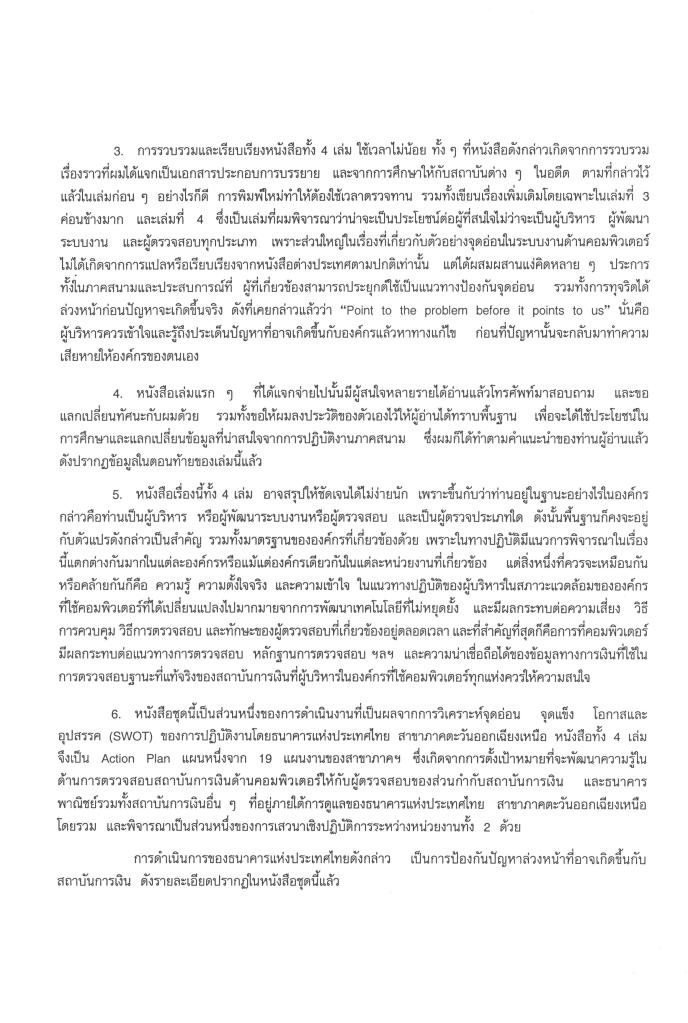 - หนังสือชุดนี้เป็นส่วนหนึ่งของการดําเนินงานที่เป็นผลจากการวิเคราะห์จุดอ่อน จุดแข็ง โอกาสและอุปสรรค (SWOT) ของการปฏิบัติงานโดยธนาคารแห่งประเทศไทย สาขาภาคตะวันออกเฉียงเหนือ หนังสือทั้ง 4 เล่ม จึงเป็น Action Plan แผนหนึ่งจาก 19 แผนงานของสาขาภาคฯ ซึ่งเกิดจากการตั้งเป้าหมายที่จะพัฒนาความรู้ใน ด้านการตรวจสอบสถาบันการเงินด้านคอมพิวเตอร์ ให้กับผู้ตรวจสอบของส่วนกํากับสถาบันการเงิน และธนาคาร
