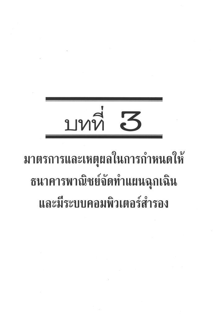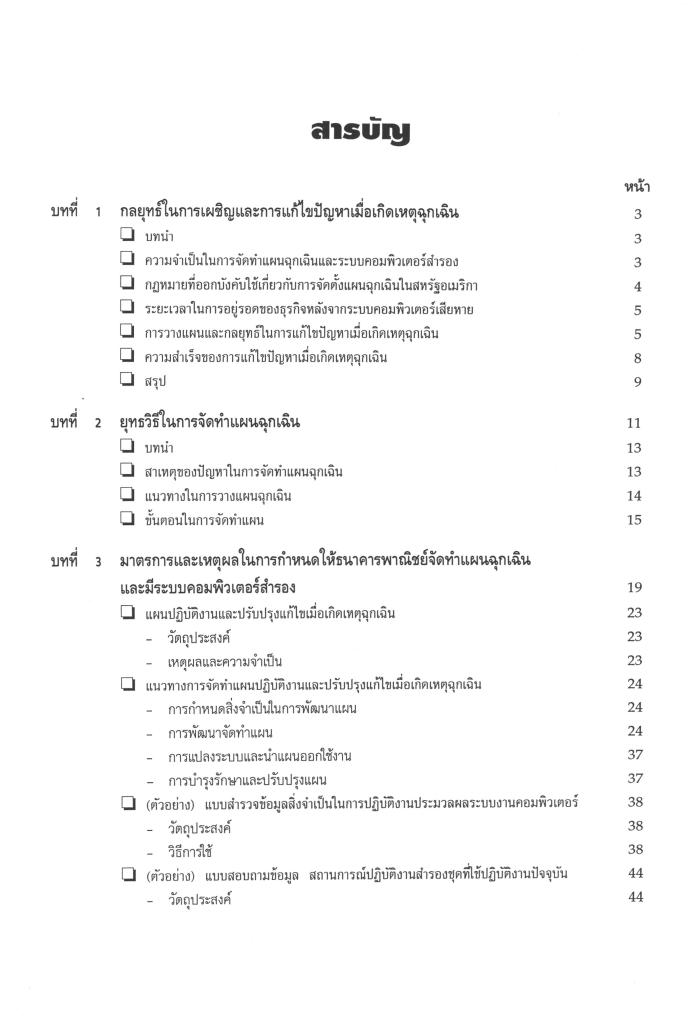 เทคโนโลยีและระบบคอมพิวเตอร์มีบทบาทสำคัญต่อการดำเนินธุรกิจในปัจจุบัน การจัดการความเสี่ยงและการเตรียมพร้อมรับมือกับเหตุฉุกเฉินกลายเป็นหัวใจสำคัญขององค์กร โดยเฉพาะในสถาบันการเงินที่ความต่อเนื่องในการดำเนินงานมีความสำคัญสูงสุด หนังสือ การดำเนินงานและการตรวจสอบทางด้านคอมพิวเตอร์ เล่ม 4 นี้ มุ่งเน้นเรื่อง “คอมพิวเตอร์กับแผนฉุกเฉิน” ซึ่งครอบคลุมเนื้อหาตั้งแต่การวางแผนฉุกเฉิน (Contingency Plan) ไปจนถึงกรณีศึกษาที่สามารถประยุกต์ใช้ได้จริง