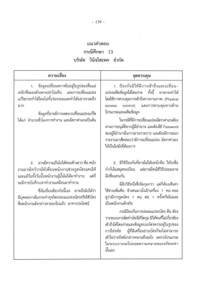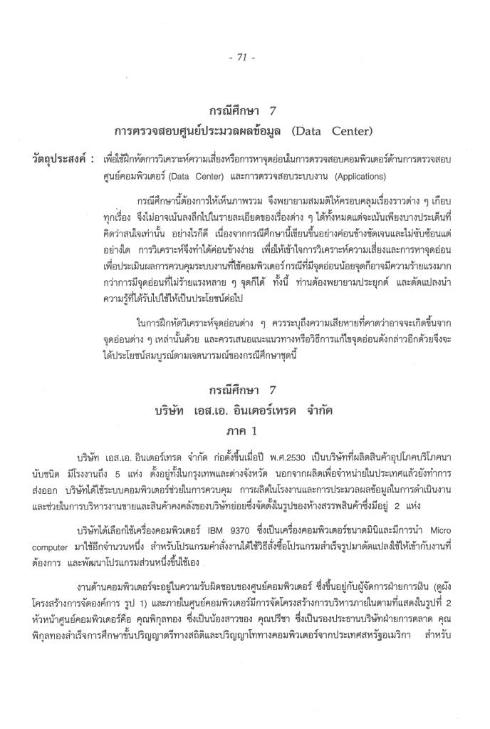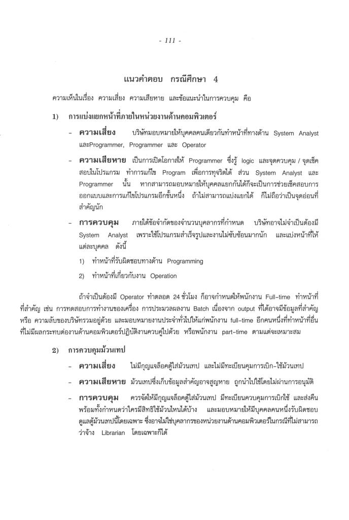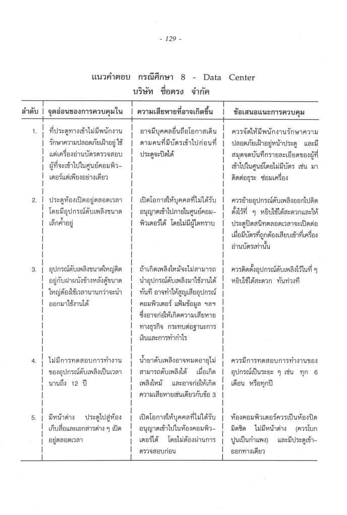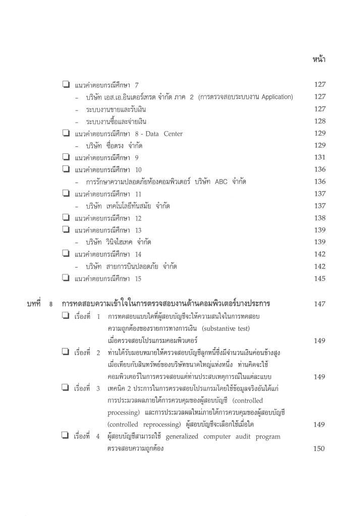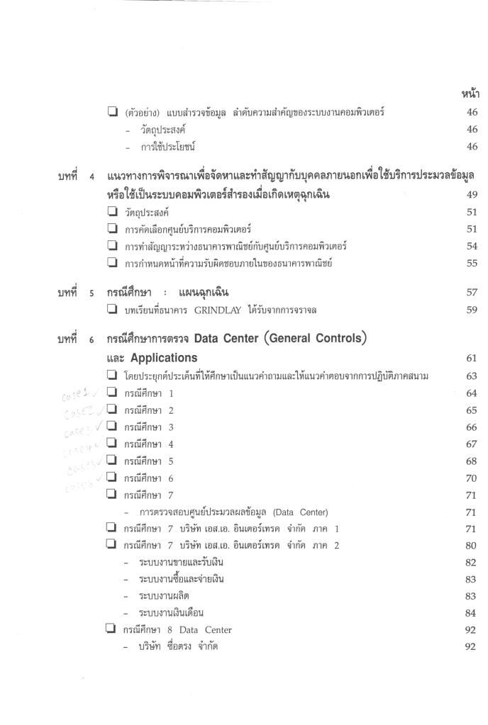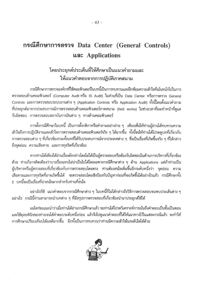 - หนังสือเล่ม 4 นี้ ได้ทํากรณีศึกษาการตรวจสอบ Data Center (General Controls) และการตรวจสอบ “งาน” (Application Controls) เพียงบางกรณี พร้อมแนวคําตอบจากการจัดทํากรณีศึกษาภาคสนามให้ท่านผู้สนใจได้ทบทวนอีกครั้ง โดยเฉพาะอย่างยิ่งผู้ตรวจสอบด้านคอมพิวเตอร์ (IS Auditor) รวมทั้งผู้ตรวจสอบโดยทั่วไป