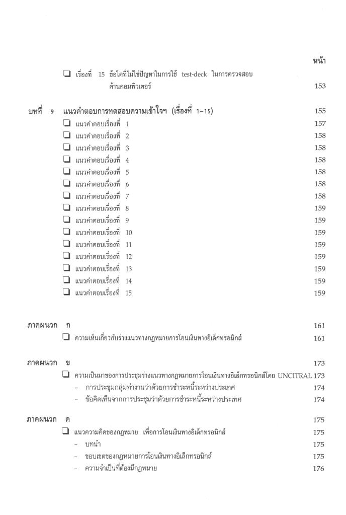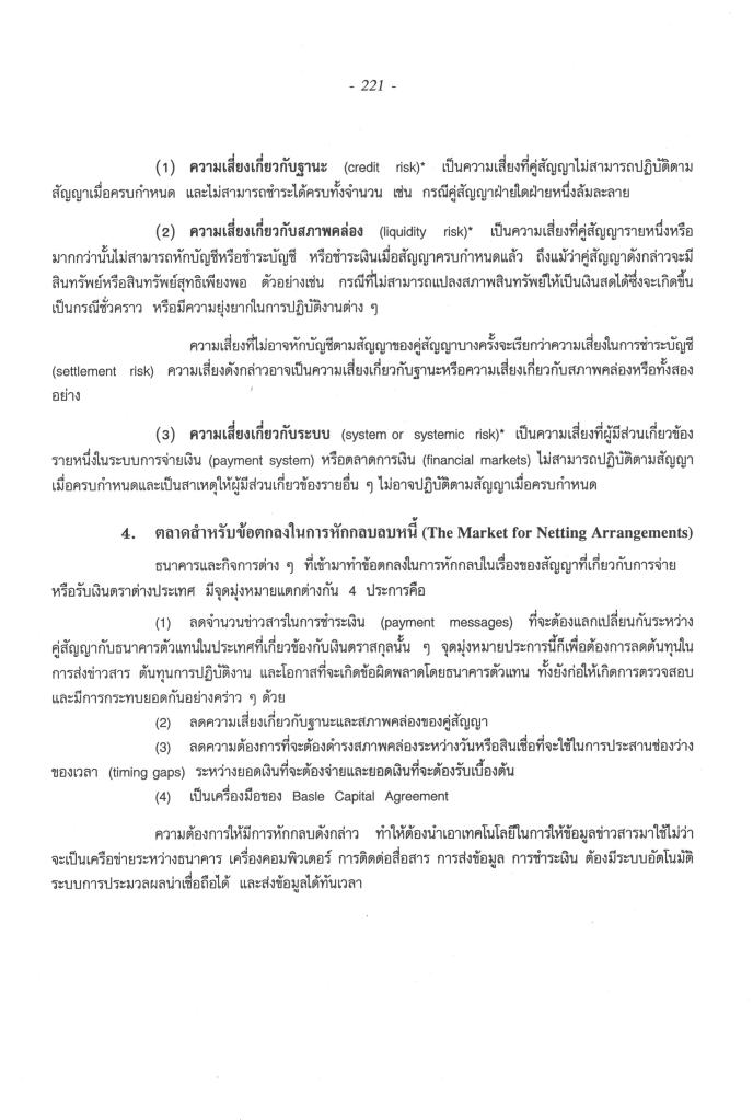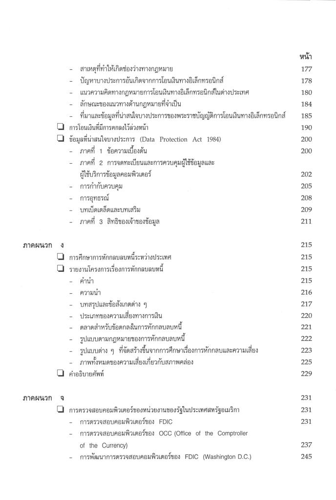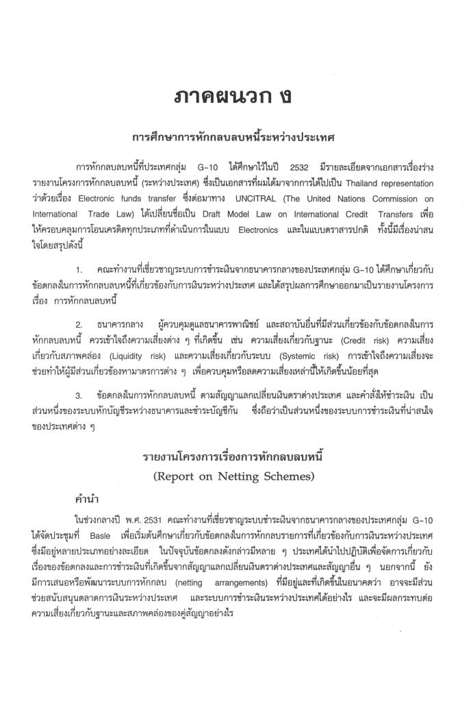 - ในภาคผนวกของเล่มนี้ ได้เรียบเรียงความเห็นเกี่ยวกับการร่างแนวทางกฎหมายการโอนเงินทางอิเล็กทรอนิกส์ในช่วงที่ผมและคณะได้ศึกษากันมานานพอสมควร รวมทั้งความเป็นมาของการประชุมร่างกฎหมายดังกล่าว และการศึกษาการหักกลบลบหนี้ (Netting) ระหว่างประเทศ ที่น่าสนใจในยุคปัจจุบันอยู่ด้วย