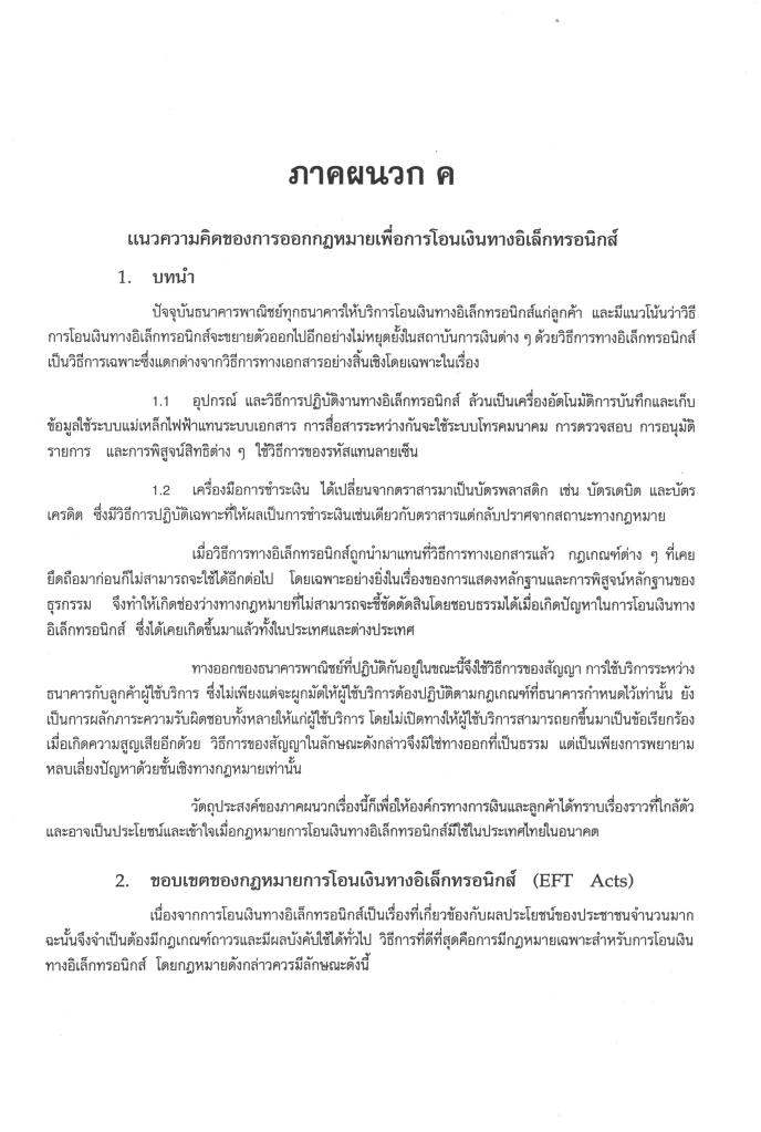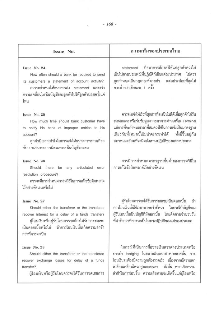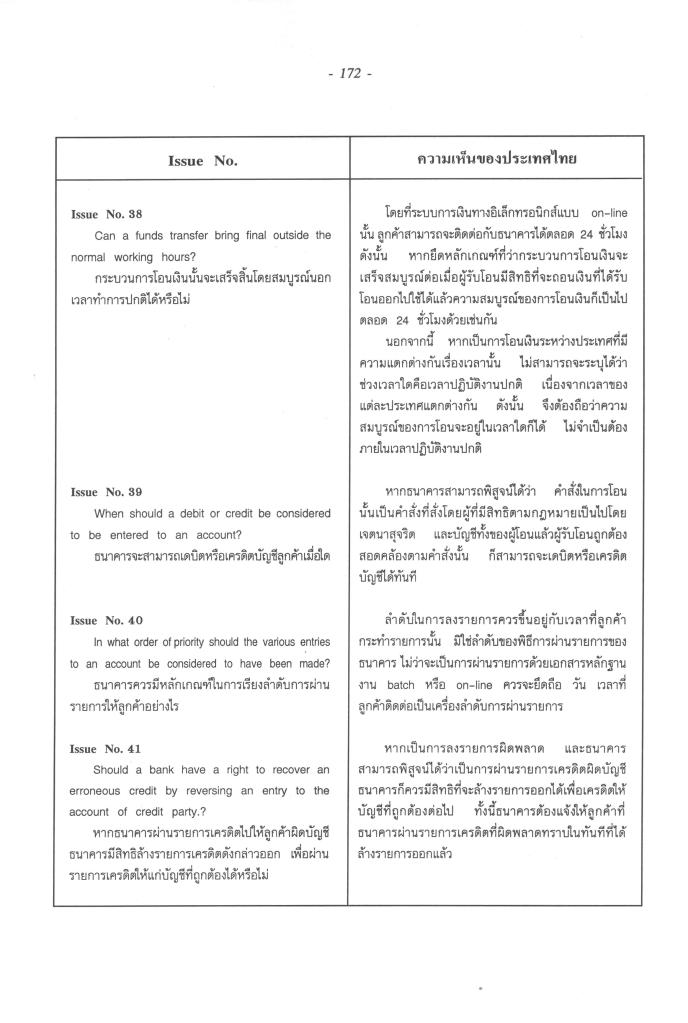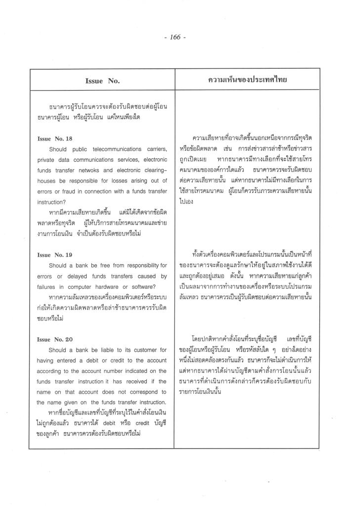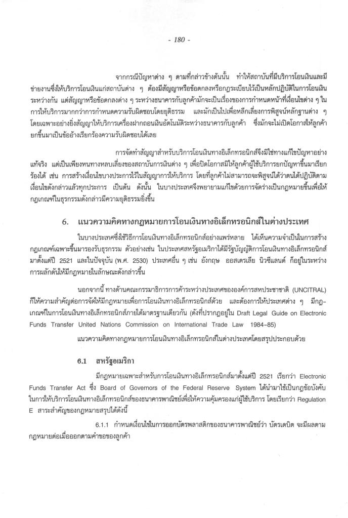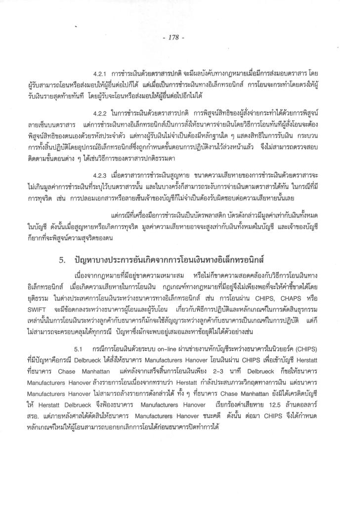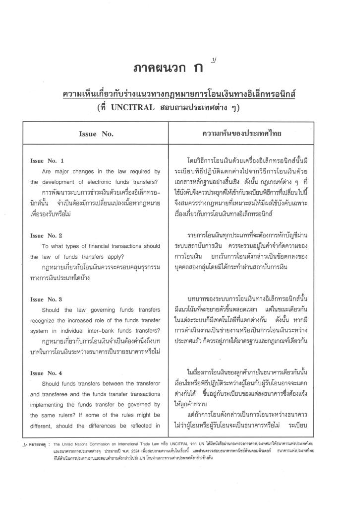 การดําเนินการของธนาคารแห่งประเทศไทยดังกล่าว เป็นการป้องกันปัญหาล่วงหน้าที่อาจเกิดขึ้นกับสถาบันการเงิน ดังรายละเอียดปรากฏในหนังสือชุดนี้แล้ว - จากการที่ผ่านมาผมมีโอกาสเป็นผู้แทนของไทยไปร่วมการประชุมที่องค์กรสหประชาชาติ (UN) ที่ New York ในปี 2532 เรื่อง Draft Model Law on International Credit Transfers ซึ่งเดิมใช้ชื่อว่า Model Rules on Electronic Funds Transfer การเปลี่ยนแปลงชื่อเรื่องดังกล่าวก็เพื่อให้ครอบคลุมร่างกฎหมายการโอนเงินทั้งทาง อิเล็กทรอนิกส์และการโอนเงินแบบธรรมดา (ถ้ามี) ได้ หนังสือเล่ม 4 นี้จึงมีภาคผนวกที่เกี่ยวข้องรวบรวมไว้ให้ท่านผู้อ่านได้อ่านในเรื่องนี้โดยสังเขป