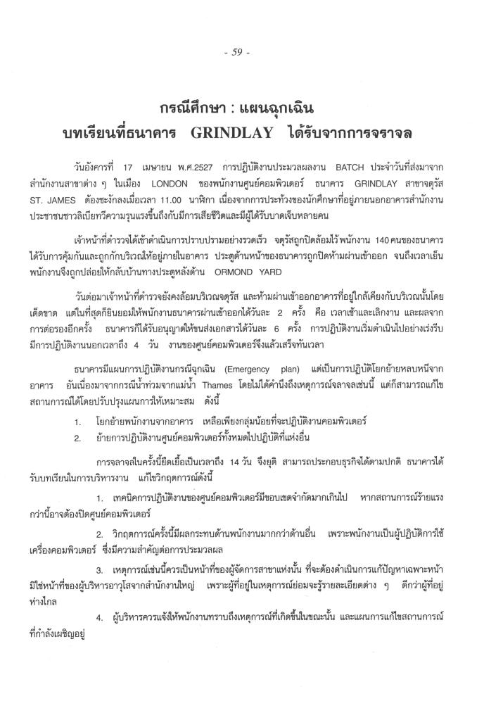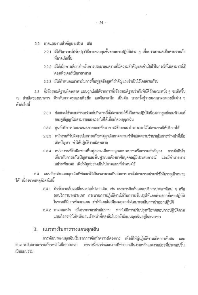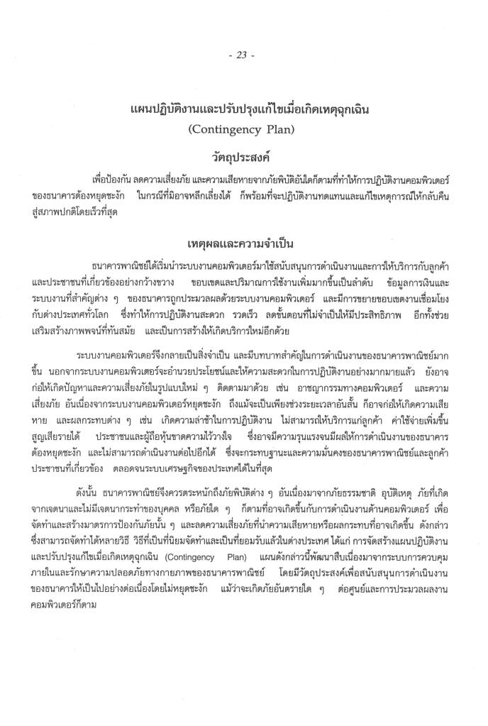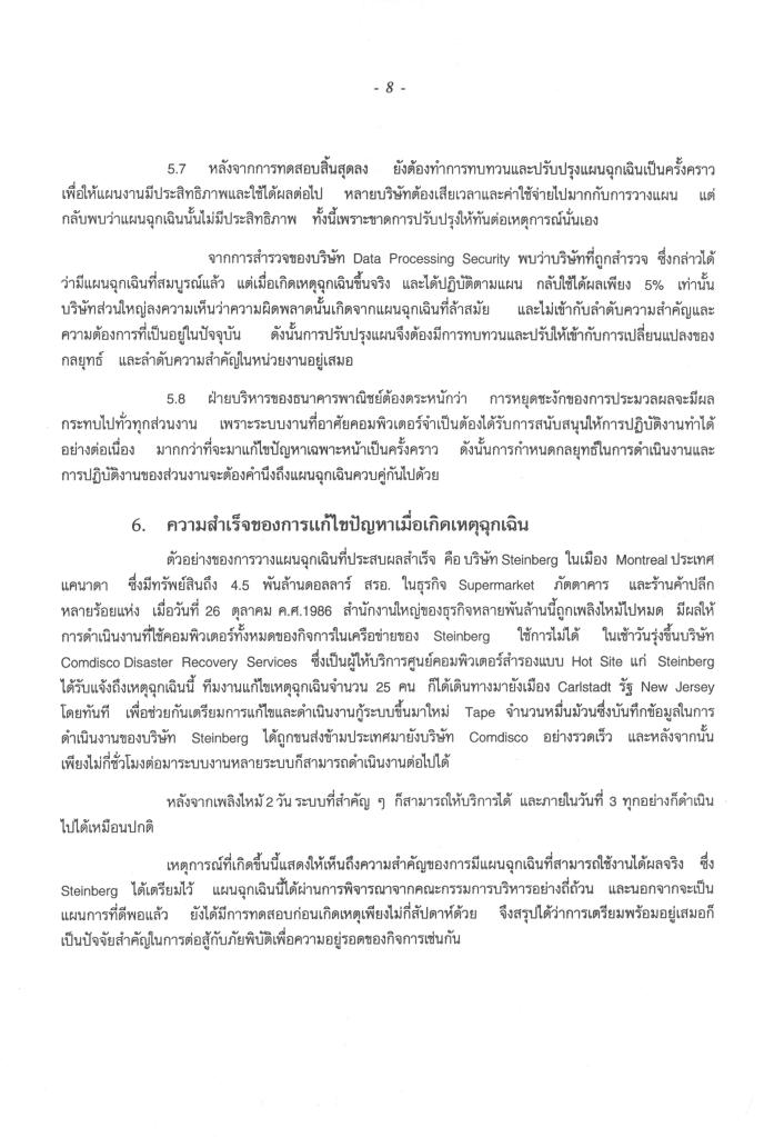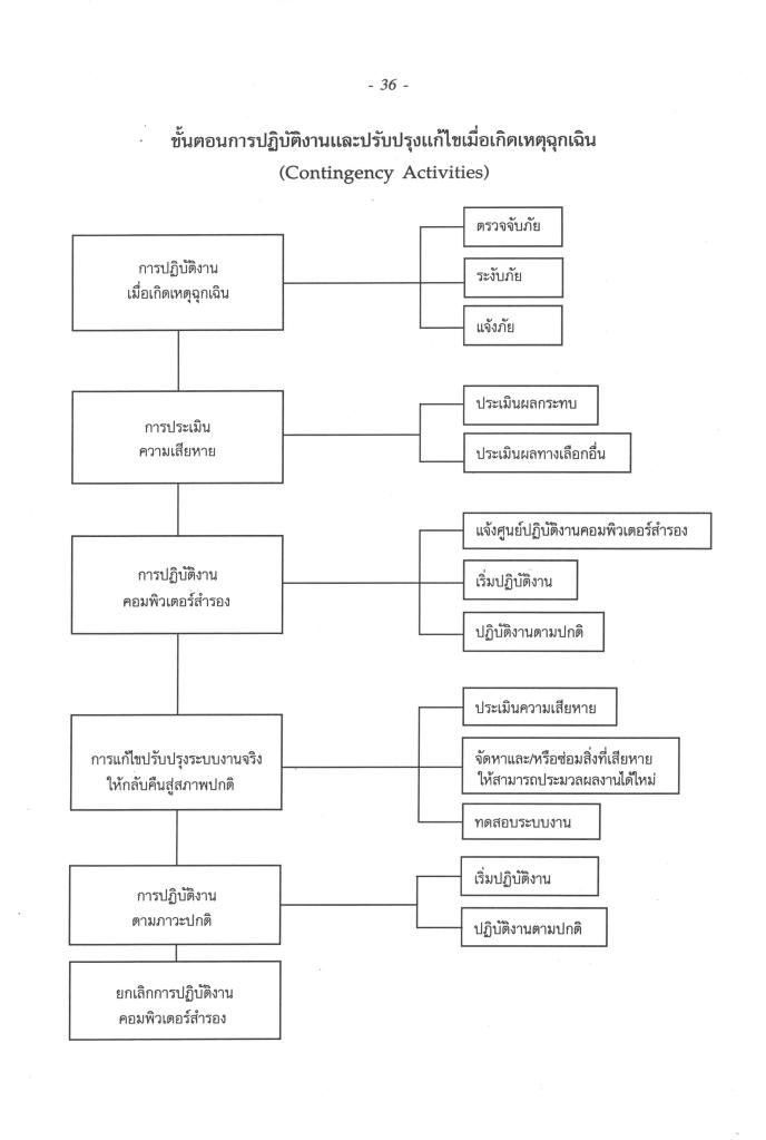 ตัวอย่างในเรื่องนี้มีมากครั้ง โดยเฉพาะที่เกิดในประเทศไทยของเราเอง แต่ส่วนใหญ่ไม่ได้เป็นข่าวใหญ่มากนัก ทั้ง ๆ ที่การหยุดชะงักการใช้บริการของสถาบันการเงิน มีลักษณะเสมือนหนึ่งสถาบันการเงินขาดสภาพคล่อง ซึ่งเป็นเรื่องที่สําคัญมาก ทั้ง ๆ ที่องค์กรมิได้มีปัญหานี้แต่อย่างใด เมื่อปลายเดือนพฤษภาคม 2540 ก็เกิดปัญหาเครื่องคอมพิวเตอร์ขององค์กรที่สําคัญแห่งหนึ่งที่กรุงเทพฯ เกิดขัดข้องและหยุดการดํานินการเกือบทั้งวัน ทั้ง ๆ ที่องค์กรนั้น มี second site back up ในระดับหนึ่งที่มีความสามารถในการ back up อย่างจํากัด ซึ่งก่อให้เกิดความเดือดร้อนและมีปัญหาตามมาหลายประการต่อประชาชนผู้ที่ต้องใช้บริการจากองค์กรนั้นจํานวนมาก - มีถ้อยคําที่ท่านผู้อ่านควรทําความเข้าใจอยู่ 3 คําด้วยกันคือ แผนปฏิบัติงานและปรับปรุงแก้ไขเมื่อเกิดเหตุฉุกเฉิน (Contingency Plan) หมายถึง แผนงานที่จัดทําไว้เพื่อใช้เป็นแนวทางในการกําหนดมาตรการรักษาความ ปลอดภัย และป้องกันความเสียหายจากเหตุฉุกเฉิน หรือภัยพิบัติต่าง ๆ ที่อาจมีผลกระทบต่อการดําเนินงานและการให้บริการตามปกติขององค์กรที่ใช้คอมพิวเตอร์ รวมทั้งแผนปฏิบัติงานและปรับปรุงแก้ไข หรือกําหนดวิธีการอื่นใดที่จะทดแทนการหยุดทํางานของระบบงานคอมพิวเตอร์ เพื่อให้องค์กรที่ใช้คอมพิวเตอร์สามารถดําเนินการและให้บริการได้อย่างต่อเนื่องตามปกติ ซึ่งประกอบด้วยแผนย่อย ดังนี้