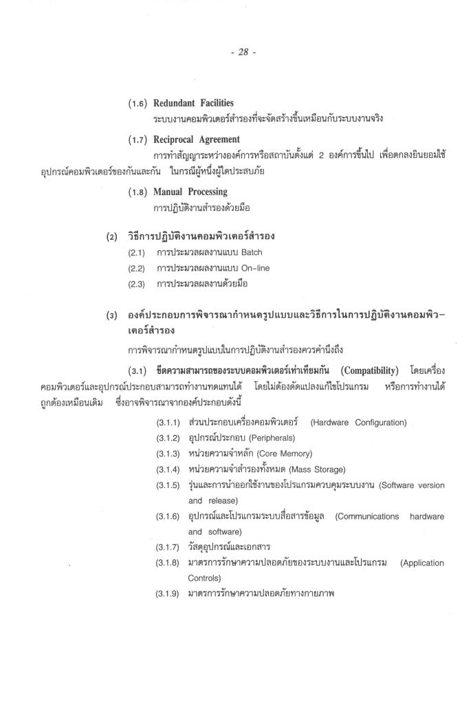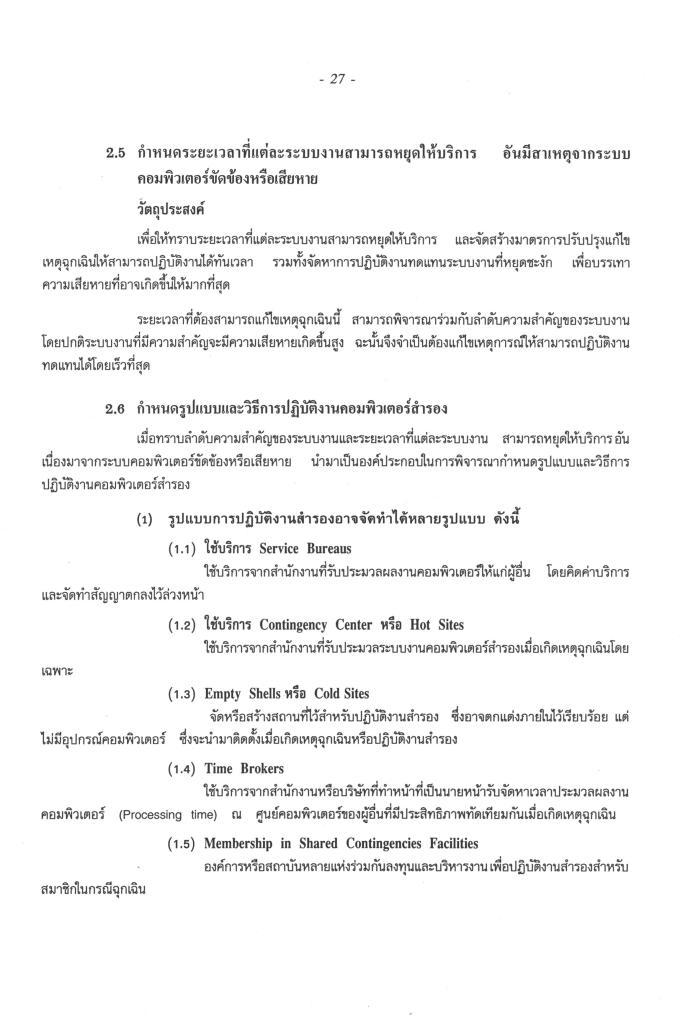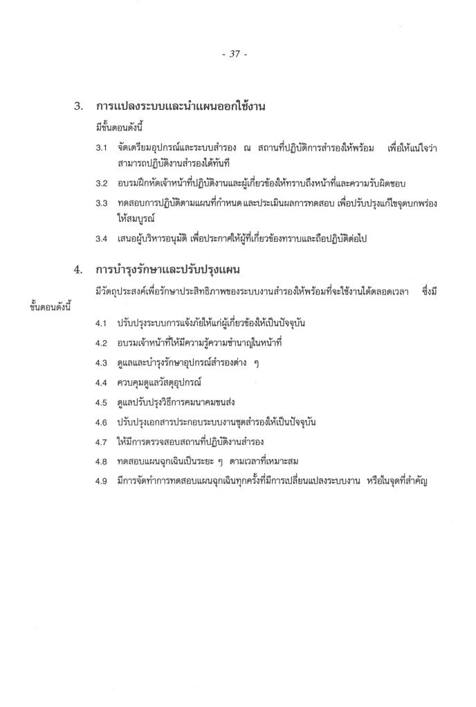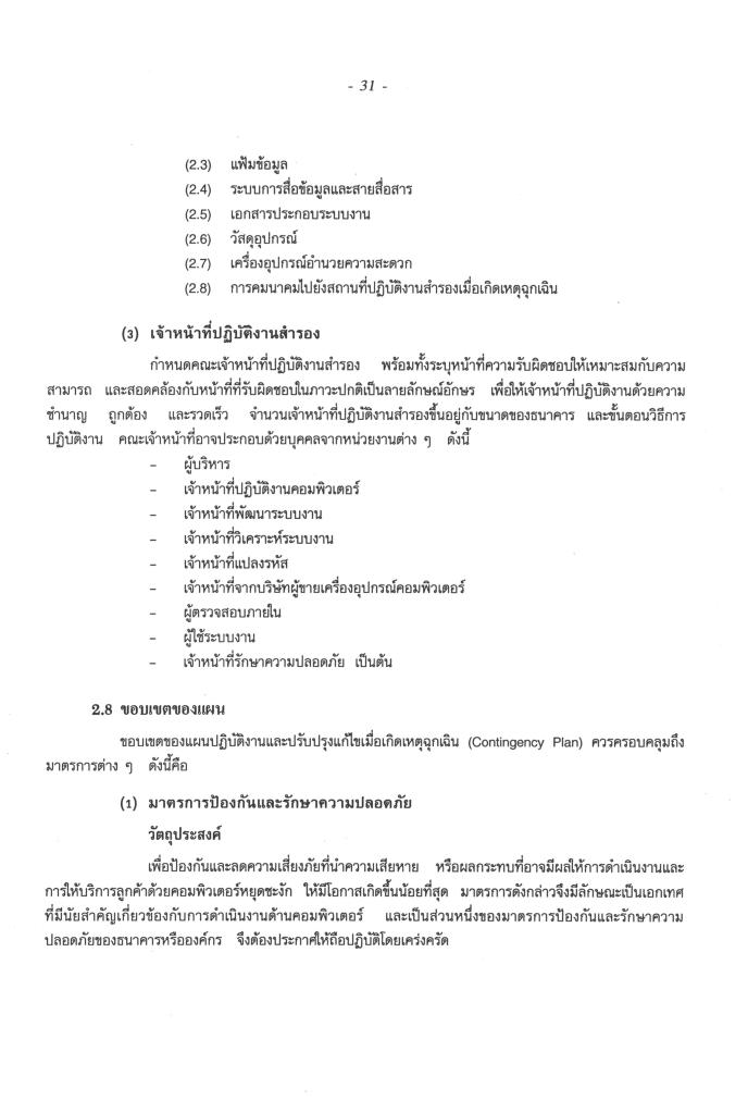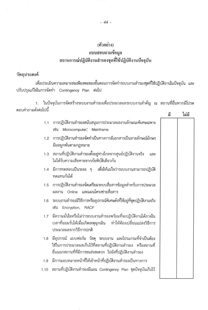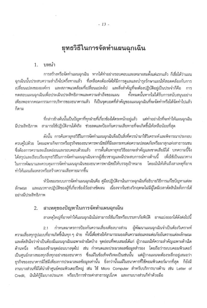ตัวอย่างในเรื่องนี้มีมากครั้ง โดยเฉพาะที่เกิดในประเทศไทยของเราเอง แต่ส่วนใหญ่ไม่ได้เป็นข่าวใหญ่มากนัก ทั้ง ๆ ที่การหยุดชะงักการใช้บริการของสถาบันการเงิน มีลักษณะเสมือนหนึ่งสถาบันการเงินขาดสภาพคล่อง ซึ่งเป็นเรื่องที่สําคัญมาก ทั้ง ๆ ที่องค์กรมิได้มีปัญหานี้แต่อย่างใด เมื่อปลายเดือนพฤษภาคม 2540 ก็เกิดปัญหาเครื่องคอมพิวเตอร์ขององค์กรที่สําคัญแห่งหนึ่งที่กรุงเทพฯ เกิดขัดข้องและหยุดการดํานินการเกือบทั้งวัน ทั้ง ๆ ที่องค์กรนั้น มี second site back up ในระดับหนึ่งที่มีความสามารถในการ back up อย่างจํากัด ซึ่งก่อให้เกิดความเดือดร้อนและมีปัญหาตามมาหลายประการต่อประชาชนผู้ที่ต้องใช้บริการจากองค์กรนั้นจํานวนมาก - มีถ้อยคําที่ท่านผู้อ่านควรทําความเข้าใจอยู่ 3 คําด้วยกันคือ แผนปฏิบัติงานและปรับปรุงแก้ไขเมื่อเกิดเหตุฉุกเฉิน (Contingency Plan) หมายถึง แผนงานที่จัดทําไว้เพื่อใช้เป็นแนวทางในการกําหนดมาตรการรักษาความ ปลอดภัย และป้องกันความเสียหายจากเหตุฉุกเฉิน หรือภัยพิบัติต่าง ๆ ที่อาจมีผลกระทบต่อการดําเนินงานและการให้บริการตามปกติขององค์กรที่ใช้คอมพิวเตอร์ รวมทั้งแผนปฏิบัติงานและปรับปรุงแก้ไข หรือกําหนดวิธีการอื่นใดที่จะทดแทนการหยุดทํางานของระบบงานคอมพิวเตอร์ เพื่อให้องค์กรที่ใช้คอมพิวเตอร์สามารถดําเนินการและให้บริการได้อย่างต่อเนื่องตามปกติ ซึ่งประกอบด้วยแผนย่อย ดังนี้