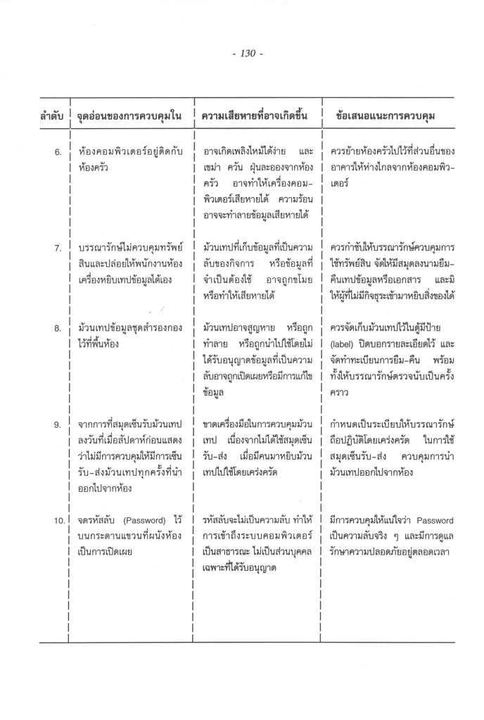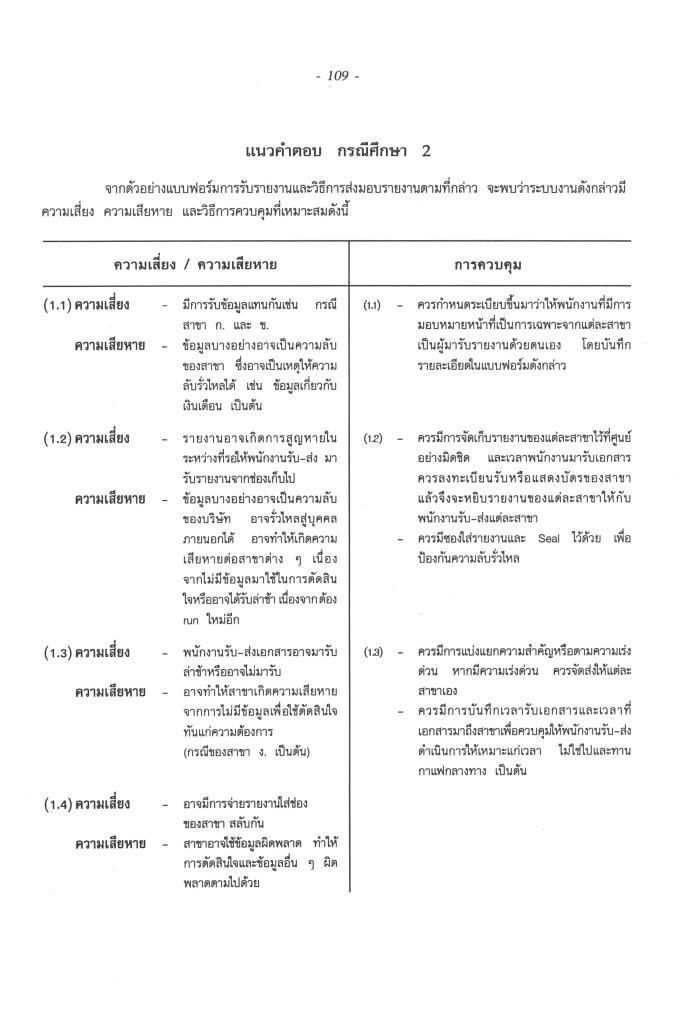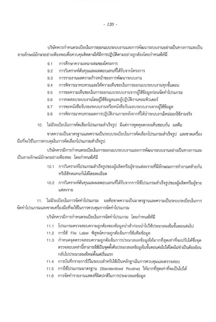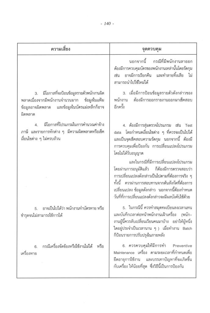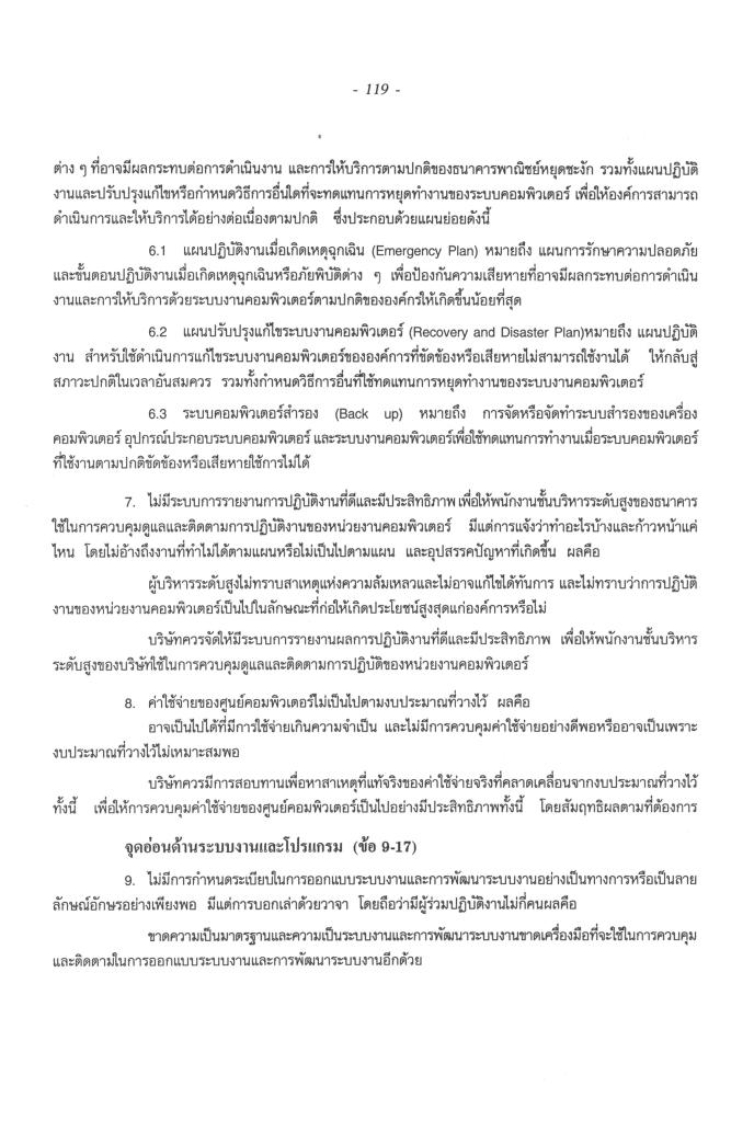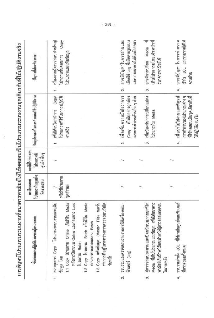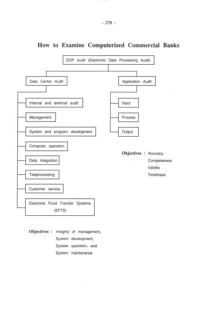 เพื่อวัดประสิทธิภาพและประสิทธิผลของการควบคุมภายใน และความน่าเชื่อถือของข้อมูลทางการเงิน ที่เป็นรายละเอียดในภาคปฏิบัติ การแยกเล่มเพิ่มเติมก็เพื่อให้การจัดพิมพ์หนังสือแต่ละเล่มมีความหนาและแยกเป็นเรื่องๆ ที่เหมาะสม หนังสือทั้ง 4 เล่ม ได้จัดทําขึ้นโดยมีวัตถุประสงค์เพื่อให้การศึกษาในวงจํากัดต่อผู้ตรวจสอบ ในส่วนกํากับสถาบันการเงิน ธนาคารแห่งประเทศ สาขาภาคตะวันออกเฉียงเหนือ และสถาบันการเงินอื่น ๆ เพื่อการศึกษา การพัฒนา การบริหารงาน และการตรวจสอบสถาบันการเงินด้านคอมพิวเตอร์หรือองค์กรที่ใช้คอมพิวเตอร์ ซึ่งจะช่วยให้สถาบันการเงินภายใต้การดูแลของธนาคารแห่งประเทศไทยมีความมั่นคงได้อีกทางหนึ่ง และจะเป็นการพัฒนาบุคคลากรที่เกี่ยวข้องเรื่องนี้ ให้ก้าวทันกับเทคโนโลยีทางคอมพิวเตอร์ที่มีผลกระทบต่อความเสี่ยงใหม่ ๆ ซึ่งต้องการการควบคุม รวมทั้งวิธีการตรวจสอบใหม่ ๆ ให้สอดคล้องกับวิธีการประมวลผลโดยใช้คอมพิวเตอร์ที่ทันสมัยเหล่านั้น - มีความเป็นไปได้ที่ธนาคารแห่งประเทศไทยจะให้สถาบันการเงินที่ใช้คอมพิวเตอร์ รวมทั้งผู้สอบบัญชี (External auditor) และผู้สอบบัญชีภายใน (Internal auditor) ของสถาบันการเงินมีความรับผิดชอบในการเป็นผู้ดูแล การบริหารงาน และการตรวจสอบงานด้านคอมพิวเตอร์ แทนการตรวจสอบงานด้านนี้ของธนาคารแห่งประเทศไทยมากขึ้น