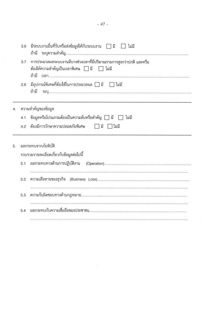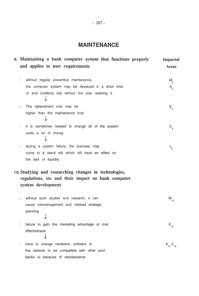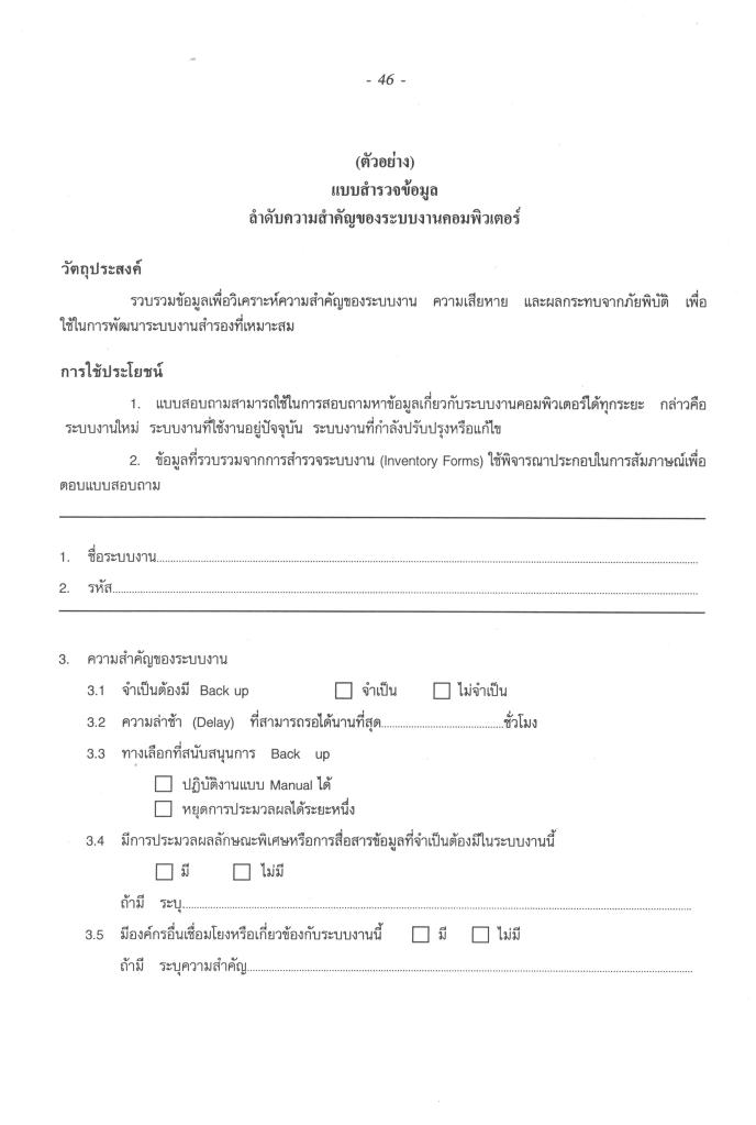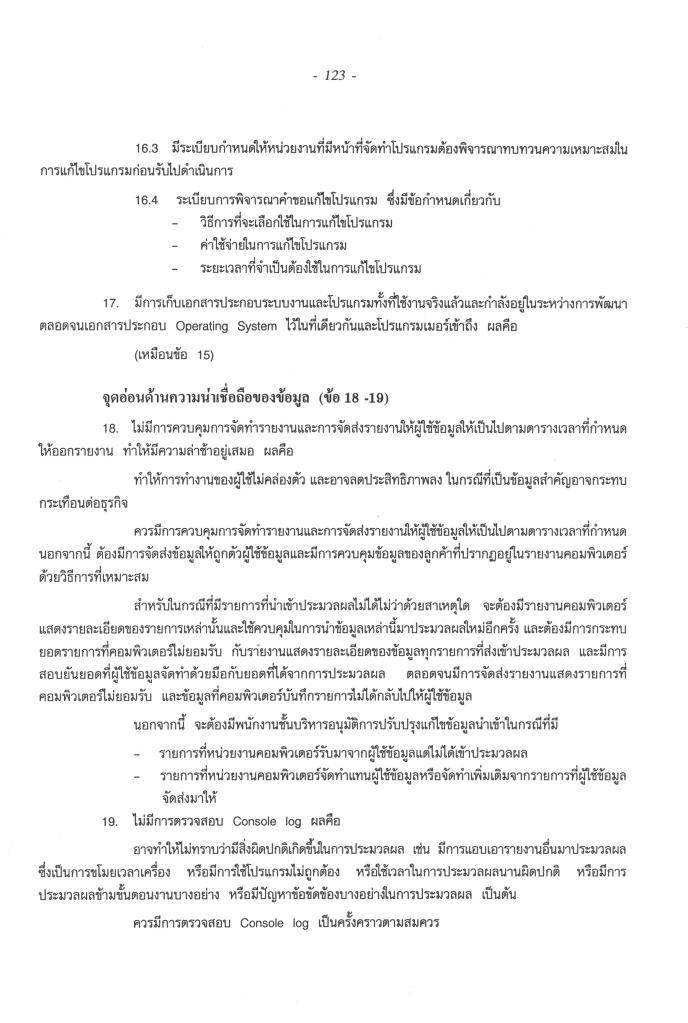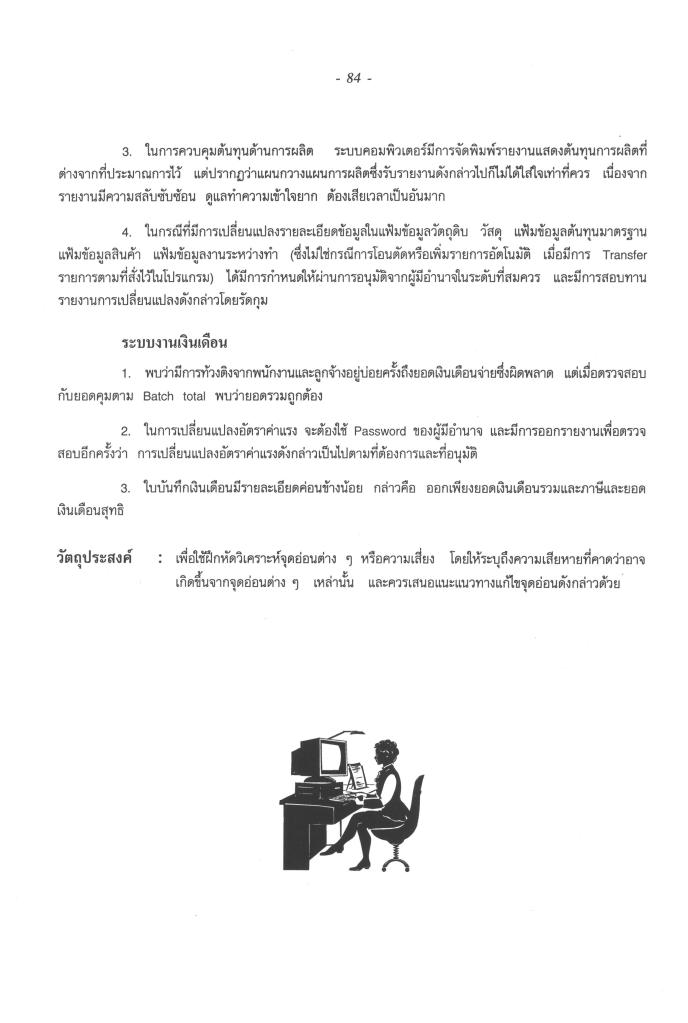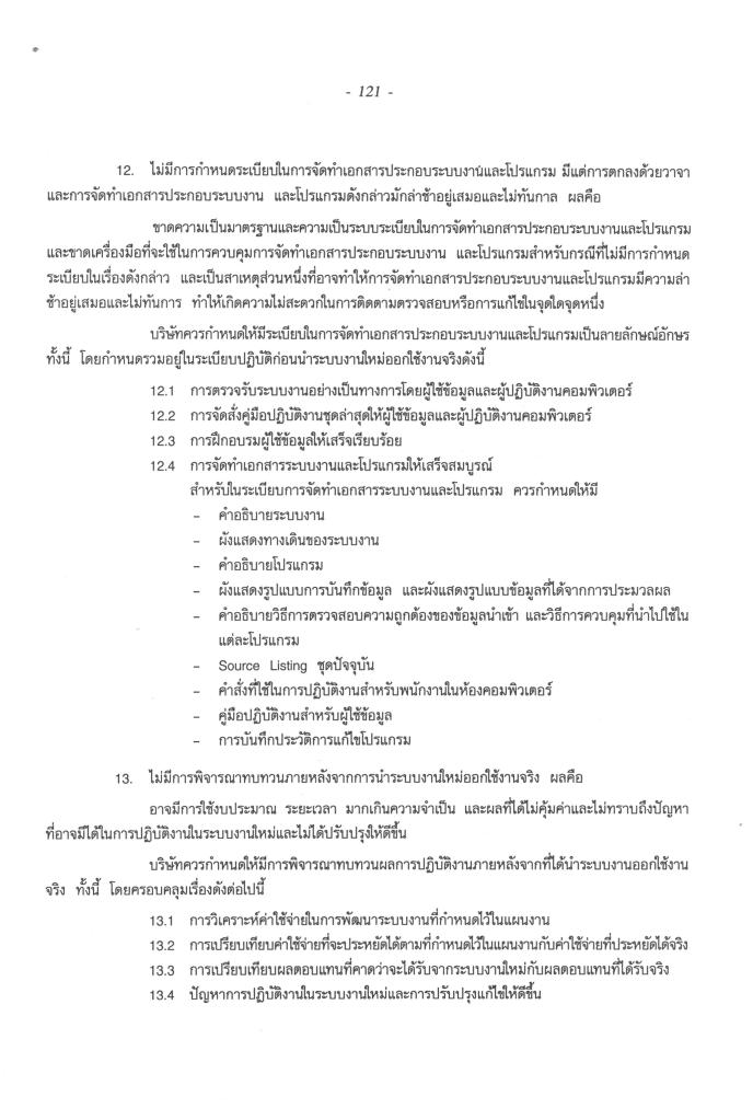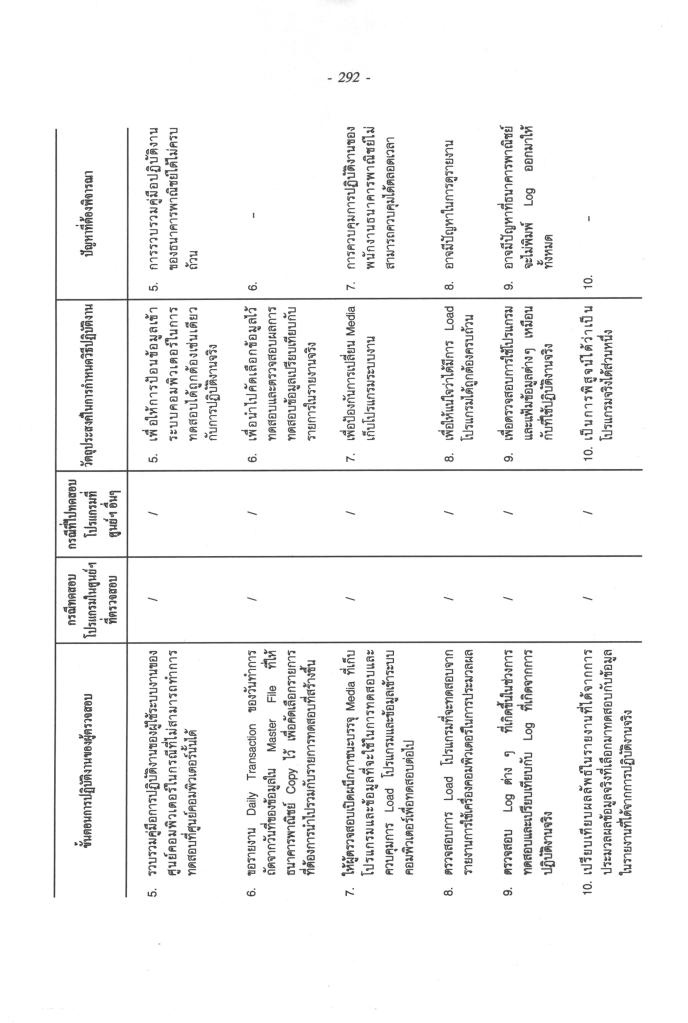 เพื่อวัดประสิทธิภาพและประสิทธิผลของการควบคุมภายใน และความน่าเชื่อถือของข้อมูลทางการเงิน ที่เป็นรายละเอียดในภาคปฏิบัติ การแยกเล่มเพิ่มเติมก็เพื่อให้การจัดพิมพ์หนังสือแต่ละเล่มมีความหนาและแยกเป็นเรื่องๆ ที่เหมาะสม หนังสือทั้ง 4 เล่ม ได้จัดทําขึ้นโดยมีวัตถุประสงค์เพื่อให้การศึกษาในวงจํากัดต่อผู้ตรวจสอบ ในส่วนกํากับสถาบันการเงิน ธนาคารแห่งประเทศ สาขาภาคตะวันออกเฉียงเหนือ และสถาบันการเงินอื่น ๆ เพื่อการศึกษา การพัฒนา การบริหารงาน และการตรวจสอบสถาบันการเงินด้านคอมพิวเตอร์หรือองค์กรที่ใช้คอมพิวเตอร์ ซึ่งจะช่วยให้สถาบันการเงินภายใต้การดูแลของธนาคารแห่งประเทศไทยมีความมั่นคงได้อีกทางหนึ่ง และจะเป็นการพัฒนาบุคคลากรที่เกี่ยวข้องเรื่องนี้ ให้ก้าวทันกับเทคโนโลยีทางคอมพิวเตอร์ที่มีผลกระทบต่อความเสี่ยงใหม่ ๆ ซึ่งต้องการการควบคุม รวมทั้งวิธีการตรวจสอบใหม่ ๆ ให้สอดคล้องกับวิธีการประมวลผลโดยใช้คอมพิวเตอร์ที่ทันสมัยเหล่านั้น - มีความเป็นไปได้ที่ธนาคารแห่งประเทศไทยจะให้สถาบันการเงินที่ใช้คอมพิวเตอร์ รวมทั้งผู้สอบบัญชี (External auditor) และผู้สอบบัญชีภายใน (Internal auditor) ของสถาบันการเงินมีความรับผิดชอบในการเป็นผู้ดูแล การบริหารงาน และการตรวจสอบงานด้านคอมพิวเตอร์ แทนการตรวจสอบงานด้านนี้ของธนาคารแห่งประเทศไทยมากขึ้น