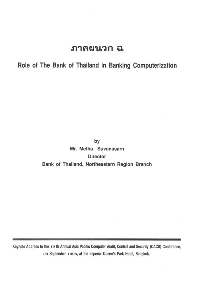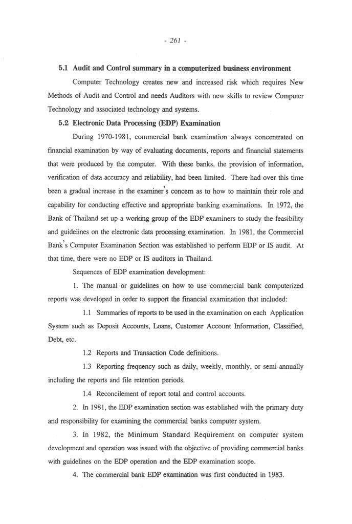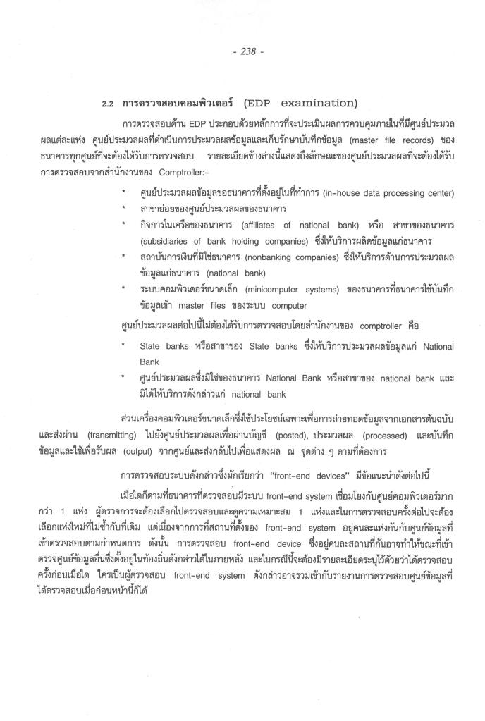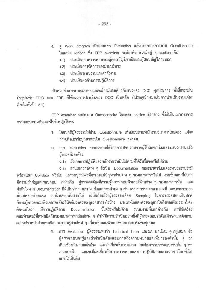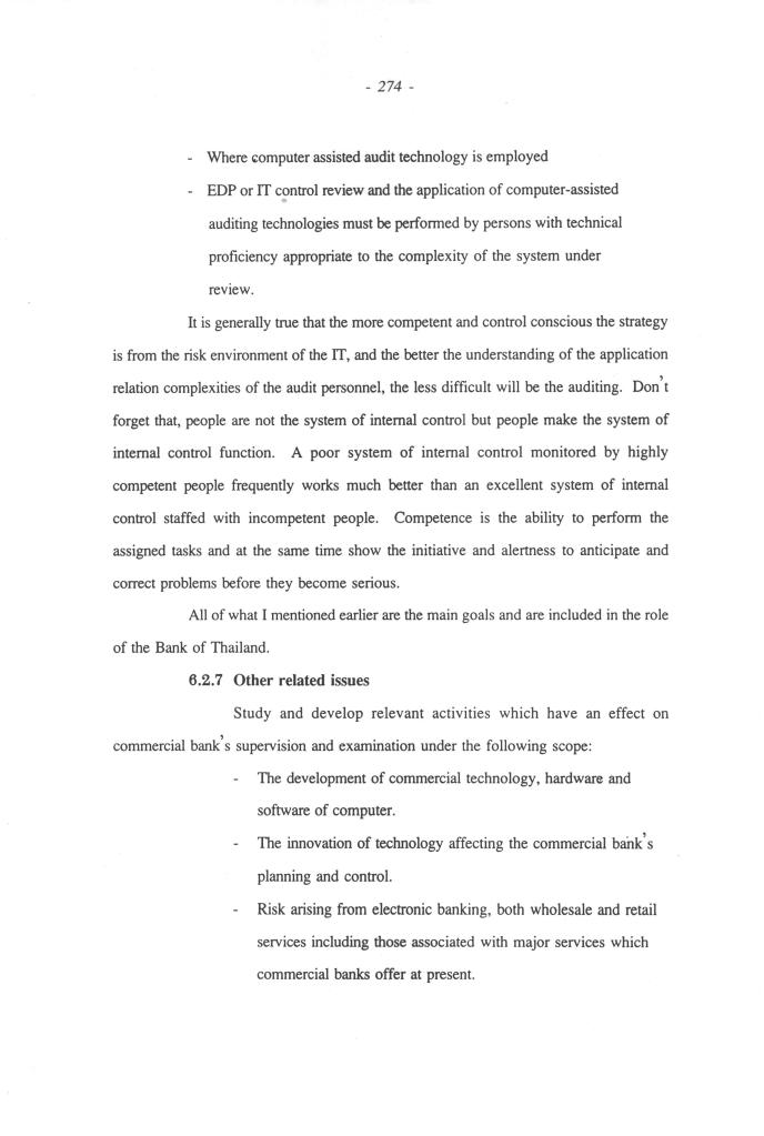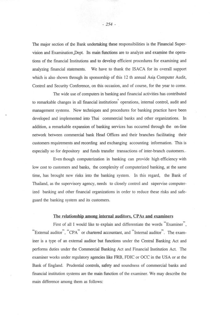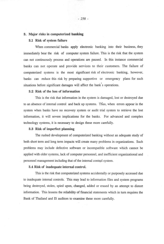 - การดําเนินงาน การบริหารงานและการตรวจสอบงานด้านคอมพิวเตอร์ก็เป็นอีกรูปแบบหนึ่งของงานที่มีความเสี่ยง ตามที่ผมได้กล่าวไว้แล้วในหนังสือชุดนี้ และเมื่อวันที่ 23 เมษายน 2540 ผมก็ได้รับข่าวสารทาง E-mail จาก Mr.David G. Rowley ซึ่งเป็นทั้งผู้ตรวจสอบและผู้บริหารอาวุโสทางด้าน IS examination จาก Federal Reserve Bank of Minneapolis, Minnesota ประเทศสหรัฐอเมริกา ขอให้จัดส่งแนวทางการจัดการและการบริหารการตรวจสอบ ตลอดจนการควบคุมของทางการ ทางด้านคอมพิวเตอร์ของประเทศไทยในปัจจุบันและในปี ค.ศ. 2000 หรือ IT 2000 ไปให้ทราบ เพื่อใช้ประกอบการบรรยายเรื่องนี้ในประเทศสหรัฐอเมริกาด้วย ในเดือนมิถุนายน 2540 เพราะ Mr.David ได้รับมอบหมายให้บรรยายให้กับผู้บริหารของ FFIEC ซึ่งประกอบไปด้วย FRB, FDIC และ OCC รวมทั้งสมาคม ผู้ตรวจสอบงานคอมพิวเตอร์ (ISACA) ภาคพื้นกรุงเทพฯ ก็จะจัดให้มีการอภิปรายในหัวข้อทํานองเดียวกันนี้ ในวันที่ 27 มิถุนายน 2540 ด้วย ทําให้ผมไม่แน่ใจว่าทางการในประเทศไทย ยังจะควรมีบทบาทในการควบคุม กํากับ ดูแล สถาบันการเงินทางด้านคอมพิวเตอร์มากน้อย หรือควรลดลงอย่างไร เพราะขณะที่ทางการของประเทศสหรัฐอเมริกา และประเทศที่พัฒนาแล้วยังให้ความสนใจในการดําเนินงานด้านคอมพิวเตอร์ของสถาบันการเงินต่าง ๆ แต่สําหรับธนาคารแห่งประเทศไทยอาจมีแนวโน้มที่จะสนใจทางด้านความเสี่ยงใหม่ ๆ ที่มีผลกระทบต่อเสถียรภาพของสถาบันการเงินอย่างอื่นที่มีความสําคัญมากกว่า อย่างไรก็ดี ผู้บริหารองค์กรที่ใช้คอมพิวเตอร์ทุกแห่งก็ควรให้ความสําคัญในเรื่องการควบคุมความเสี่ยง โดยการพัฒนา IS Audit ต่อไปอย่างไม่หยุดยั้ง