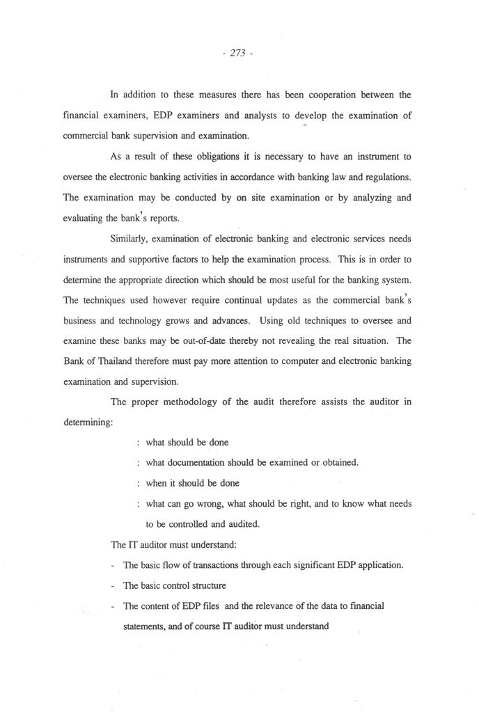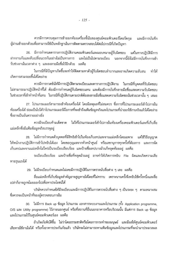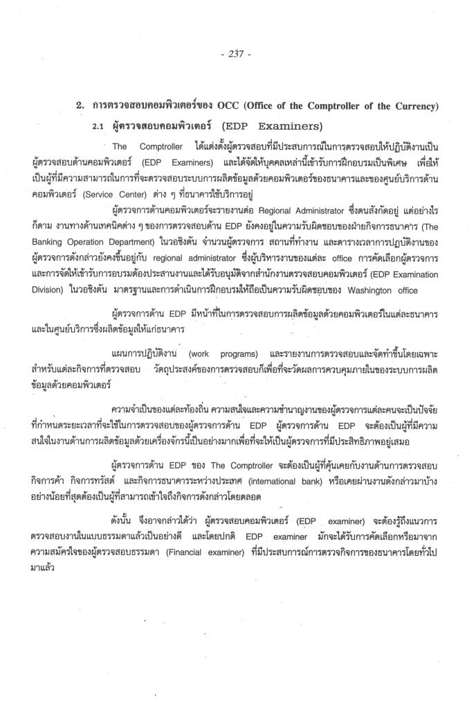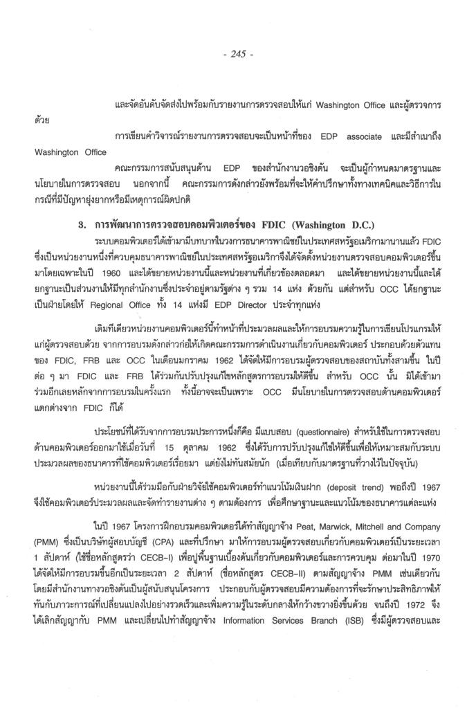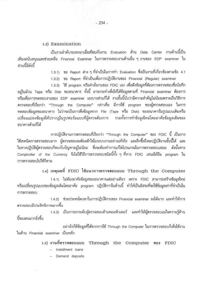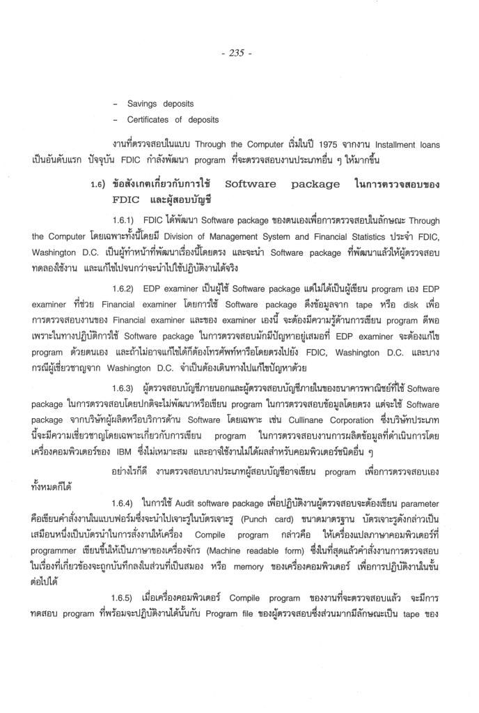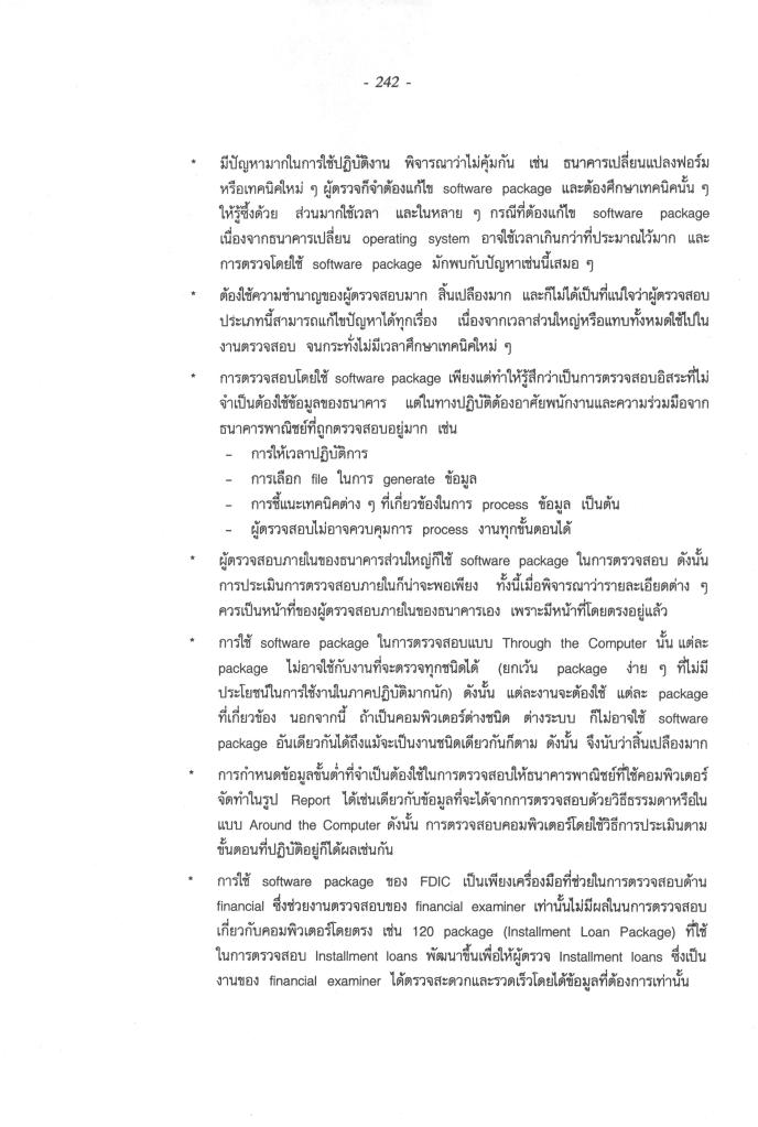 - การดําเนินงาน การบริหารงานและการตรวจสอบงานด้านคอมพิวเตอร์ก็เป็นอีกรูปแบบหนึ่งของงานที่มีความเสี่ยง ตามที่ผมได้กล่าวไว้แล้วในหนังสือชุดนี้ และเมื่อวันที่ 23 เมษายน 2540 ผมก็ได้รับข่าวสารทาง E-mail จาก Mr.David G. Rowley ซึ่งเป็นทั้งผู้ตรวจสอบและผู้บริหารอาวุโสทางด้าน IS examination จาก Federal Reserve Bank of Minneapolis, Minnesota ประเทศสหรัฐอเมริกา ขอให้จัดส่งแนวทางการจัดการและการบริหารการตรวจสอบ ตลอดจนการควบคุมของทางการ ทางด้านคอมพิวเตอร์ของประเทศไทยในปัจจุบันและในปี ค.ศ. 2000 หรือ IT 2000 ไปให้ทราบ เพื่อใช้ประกอบการบรรยายเรื่องนี้ในประเทศสหรัฐอเมริกาด้วย ในเดือนมิถุนายน 2540 เพราะ Mr.David ได้รับมอบหมายให้บรรยายให้กับผู้บริหารของ FFIEC ซึ่งประกอบไปด้วย FRB, FDIC และ OCC รวมทั้งสมาคม ผู้ตรวจสอบงานคอมพิวเตอร์ (ISACA) ภาคพื้นกรุงเทพฯ ก็จะจัดให้มีการอภิปรายในหัวข้อทํานองเดียวกันนี้ ในวันที่ 27 มิถุนายน 2540 ด้วย ทําให้ผมไม่แน่ใจว่าทางการในประเทศไทย ยังจะควรมีบทบาทในการควบคุม กํากับ ดูแล สถาบันการเงินทางด้านคอมพิวเตอร์มากน้อย หรือควรลดลงอย่างไร เพราะขณะที่ทางการของประเทศสหรัฐอเมริกา และประเทศที่พัฒนาแล้วยังให้ความสนใจในการดําเนินงานด้านคอมพิวเตอร์ของสถาบันการเงินต่าง ๆ แต่สําหรับธนาคารแห่งประเทศไทยอาจมีแนวโน้มที่จะสนใจทางด้านความเสี่ยงใหม่ ๆ ที่มีผลกระทบต่อเสถียรภาพของสถาบันการเงินอย่างอื่นที่มีความสําคัญมากกว่า อย่างไรก็ดี ผู้บริหารองค์กรที่ใช้คอมพิวเตอร์ทุกแห่งก็ควรให้ความสําคัญในเรื่องการควบคุมความเสี่ยง โดยการพัฒนา IS Audit ต่อไปอย่างไม่หยุดยั้ง