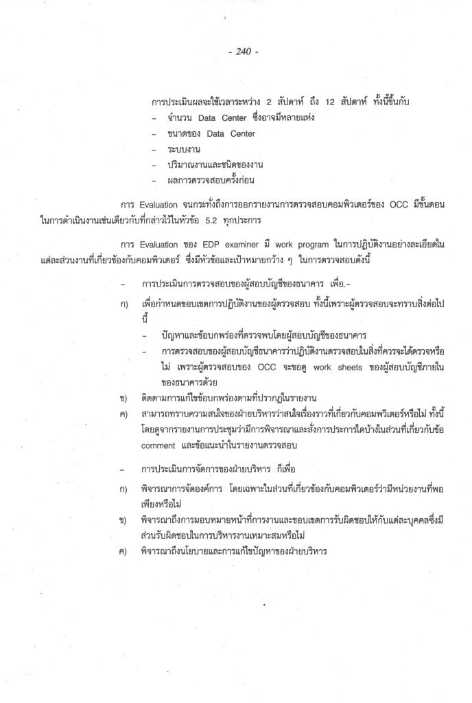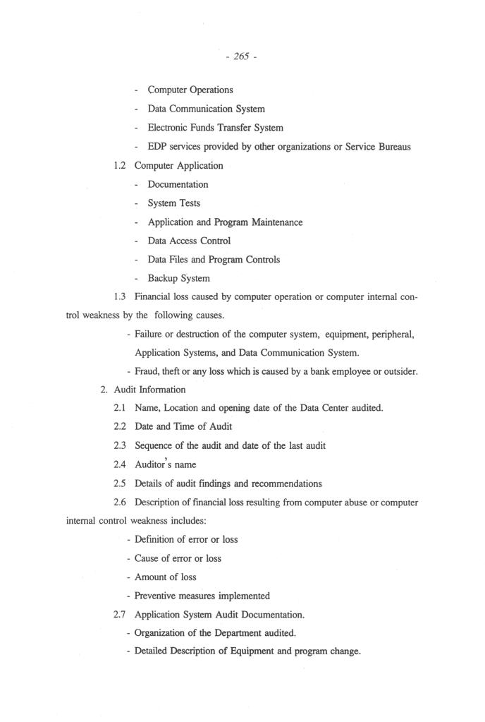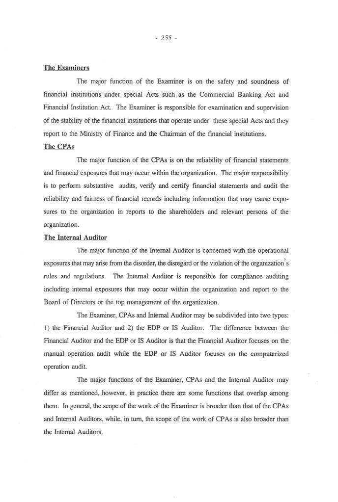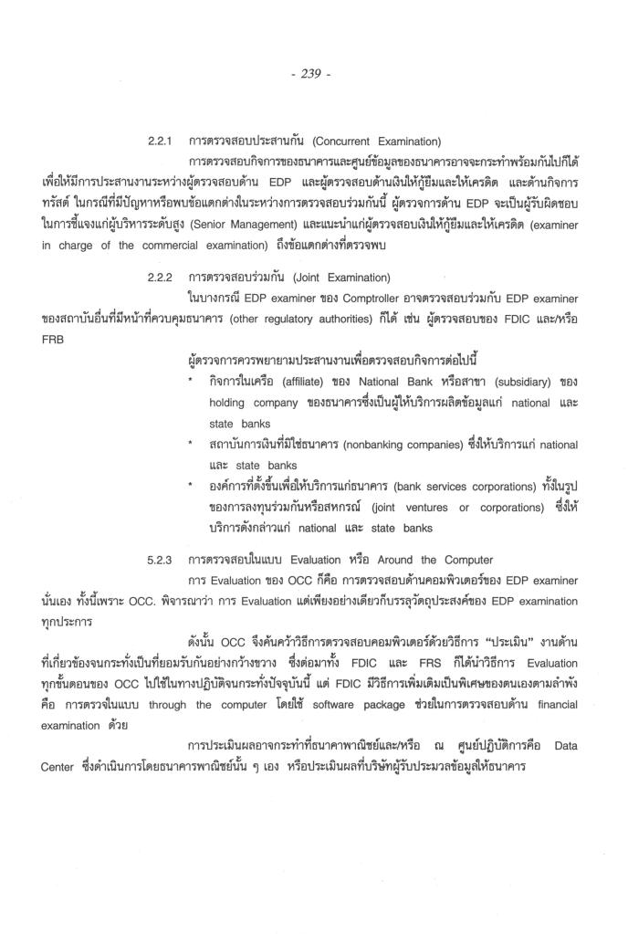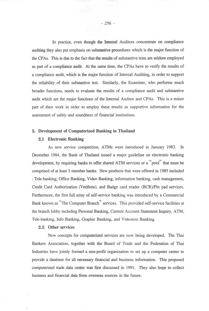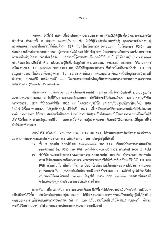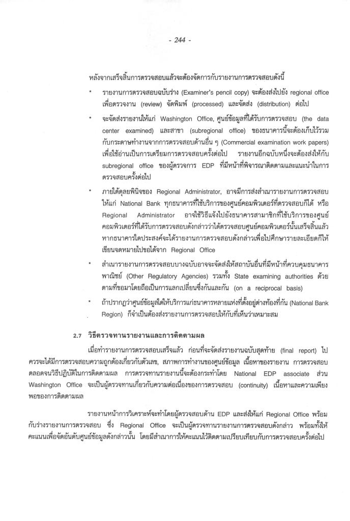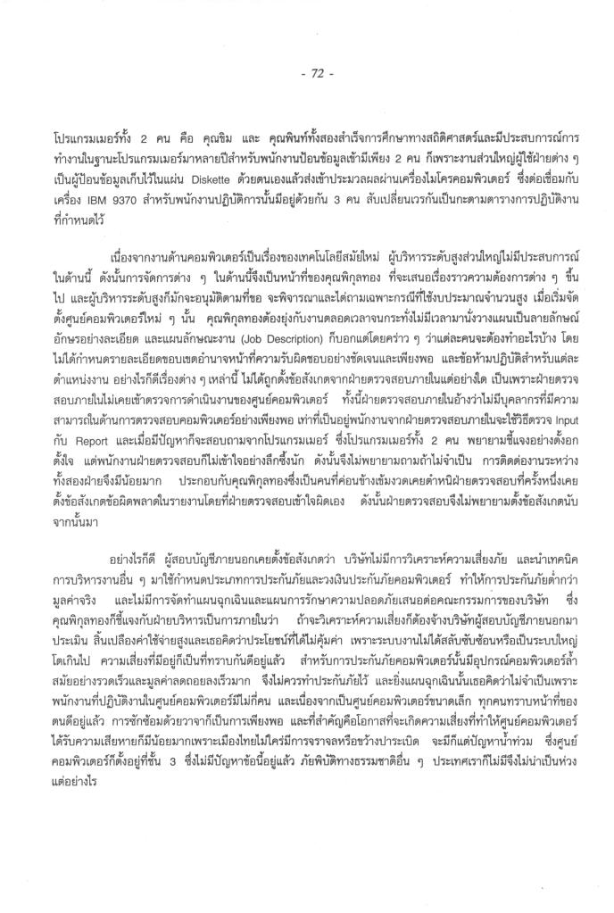 - การดําเนินงาน การบริหารงานและการตรวจสอบงานด้านคอมพิวเตอร์ก็เป็นอีกรูปแบบหนึ่งของงานที่มีความเสี่ยง ตามที่ผมได้กล่าวไว้แล้วในหนังสือชุดนี้ และเมื่อวันที่ 23 เมษายน 2540 ผมก็ได้รับข่าวสารทาง E-mail จาก Mr.David G. Rowley ซึ่งเป็นทั้งผู้ตรวจสอบและผู้บริหารอาวุโสทางด้าน IS examination จาก Federal Reserve Bank of Minneapolis, Minnesota ประเทศสหรัฐอเมริกา ขอให้จัดส่งแนวทางการจัดการและการบริหารการตรวจสอบ ตลอดจนการควบคุมของทางการ ทางด้านคอมพิวเตอร์ของประเทศไทยในปัจจุบันและในปี ค.ศ. 2000 หรือ IT 2000 ไปให้ทราบ เพื่อใช้ประกอบการบรรยายเรื่องนี้ในประเทศสหรัฐอเมริกาด้วย ในเดือนมิถุนายน 2540 เพราะ Mr.David ได้รับมอบหมายให้บรรยายให้กับผู้บริหารของ FFIEC ซึ่งประกอบไปด้วย FRB, FDIC และ OCC รวมทั้งสมาคม ผู้ตรวจสอบงานคอมพิวเตอร์ (ISACA) ภาคพื้นกรุงเทพฯ ก็จะจัดให้มีการอภิปรายในหัวข้อทํานองเดียวกันนี้ ในวันที่ 27 มิถุนายน 2540 ด้วย ทําให้ผมไม่แน่ใจว่าทางการในประเทศไทย ยังจะควรมีบทบาทในการควบคุม กํากับ ดูแล สถาบันการเงินทางด้านคอมพิวเตอร์มากน้อย หรือควรลดลงอย่างไร เพราะขณะที่ทางการของประเทศสหรัฐอเมริกา และประเทศที่พัฒนาแล้วยังให้ความสนใจในการดําเนินงานด้านคอมพิวเตอร์ของสถาบันการเงินต่าง ๆ แต่สําหรับธนาคารแห่งประเทศไทยอาจมีแนวโน้มที่จะสนใจทางด้านความเสี่ยงใหม่ ๆ ที่มีผลกระทบต่อเสถียรภาพของสถาบันการเงินอย่างอื่นที่มีความสําคัญมากกว่า อย่างไรก็ดี ผู้บริหารองค์กรที่ใช้คอมพิวเตอร์ทุกแห่งก็ควรให้ความสําคัญในเรื่องการควบคุมความเสี่ยง โดยการพัฒนา IS Audit ต่อไปอย่างไม่หยุดยั้ง