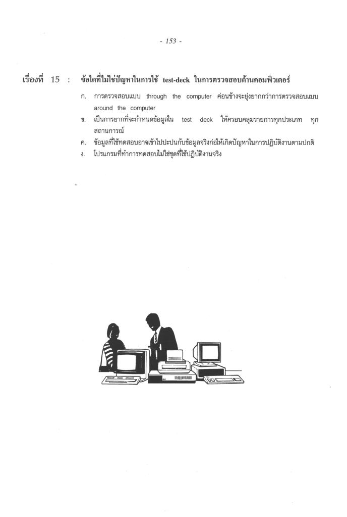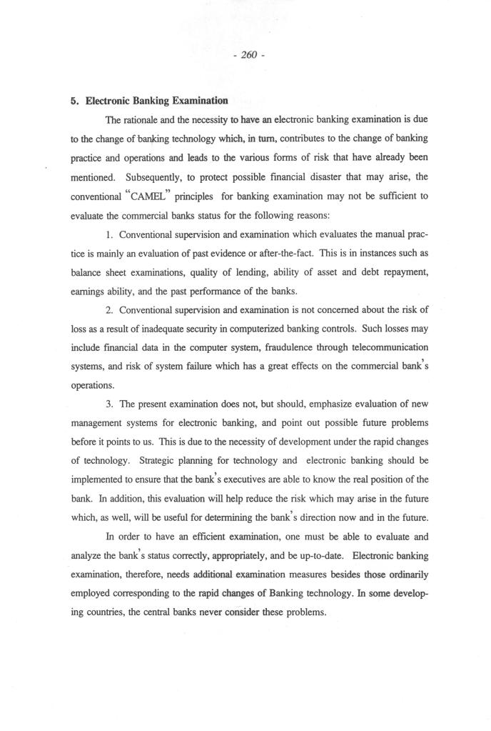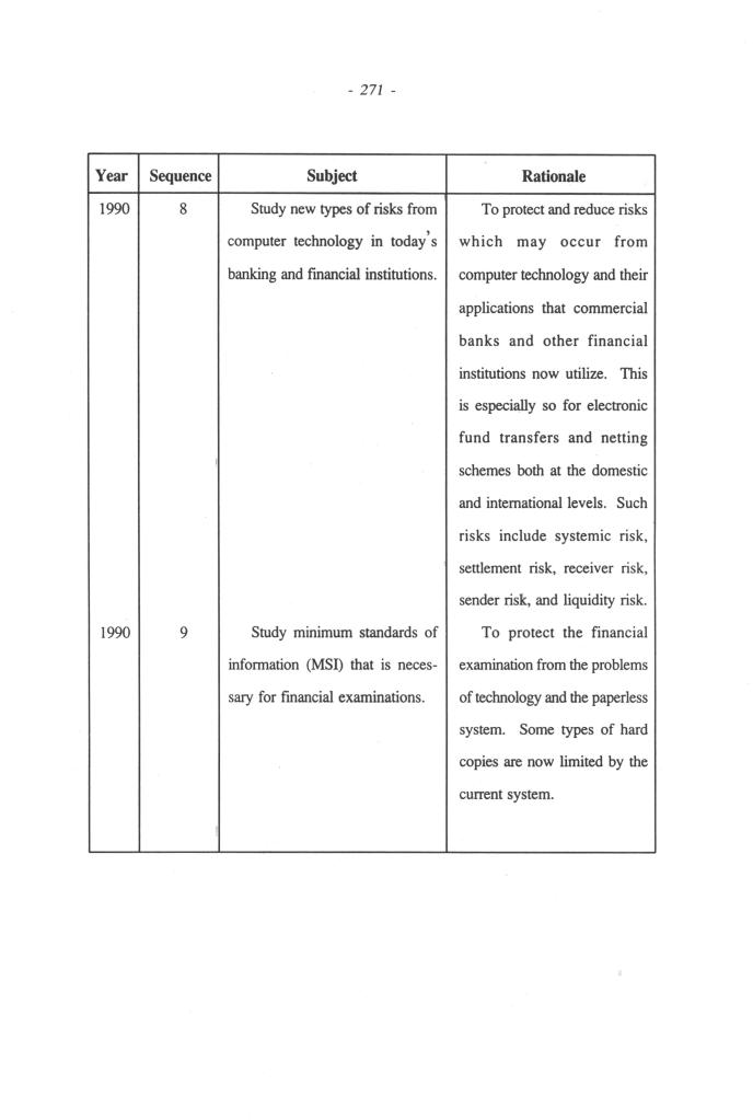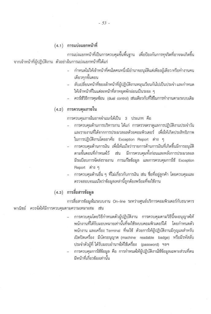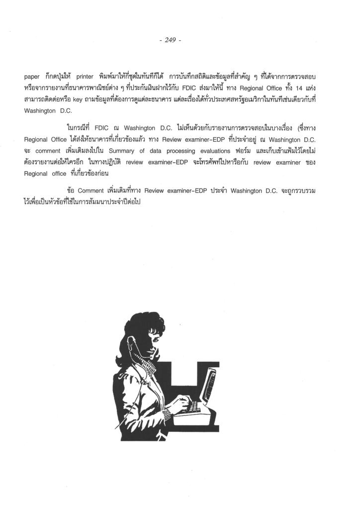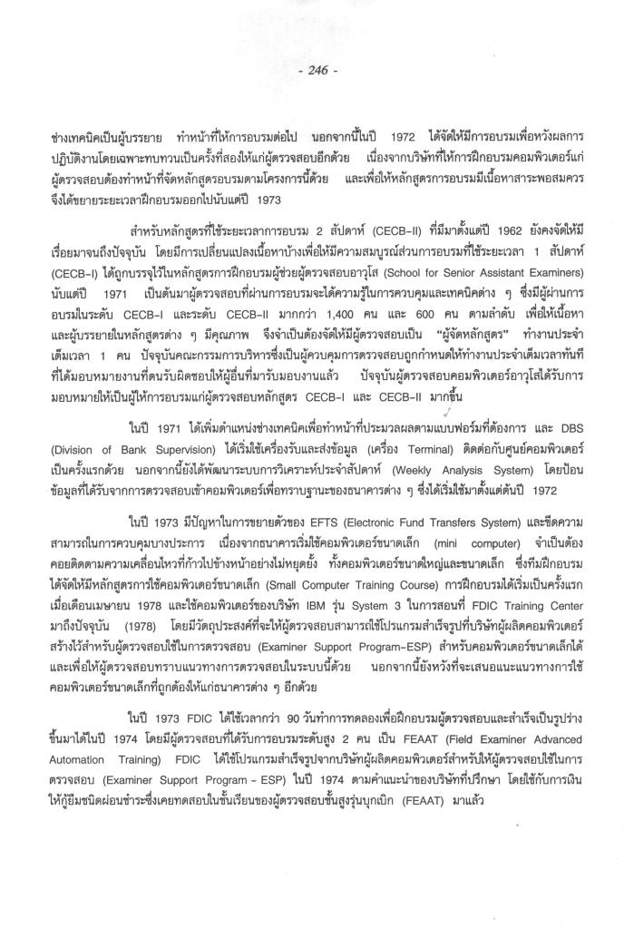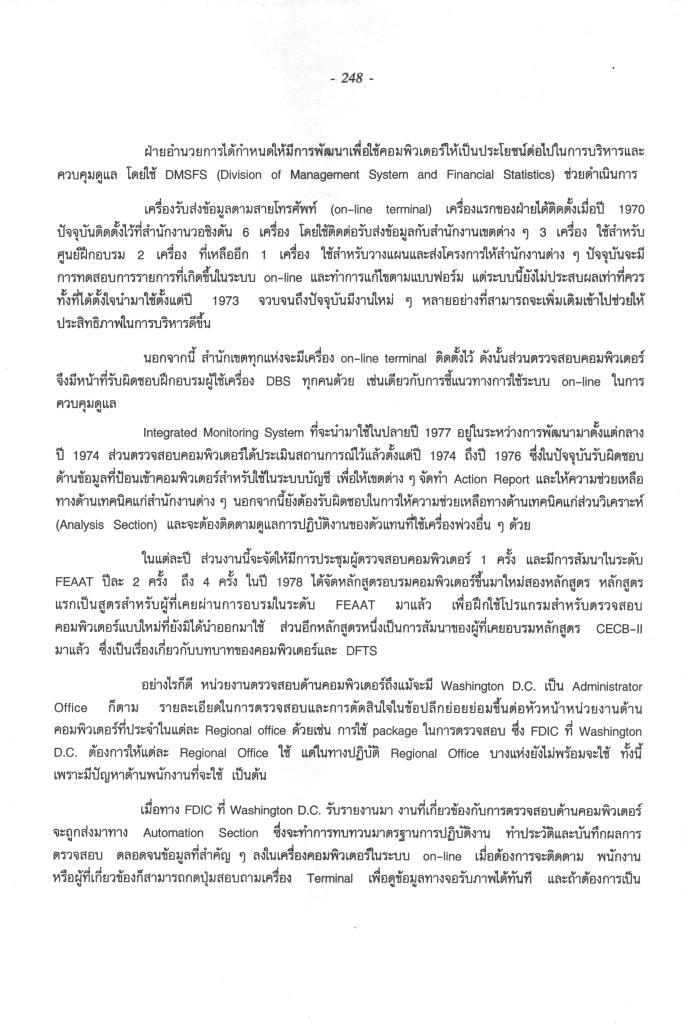 - การดําเนินงาน การบริหารงานและการตรวจสอบงานด้านคอมพิวเตอร์ก็เป็นอีกรูปแบบหนึ่งของงานที่มีความเสี่ยง ตามที่ผมได้กล่าวไว้แล้วในหนังสือชุดนี้ และเมื่อวันที่ 23 เมษายน 2540 ผมก็ได้รับข่าวสารทาง E-mail จาก Mr.David G. Rowley ซึ่งเป็นทั้งผู้ตรวจสอบและผู้บริหารอาวุโสทางด้าน IS examination จาก Federal Reserve Bank of Minneapolis, Minnesota ประเทศสหรัฐอเมริกา ขอให้จัดส่งแนวทางการจัดการและการบริหารการตรวจสอบ ตลอดจนการควบคุมของทางการ ทางด้านคอมพิวเตอร์ของประเทศไทยในปัจจุบันและในปี ค.ศ. 2000 หรือ IT 2000 ไปให้ทราบ เพื่อใช้ประกอบการบรรยายเรื่องนี้ในประเทศสหรัฐอเมริกาด้วย ในเดือนมิถุนายน 2540 เพราะ Mr.David ได้รับมอบหมายให้บรรยายให้กับผู้บริหารของ FFIEC ซึ่งประกอบไปด้วย FRB, FDIC และ OCC รวมทั้งสมาคม ผู้ตรวจสอบงานคอมพิวเตอร์ (ISACA) ภาคพื้นกรุงเทพฯ ก็จะจัดให้มีการอภิปรายในหัวข้อทํานองเดียวกันนี้ ในวันที่ 27 มิถุนายน 2540 ด้วย ทําให้ผมไม่แน่ใจว่าทางการในประเทศไทย ยังจะควรมีบทบาทในการควบคุม กํากับ ดูแล สถาบันการเงินทางด้านคอมพิวเตอร์มากน้อย หรือควรลดลงอย่างไร เพราะขณะที่ทางการของประเทศสหรัฐอเมริกา และประเทศที่พัฒนาแล้วยังให้ความสนใจในการดําเนินงานด้านคอมพิวเตอร์ของสถาบันการเงินต่าง ๆ แต่สําหรับธนาคารแห่งประเทศไทยอาจมีแนวโน้มที่จะสนใจทางด้านความเสี่ยงใหม่ ๆ ที่มีผลกระทบต่อเสถียรภาพของสถาบันการเงินอย่างอื่นที่มีความสําคัญมากกว่า อย่างไรก็ดี ผู้บริหารองค์กรที่ใช้คอมพิวเตอร์ทุกแห่งก็ควรให้ความสําคัญในเรื่องการควบคุมความเสี่ยง โดยการพัฒนา IS Audit ต่อไปอย่างไม่หยุดยั้ง
