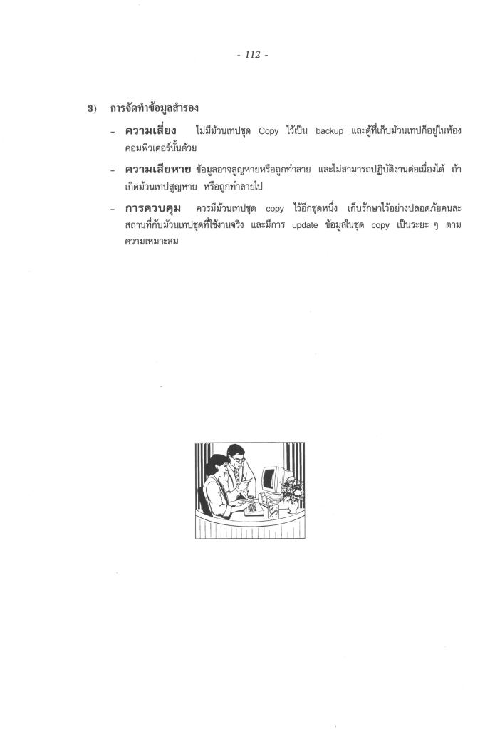 หมายถึง การจัด หรือจัดทําระบบสํารองของเครื่องคอมพิวเตอร์อุปกรณ์ประกอบระบบคอมพิวเตอร์ และระบบงานคอมพิวเตอร์ เพื่อใช้ทดแทนการทํางานเมื่อระบบคอมพิวเตอร์ที่ใช้งานตามปกติขัดข้องหรือเสียหายใช้การไม่ได้ - การรวบรวมและเรียบเรียงหนังสือทั้ง 4 เล่ม ใช้เวลาไม่น้อย ทั้ง ๆ ที่หนังสือดังกล่าวเกิดจากการรวบรวม เรื่องราวที่ผมได้แจกเป็นเอกสารประกอบการบรรยาย และจากการศึกษาให้กับสถาบันต่าง ๆ ในอดีต ตามที่กล่าวไว้แล้วในเล่มก่อน ๆ อย่างไรก็ดี การพิมพ์ใหม่ทําให้ต้องใช้เวลาตรวจทาน รวมทั้งเขียนเรื่องเพิ่มเติมโดยเฉพาะในเล่มที่ 3 ค่อนข้างมาก และเล่มที่ 4 ซึ่งเป็นเล่มที่ผมพิจารณาว่าน่าจะเป็นประโยชน์ต่อผู้ที่สนใจไม่ว่าจะเป็นผู้บริหาร ผู้พัฒนา ระบบงาน และผู้ตรวจสอบทุกประเภท เพราะส่วนใหญ่ในเรื่องที่เกี่ยวกับตัวอย่างจุดอ่อนในระบบงานด้านคอมพิวเตอร์ ไม่ได้เกิดจากการแปลหรือเรียบเรียงจากหนังสือต่างประเทศตามปกติเท่านั้น แต่ได้ผสมผสานแง่คิดหลาย ๆ ประการ ทั้งในภาคสนามและประสบการณ์ที่ผู้ที่เกี่ยวข้องสามารถประยุกต์ใช้เป็นแนวทางป้องกันจุดอ่อน รวมทั้งการทุจริตได้ล่วงหน้าก่อนปัญหาจะเกิดขึ้นจริง ดังที่เคยกล่าวแล้วว่า “Point to the problem before it points to us” นั่นคือ ผู้บริหารควรเข้าใจและรู้ถึงประเด็นปัญหาที่อาจเกิดขึ้นกับองค์กร แล้วหาทางแก้ไขก่อนที่ปัญหานั้นจะกลับมาทําความเสียหายให้องค์กรของตนเอง