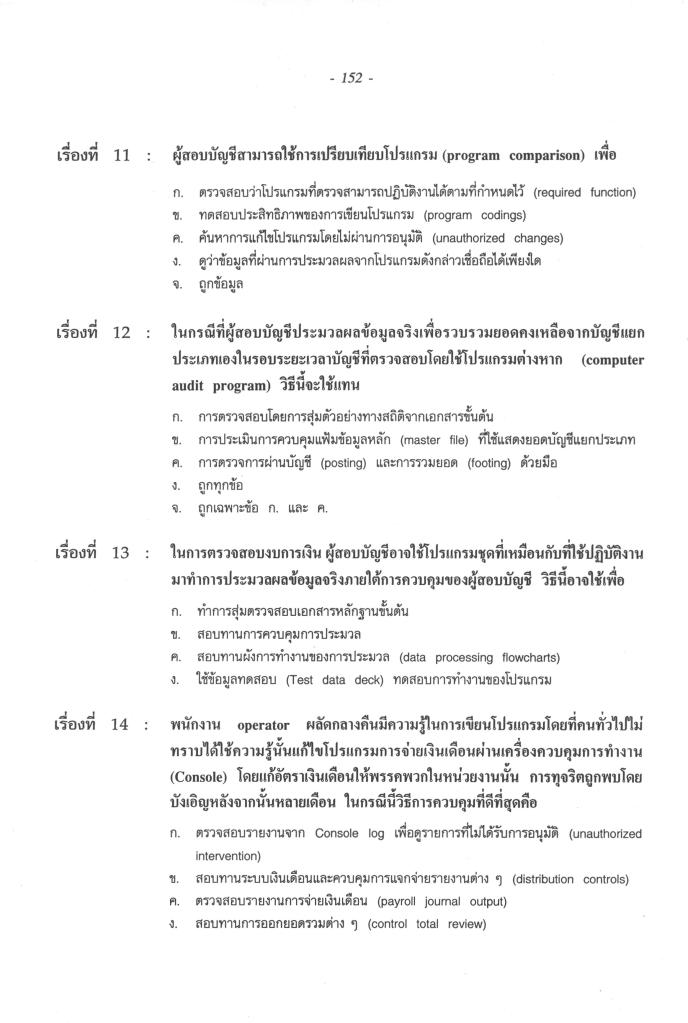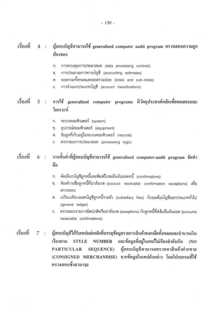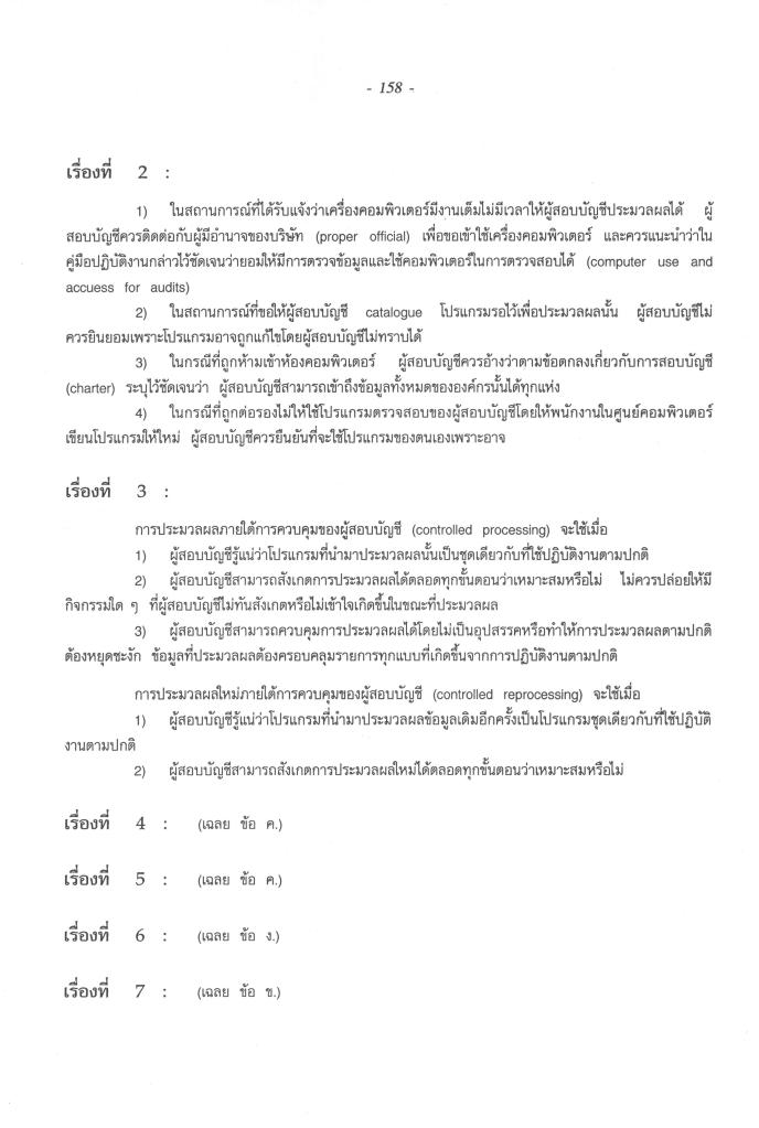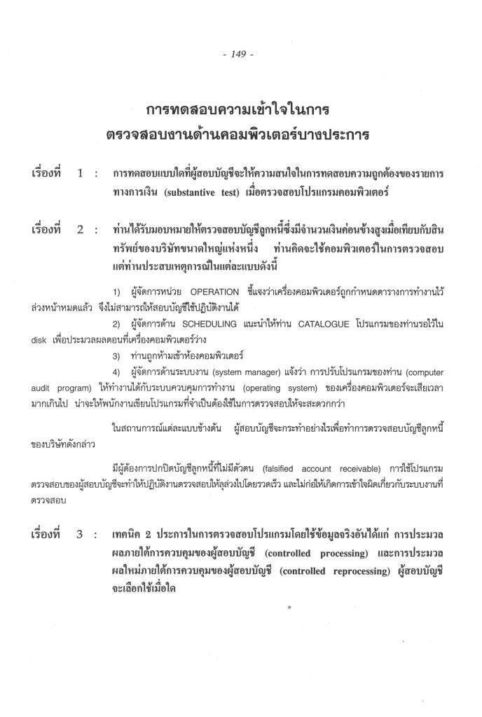 การศึกษาและแลกเปลี่ยนข้อมูลที่น่าสนใจจากการปฏิบัติงานภาคสนาม ซึ่งผมก็ได้ทําตามคําแนะนําของท่านผู้อ่านแล้ว ดังปรากฏข้อมูลในตอนท้ายของเล่มนี้แล้ว - หนังสือเรื่องนี้ทั้ง 4 เล่ม อาจสรุปให้ชัดเจนได้ไม่ง่ายนัก เพราะขึ้นกับว่าท่านอยู่ในฐานะอย่างไรในองค์กร กล่าวคือท่านเป็นผู้บริหาร หรือผู้พัฒนาระบบงานหรือผู้ตรวจสอบ และเป็นผู้ตรวจประเภทใด ดังนั้นพื้นฐานก็คงจะอยู่ กับตัวแปรดังกล่าวเป็นสําคัญ รวมทั้งมาตรฐานขององค์กรที่เกี่ยวข้องด้วย เพราะในทางปฏิบัติมีแนวการพิจารณาในเรื่องนี้แตกต่างกันมาก ในแต่ละองค์กรหรือแม้แต่องค์กรเดียวกัน ในแต่ละหน่วยงานที่เกี่ยวข้อง แต่สิ่งหนึ่งที่ควรจะเหมือนกันหรือคล้ายกันก็คือ ความรู้ ความตั้งใจจริง และความเข้าใจ ในแนวทางปฏิบัติของผู้บริหารในสภาวะแวดล้อมขององค์กรที่ใช้คอมพิวเตอร์ ที่ได้เปลี่ยนแปลงไปมากมาย จากการพัฒนาเทคโนโลยีที่ไม่หยุดยั้ง และมีผลกระทบต่อความเสี่ยง วิธี การควบคุม วิธีการตรวจสอบ และทักษะของผู้ตรวจสอบที่เกี่ยวข้องอยู่ตลอดเวลา และที่สําคัญที่สุดก็คือการที่คอมพิวเตอร์ มีผลกระทบต่อแนวทางการตรวจสอบ หลักฐานการตรวจสอบ ฯลฯ และความน่าเชื่อถือได้ของข้อมูลทางการเงิน ที่ใช้ในการตรวจสอบฐานะที่แท้จริงของสถาบันการเงิน ที่ผู้บริหารในองค์กรที่ใช้คอมพิวเตอร์ทุกแห่งควรให้ความสนใจ