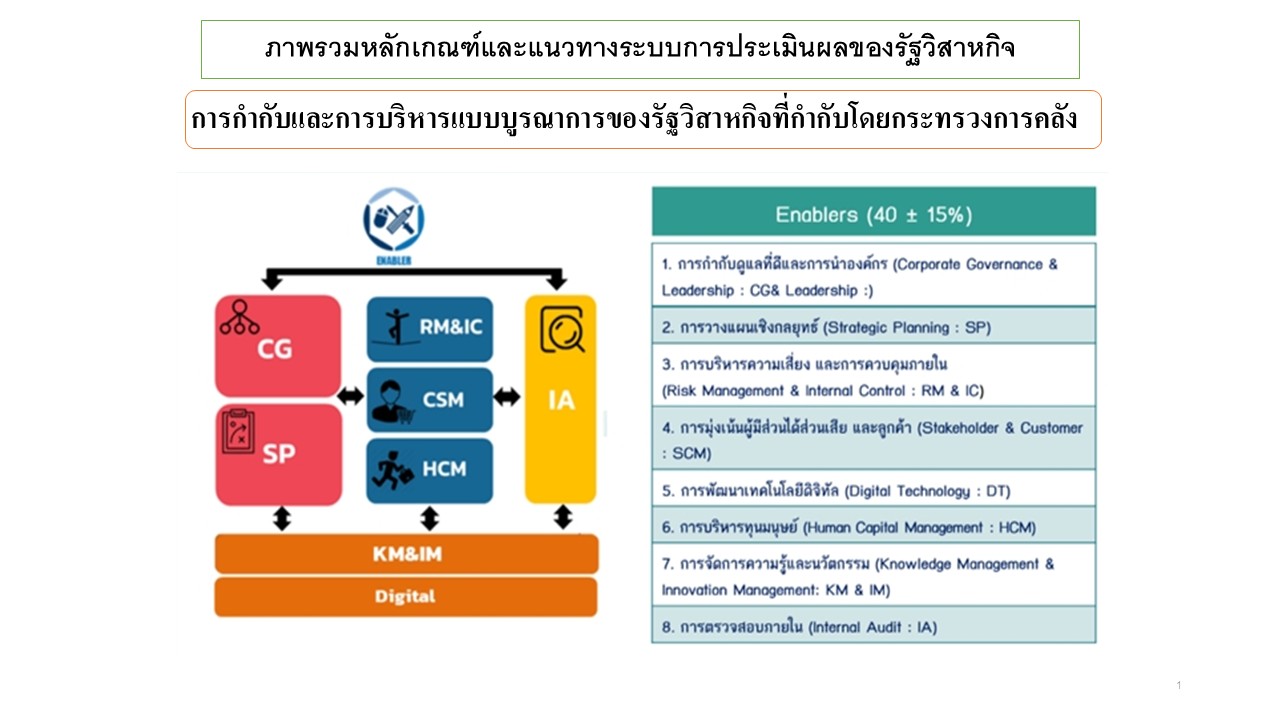 อย่างไรก็ดี Core Business Enablers ในการที่หน่วยงานกำกับใช้เป็นกรอบในการประเมินผลการดำเนินงานรัฐวิสาหกิจนั้น ยังไม่ได้รวมมาตรฐานที่เกี่ยวข้องกับการปฏิบัติตามกฎหมาย กฎเกณฑ์ ทั้งภายในประเทศและภายนอกประเทศ ที่มีผลอย่างสำคัญยิ่งต่อรัฐวิสาหกิจที่ควรจะปฏิบัติตาม หลักการ Governance และ Management ที่มีผลไปถึง Performance และ Conformance ของรัฐวิสาหกิจ ที่มีผลสะท้อนไปยังยุทธศาสตร์ชาติ นโยบายรัฐบาล และแผนยุทธศาสตร์ของรัฐวิสาหกิจ ฯลฯ