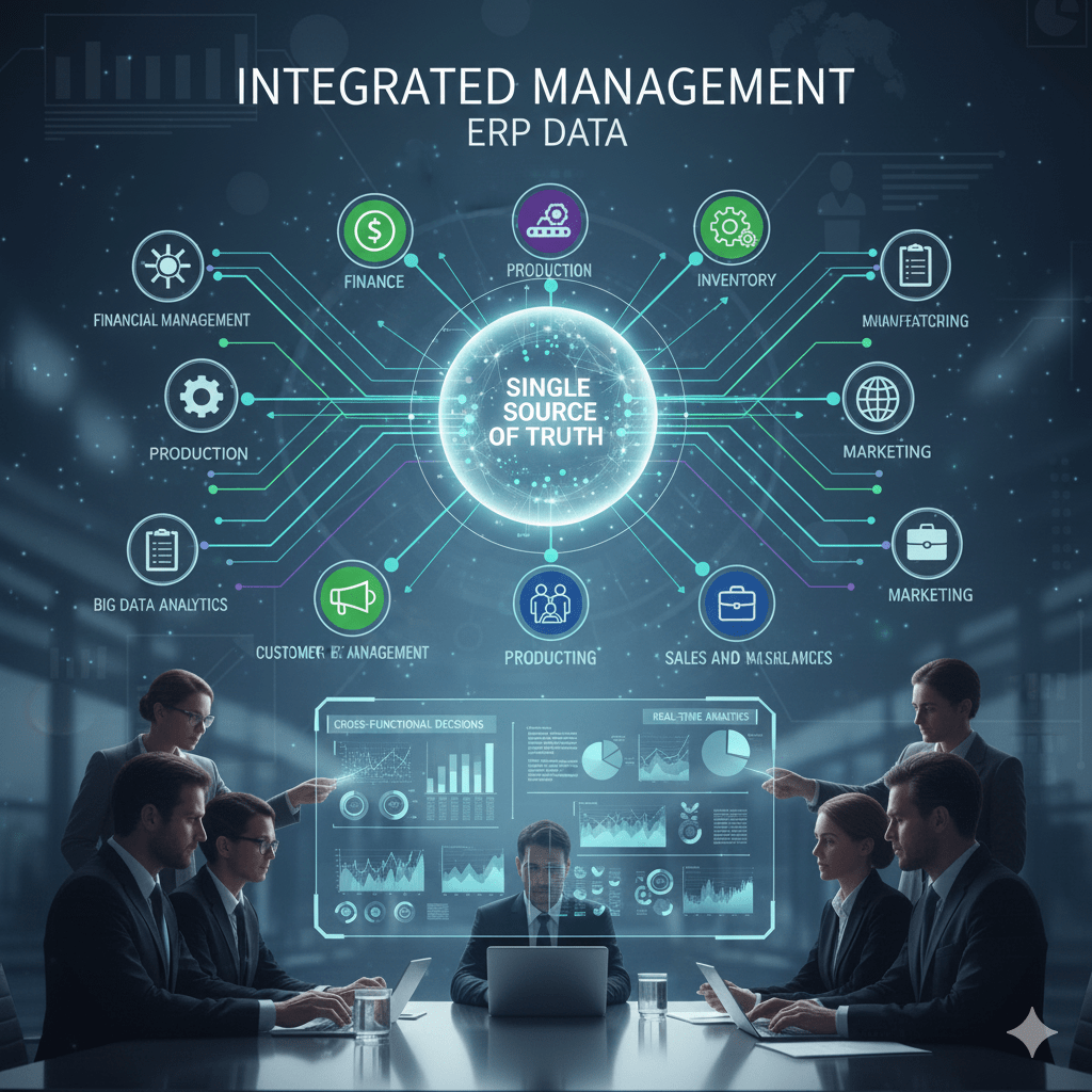 เมื่อ Algorithm ทำงานได้อย่างสมบูรณ์ในการทำให้ Data มีความถูกต้องและเกี่ยวพันกันในทุกมิติ ข้อมูลทั้งหมดจะรวมกันเป็น Single Source of Truth ที่ปราศจากข้อขัดแย้ง นี่คือพลังของการบริหารแบบบูรณาการ (Integrated Management) ที่ผู้บริหารไม่จำเป็นต้องรอการรวบรวมข้อมูลจากหลายฝ่ายหรือหลายบริษัทอีกต่อไป ทุกสายงานสามารถใช้ Dashboard ชุดเดียว ในการตัดสินใจข้ามฟังก์ชัน (Cross-Functional Decisions) ตัวอย่างเช่น: การใช้ข้อมูลการผลิต (จากโมดูล Production) และข้อมูลการเงิน (จากโมดูล Finance) มาวิเคราะห์ต้นทุนการผลิตแบบ Real-time เพื่อกำหนดราคาสินค้าเชิงกลยุทธ์ได้อย่างรวดเร็ว