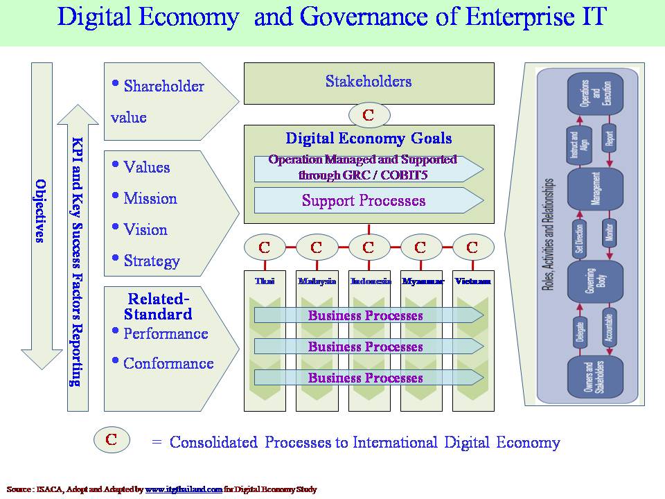 การที่ภาครัฐในฐานะผู้กำกับและผู้ผลักดันสำคัญในโครงการเศรษฐกิจดิจิตอล จึงเห็นควรประเมินความเหมาะสมของกลยุทธ์ Digital Economy – DE ที่เราใช้อยู่ในปัจจุบันว่ามีความเหมาะสม สอดคล้องกับสภาพแวดล้อม สอดคล้องกับความต้องการของผู้มีส่วนได้เสีย มีมาตรฐาน และกรอบการดำเนินงานที่สัมพันธ์กับเป้าหมายระดับประเทศตามนโยบายเศรษฐกิจดิจิตอล ที่มีการถ่ายทอดไปยังเป้าหมายเกี่ยวกับไอที และกระบวนการทางไอทีที่แน่นอนว่า จะต้องถ่ายทอดไปยังปัจจัยเอื้อต่าง ๆ ที่ก่อให้เกิดความสำเร็จ ตามโครงการและนโยบายเศรษฐกิจดิจิตอลที่ควรกำหนดเป็นกรอบการดำเนินงานที่ชัดเจน และควรกำหนดบทบาท กิจกรรม และความสัมพันธ์ของการกำกับดูแล ซึ่งควรระบุว่าใครหรือหน่วยงานใดมีส่วนร่วมในการกำกับดูแลและกระบวนการมีส่วนร่วมนั้น มีส่วนร่วมอย่างไร และมีบุคคลใด หรือใคร ควรทำอะไร และควรมีการปฏิสัมพันธ์กันอย่างไร ในทุกระดับของกระบวนการกำกับดูแลกิจการที่ดี ภายใต้กรอบและขอบเขตของระบบงานทางด้าน Digital Economy สำหรับการกำกับดูแลและการบริหารจัดการไอที